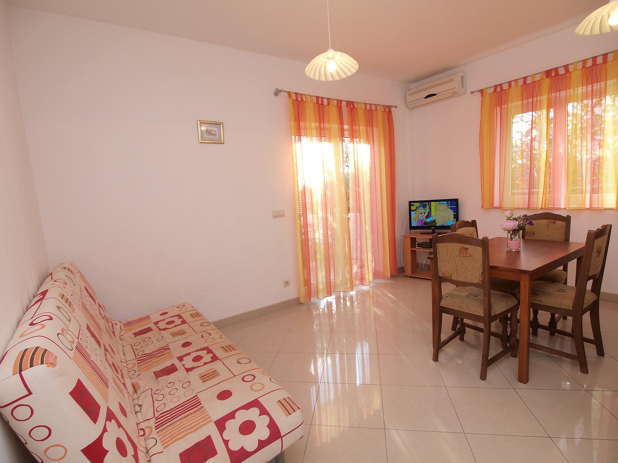 2-room apartment 35 m2, on the ground floor, south facing position. Beautiful and cosy furnishings: living/dining room with 1 double sofabed (130 cm, length 200 cm), satellite TV (flat screen), air conditioning. Exit to the terrace. 1 room with 1 double bed (2 x 80 cm, length 200 cm). Open kitchen (2 hot plates, oven, freezer). Shower/WC. No heating option. Terrace 8 m2. Terrace furniture. Facilities: Internet (WiFi, free).