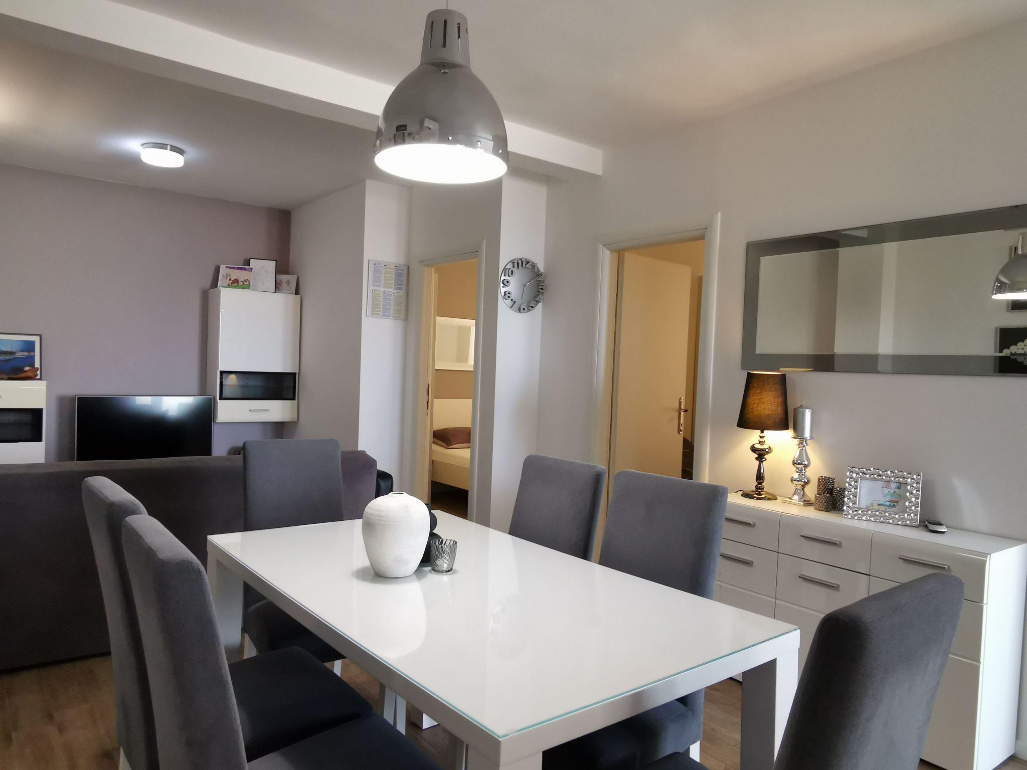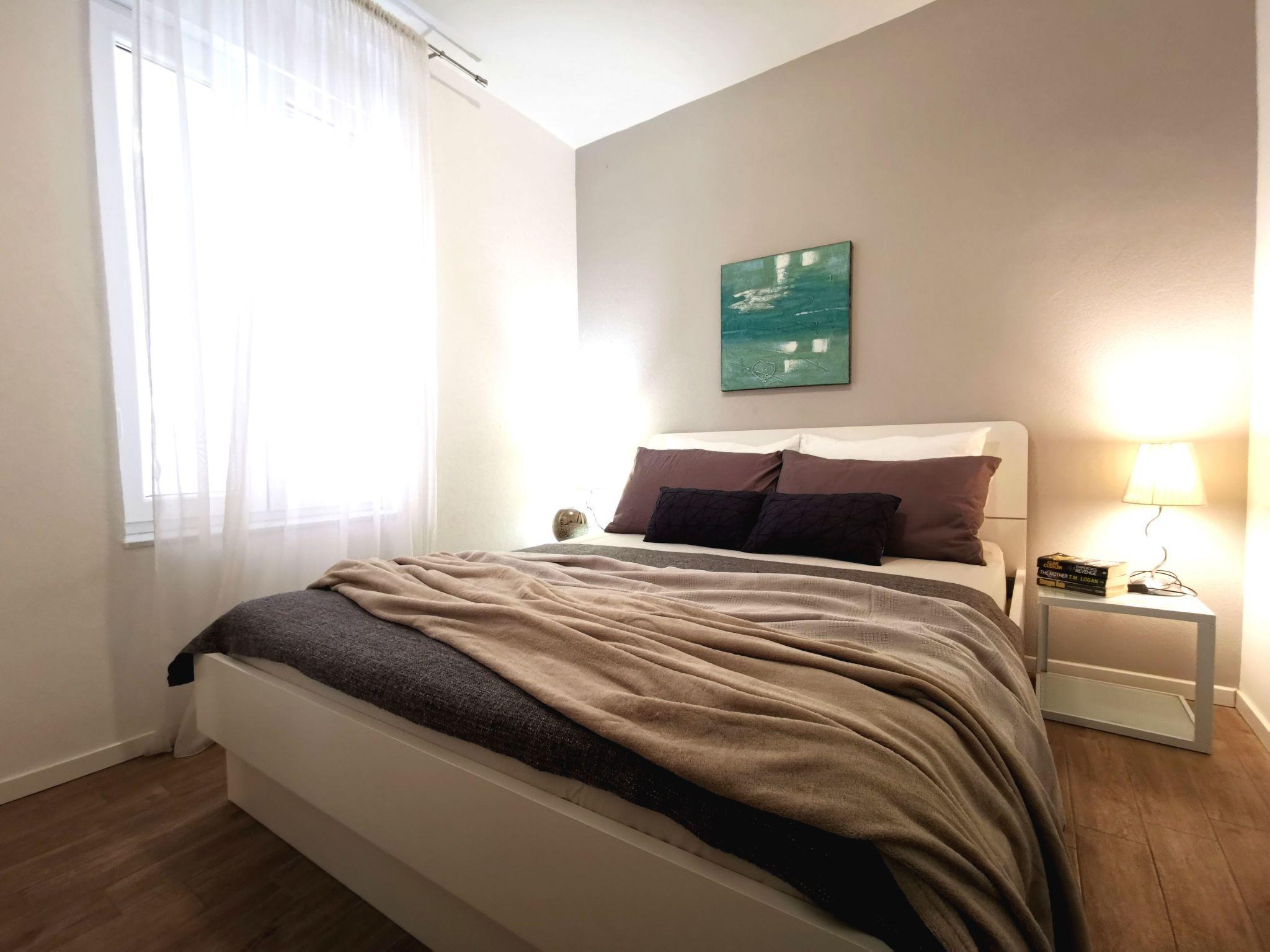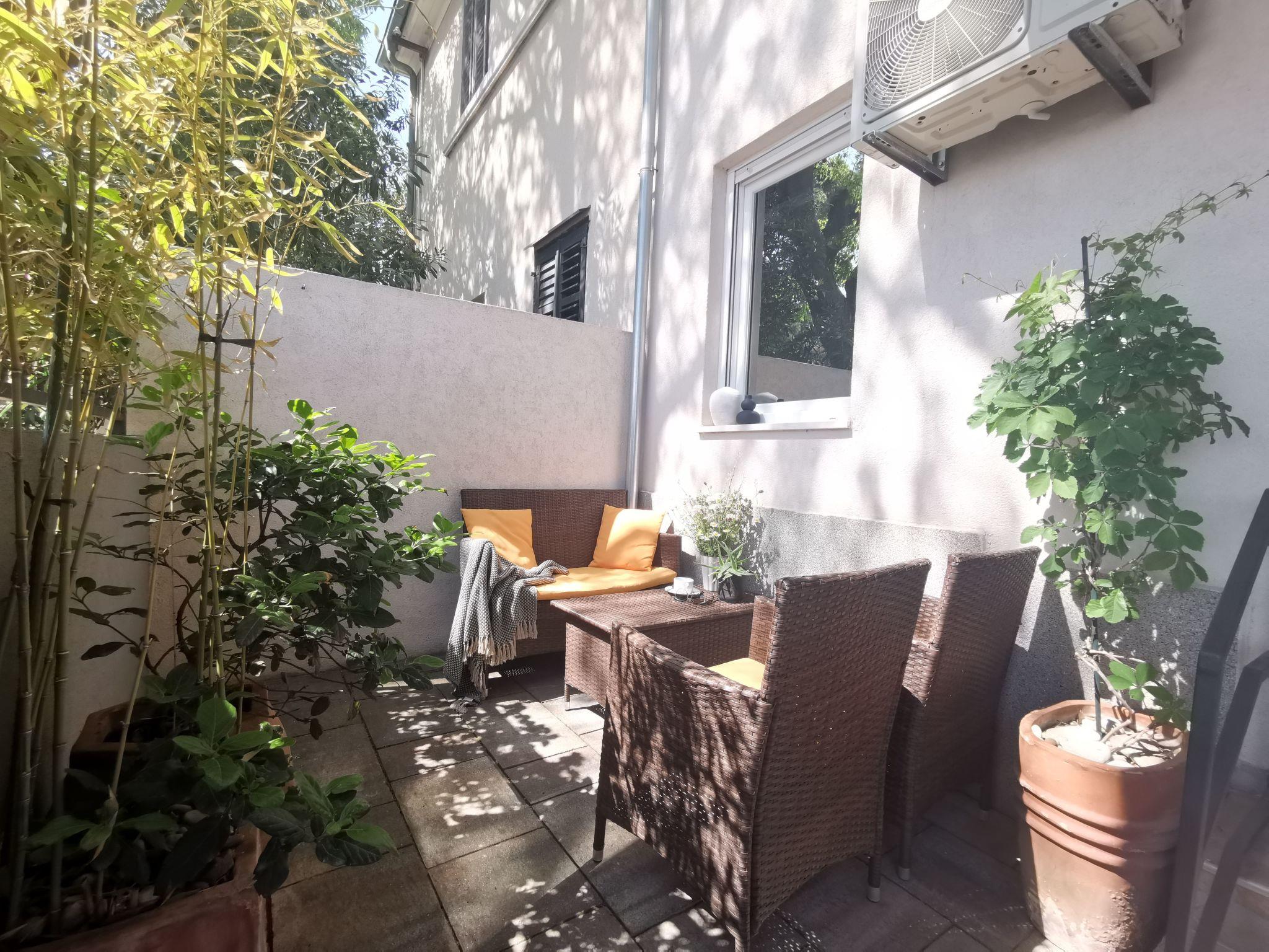 Apartment has a 2 bedrooms with double beds, living room with flatscreen TV with satellite programs with dining room and fully equipped sea view kitchen. Bed linen is provided and the beds are already made on arrival.There is also bathroom with shower cabine, toilet with toilet paper, soap. Washing machine is in laundry (option, paymnet). This apartment has large terrace with garden furniture and Mediterranean plants. Villa has private parking space and for 1 apartment is reserved 1 parking space.