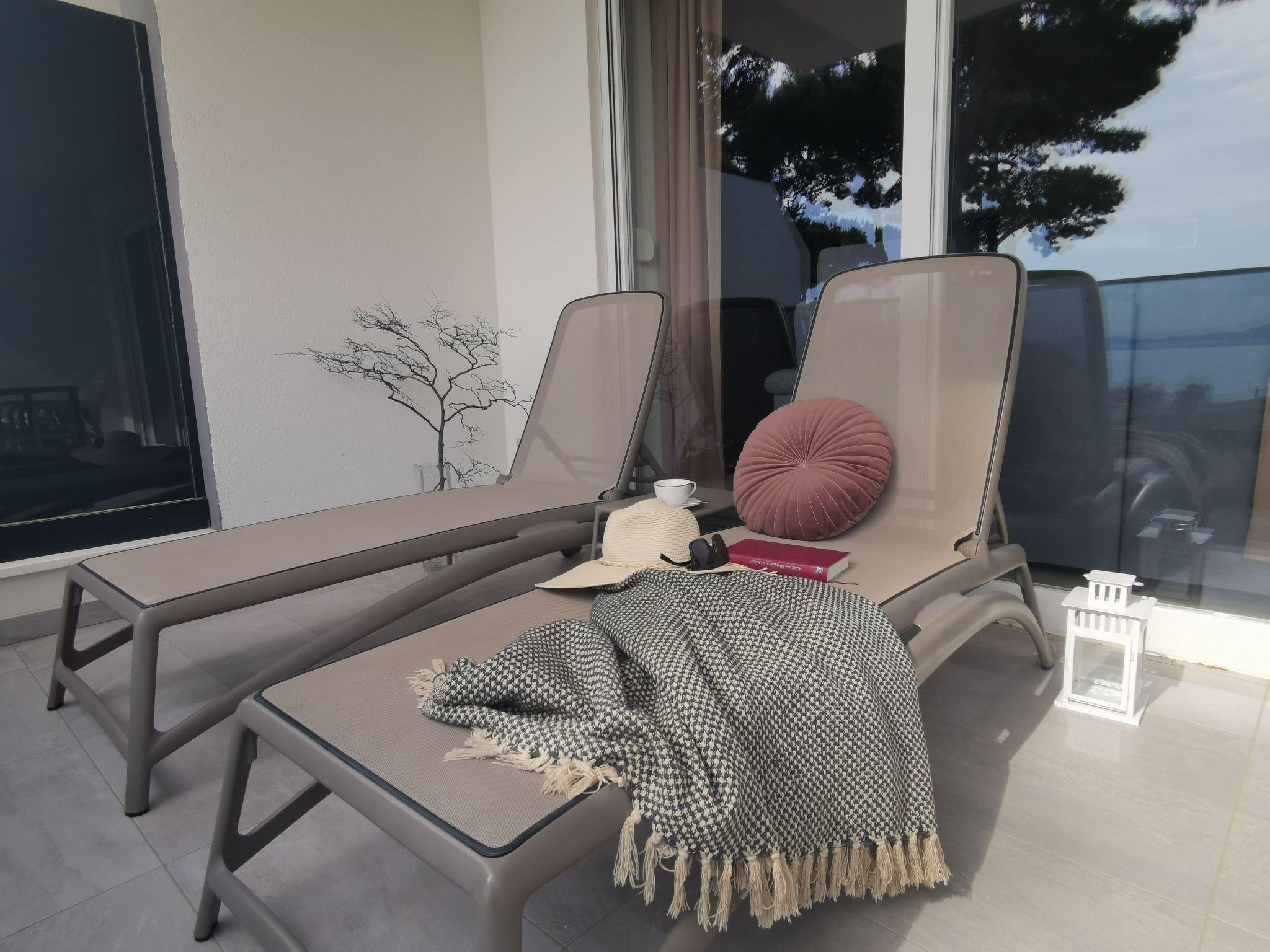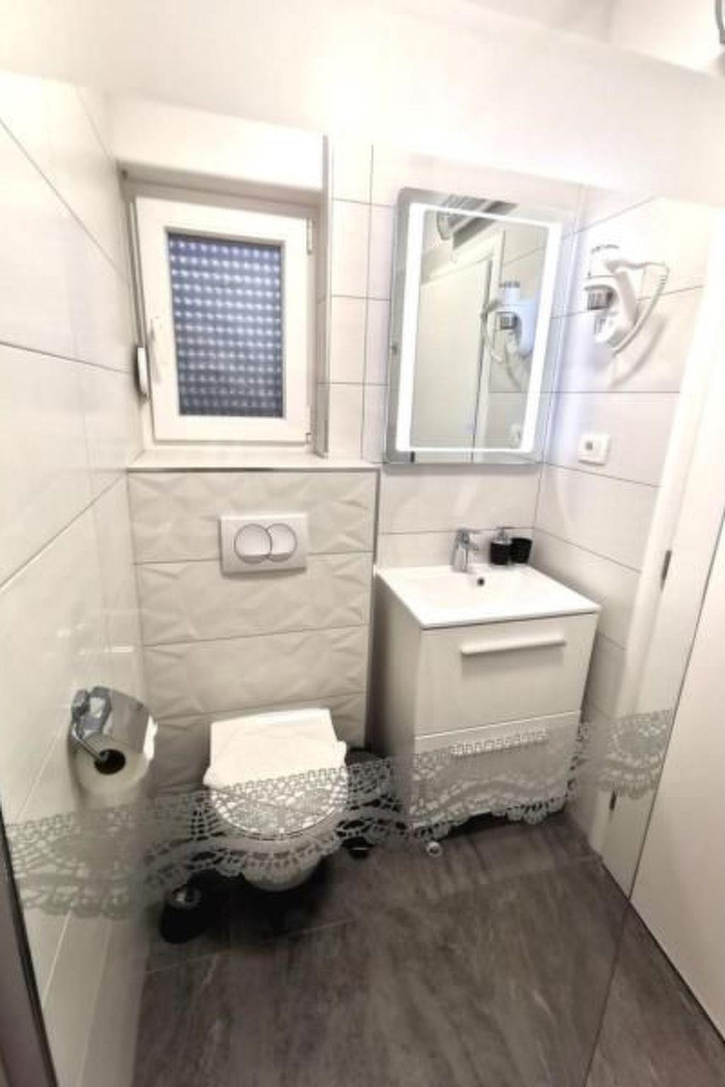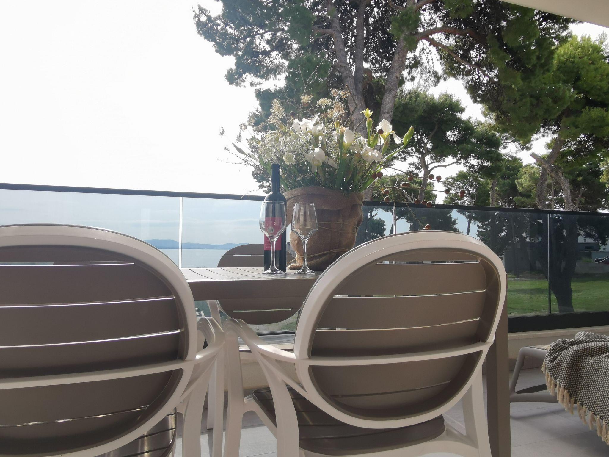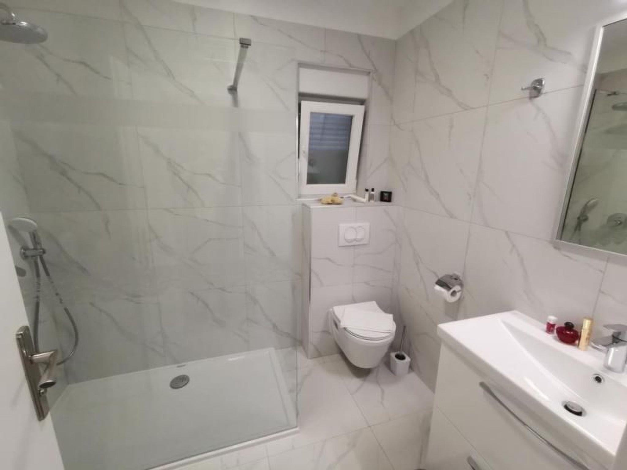 This unique flat is on I. floor, sea view terrace, 2 bedrooms with double beds, a living room with a flat screen TV with satellite channels, a dining room and a fully equipped kitchen with sea view. Bed linen is provided and the beds are already made. There are also 2 bathrooms with shower cabin, toilet with toilet paper and soap. Washing machine is in the bathroom. This flat has a large terrace with garden furniture.