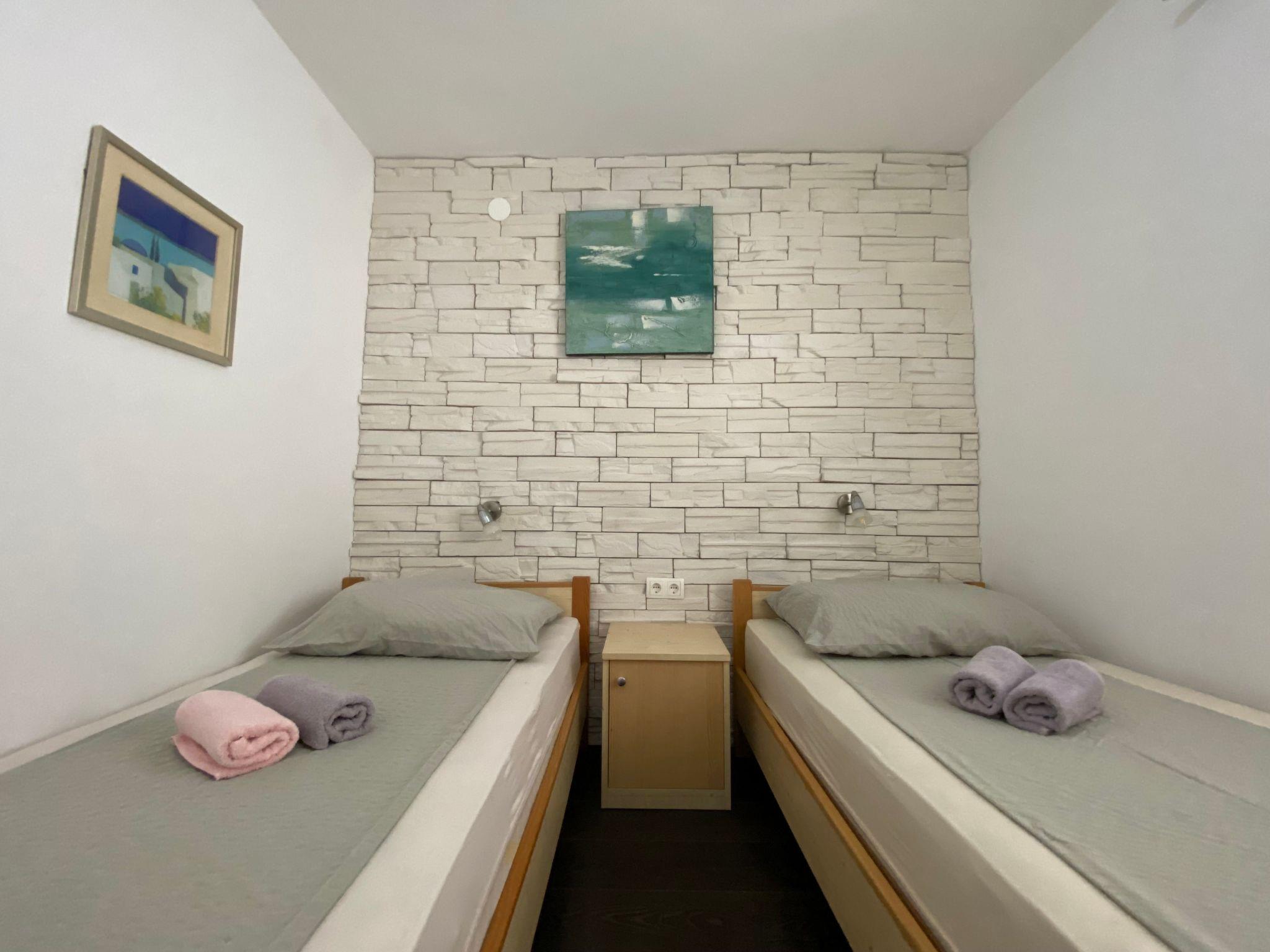 Inside, you will find comfortably furnished flats with thoughtful details to make your stay as pleasant as possible. Each flat has a separate bedroom with a double bed and a second room with two single beds, a bathroom/WC and a large living room with a sofa bed (approx. 150x200 cm). The kitchens are fully equipped with basic cooking utensils, an oven, fridge, freezer and hob to enable you to self-cater in a class of its own. In addition, each flat is air-conditioned, with the thick stone walls of the house ensuring a comfortable room temperature.