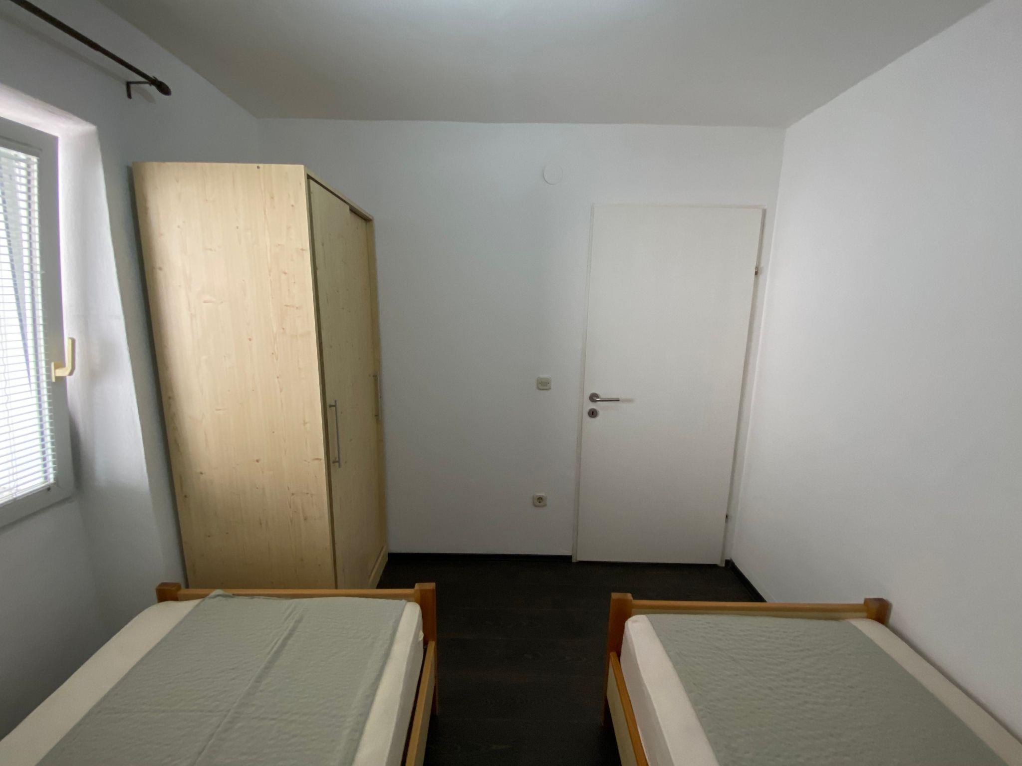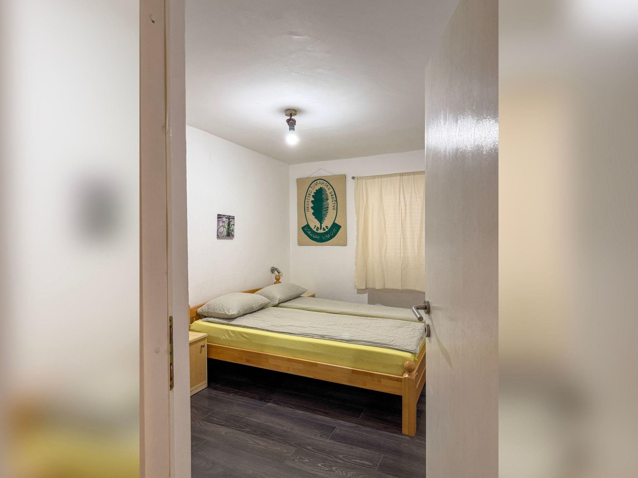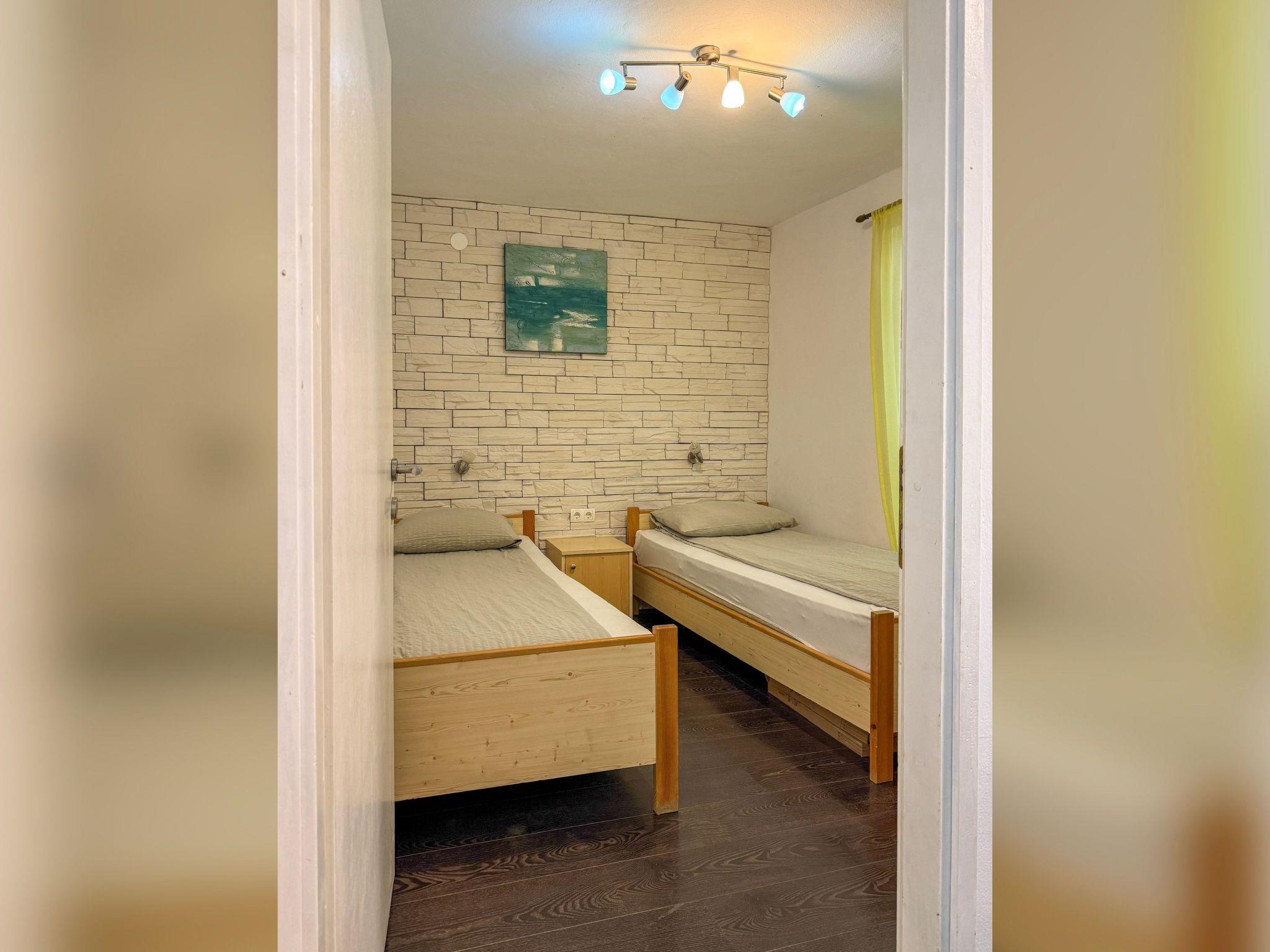 The flat has a separately accessible bedroom with a double bed and another bedroom with two single beds, a bathroom/WC and a spacious living room with a sofa bed offering additional sleeping space of approx. 150 x 200 cm. The kitchen is equipped with all the basic cooking utensils as well as an oven, fridge, freezer and hob so that you can feel completely at home during your stay. There is a table and chairs right outside the flat for cosy outdoor dining.