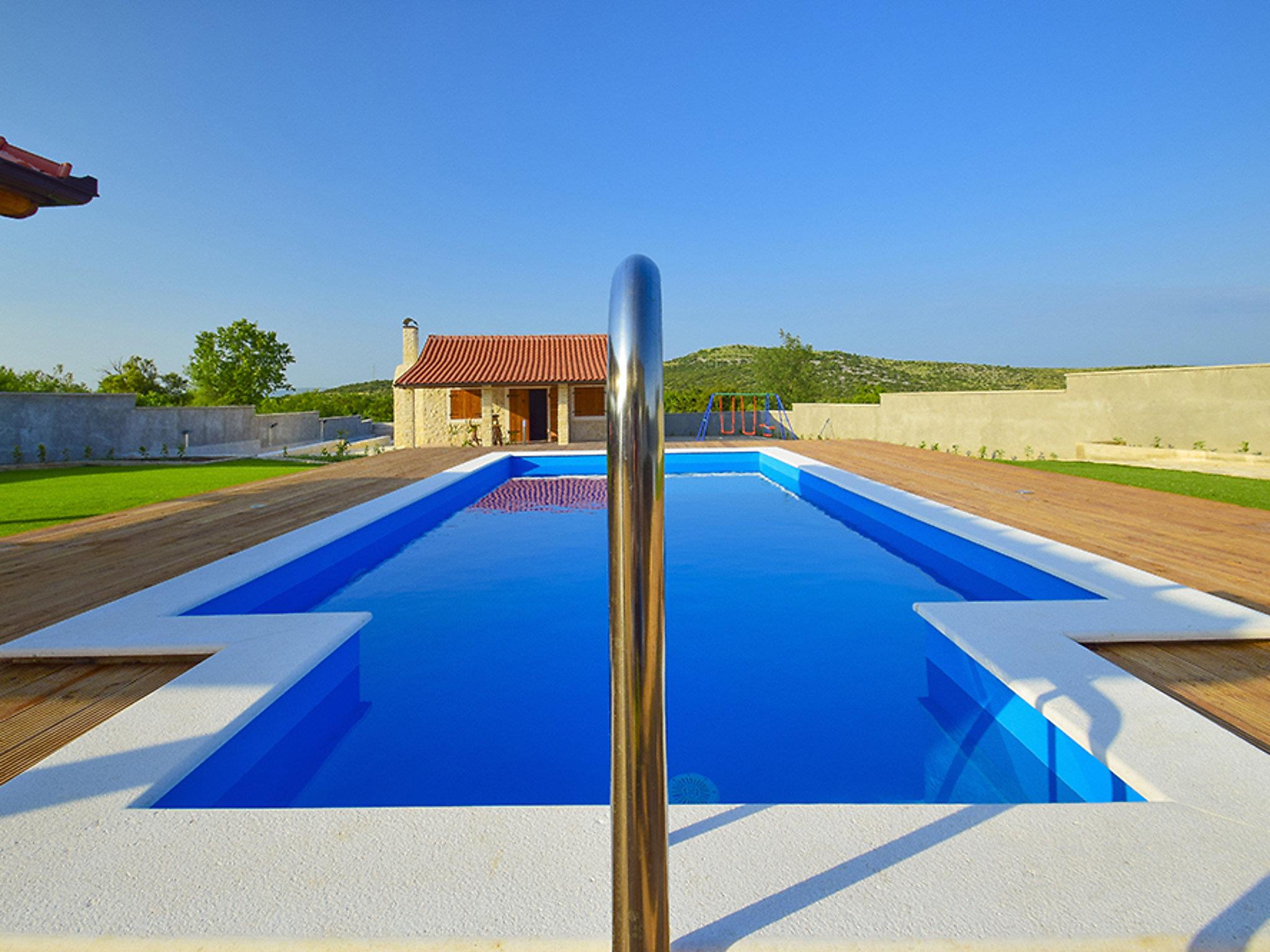 Single-family house "Julija", 2 storeys. In the hamlet Grabovci 11 km from the centre of Vodice, in a sunny position, 8 km from the sea, located by a road. Private: property 3'500 m2 (fenced) with lawn 100 m2, swimming pool angular (25 m2, depth 140 cm, seasonal availability: 01.May. - 15.Oct.). Outdoor shower, pool house with fridge, WC and cooking stove, table tennis, boules, arbour (20 m2), terrace (80 m2), garden furniture, barbecue, children's playground (slide, swing). In the house: internet access, sauna, hot tub, table football, central heating system, washing machine. Available: boat (extra). Room cleaning on request (extra). Airport transfer (extra). Roofed, parking (for 3 cars) at the house on the premises. Shop 10 km, restaurant 8 km, bus stop 9 km, pebble beach 12 km, public bathing area 12 km. Cycle lane 6 km. Nearby attractions: NP Krka 30 km. Well-known lakes can easily be reached: Vransko jezero 20 km. On request: airport transfer to the holiday accommodation.