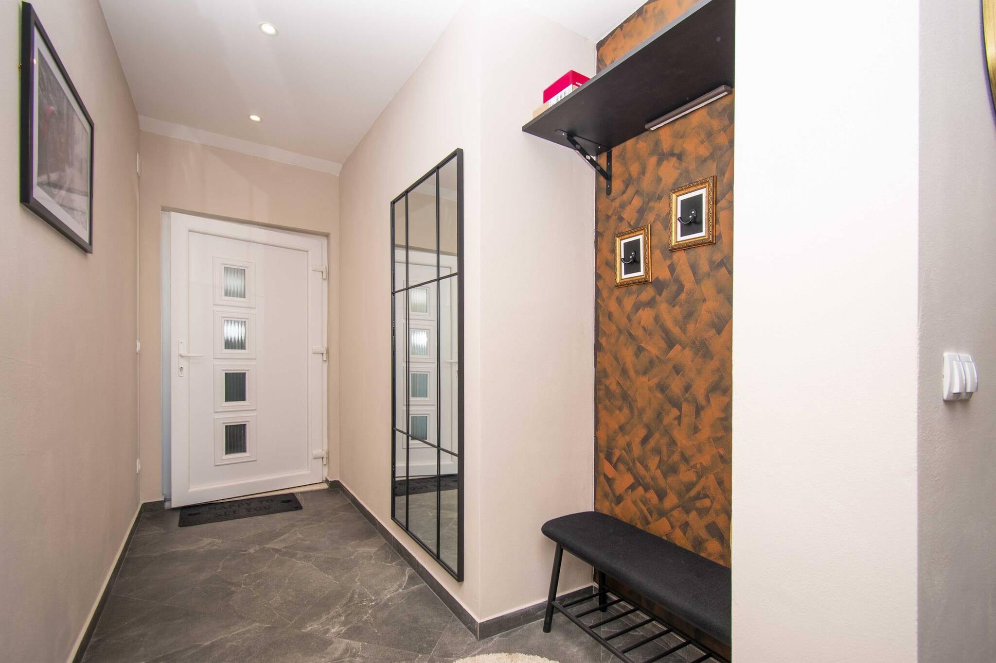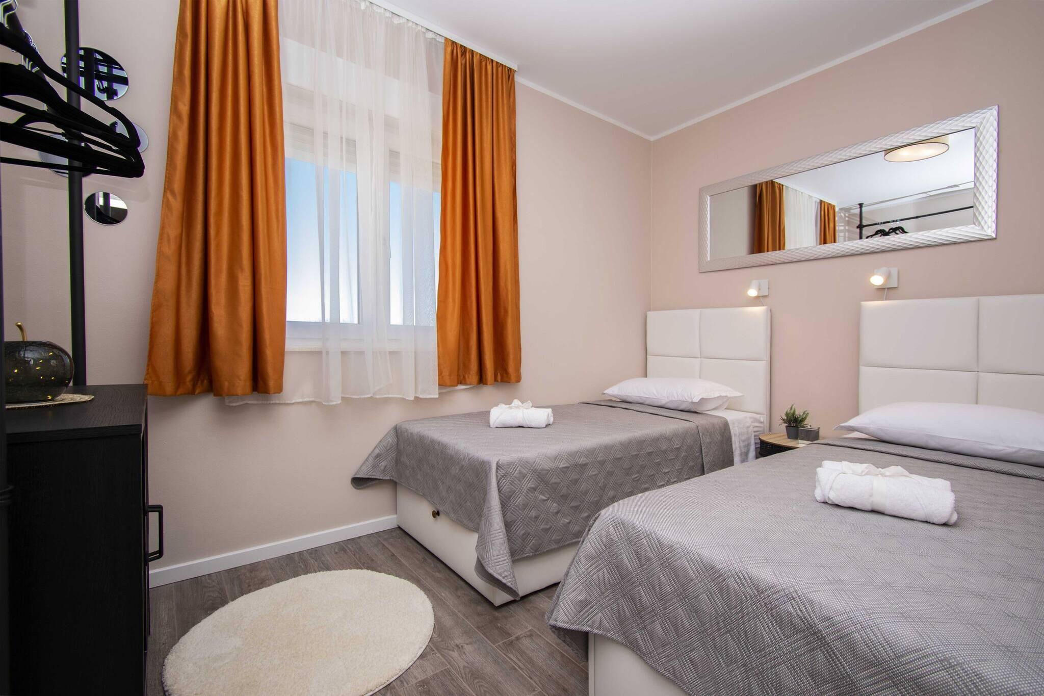 Dette charmerende feriehus byder på komfortable og rummelige rammer for op til 5 gæster. Ejendommen har to velindrettede soveværelser, herunder en king-size seng og to enkeltsenge samt en sovesofa i stuen. Det giver rigelig plads til at slappe af og slappe af. Gæsterne kan nyde en privat balkon, perfekt til at nyde den omkringliggende udsigt. Hjemmet er kæledyrsvenligt og tillader ét kæledyr (mod et ekstra gebyr), hvilket gør det ideelt for rejsende med kæledyr. Derudover tilbyder ejendommen gratis Wi-Fi og aircondition. En privat udendørs parkeringsplads er tilgængelig, hvilket sikrer bekvemmelighed for dem med køretøjer. Mod et ekstra gebyr kan gæsterne leje en cykel eller anmode om en brunchservice. Beliggende kun 1,5 km fra en smuk sandstrand, er feriehuset perfekt placeret til både afslapning og udforskning. I nærheden finder du en række caféer, restauranter og butikker, hvor du kan nyde det lokale køkken og købe væsentlige ting. Et supermarked og Ultra Djelo-markedet ligger inden for gåafstand. For dem, der ønsker at udforske området yderligere, er populære attraktioner såsom Krka Nationalpark og Aquapark Dalmatia let tilgængelige. Den nærmeste lufthavn er Zadar Lufthavn, cirka 63 km væk, mens offentlige transportmuligheder såsom busser og taxaer er let tilgængelige for gæsterne. Indvendigt har feriehuset et fuldt udstyret køkken med køleskab, ovn, mikrobølgeovn og opvaskemaskine, hvilket gør det perfekt til at tilberede måltider. Det moderne badeværelse er udstyret med bruser, og vigtige ting såsom en vaskemaskine, strygejern og hårtørrer er til rådighed for nemheds skyld.