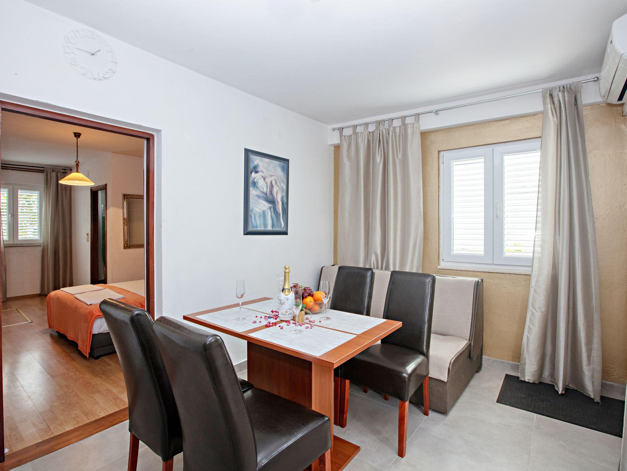 Ferienwohnung bietet Platz für 5 Gäste. Die Betten sind in Schlafzimmern, die es 1 gibt, und in Esszimmer, innerhalb einer Gesamtfläche von 47m2, angeordnet. Die Gäste haben eine eigene Terrasse zur Verfügung, auf der sie in warmen Sommernächten genießen können. Es ist erlaubt, Speisen auf dem Gemeinschafts-Grill vorzubereiten. In der Unterkunftseinheit besteht die Möglichkeit des Mitbringens von Haustieren gegen Aufpreis. IM PREIS INBEGRIFFEN: Kurtaxe, Endreinigung, Klimatisierung, Parkplatz, Internet, Kinderbett, Bügeleisen, Bügelbrett, Föhn, tragbarer Grill. VERBINDLICHE ZUSÄTZLICHE KOSTEN: Aufzahlung für Kurzaufenthalte (prozentualer Zuschlag pro Nächtigungsanzahl: 30% - 1, 20% - 2, 10% - 3). UNVERBINDLICHE ZUSÄTZLICHE KOSTEN: Wäschewaschen (10,00 € Waschen), Haustiere (10,00 € pro Nacht). Die Verfügbarkeit zusätzlicher Dienstleistungen in Ihrem reservierten Termin und die Preise derselben (falls nicht aufgeführt) müssen im Voraus überprüft werden. Zusätzliche Dienstleistungen die in der Zahlungsaufforderung nicht aufgeführt sind werden direkt beim Vermieter bezahlt, angenommen der Gast nutzt auch diese.