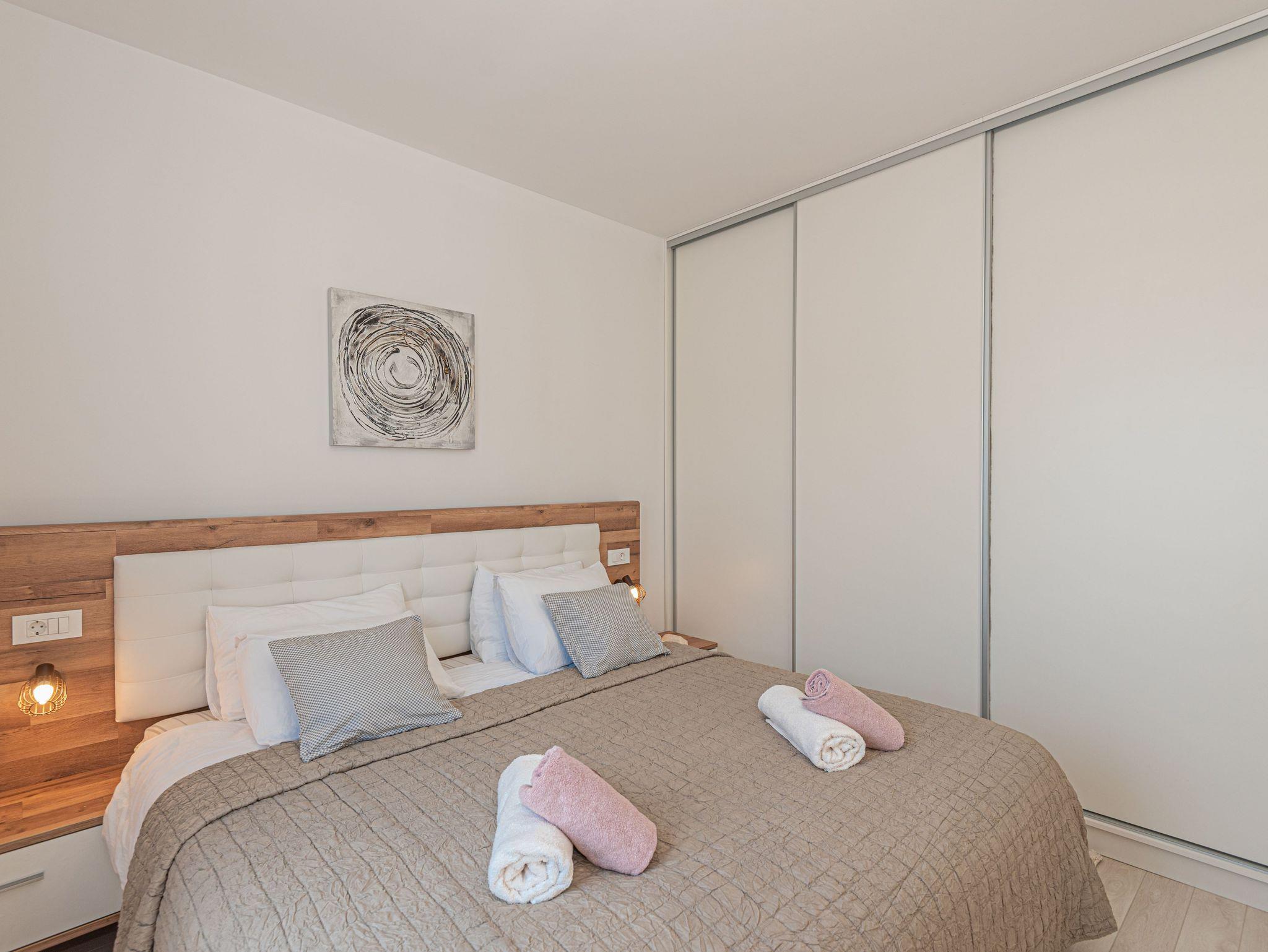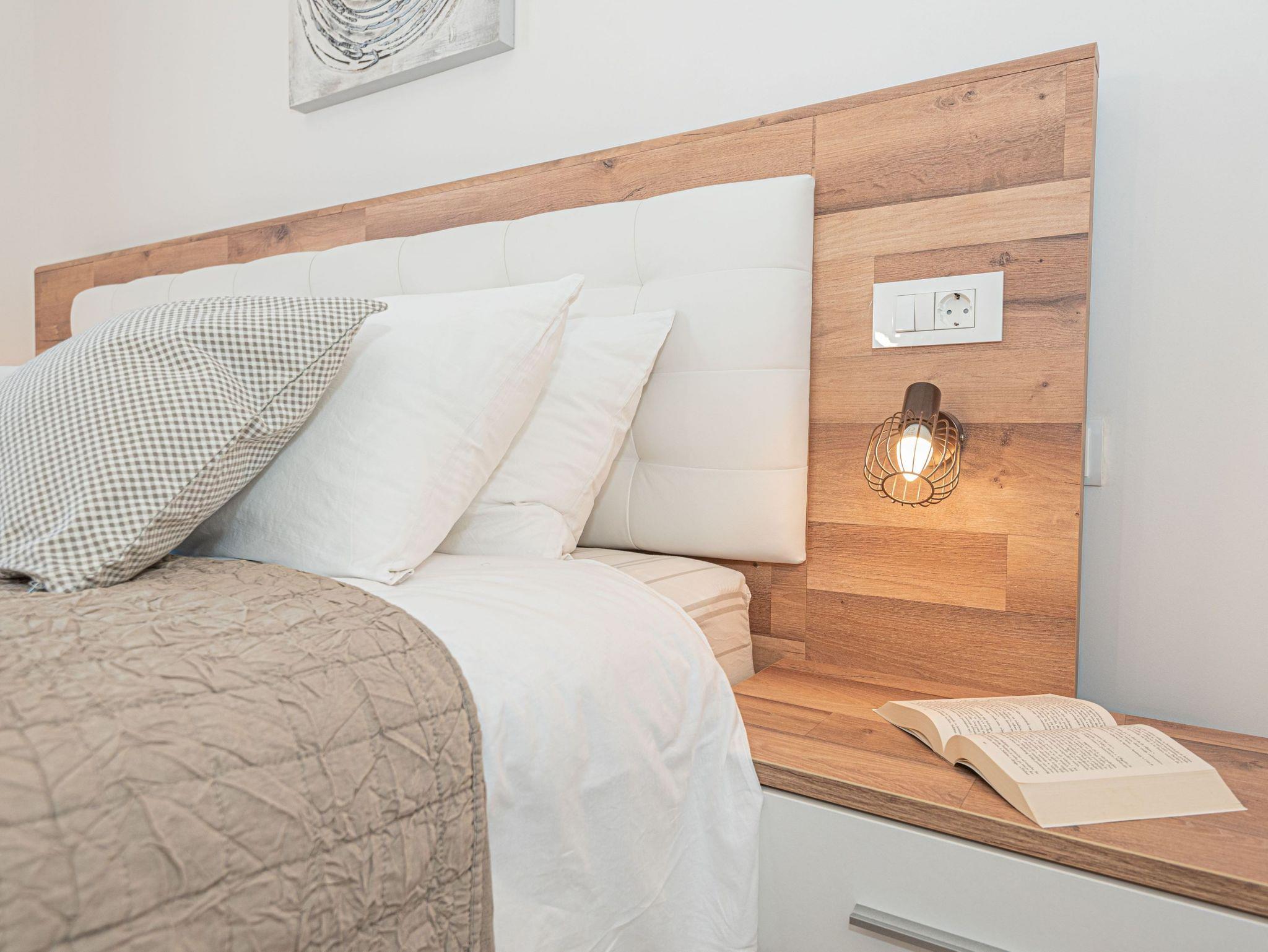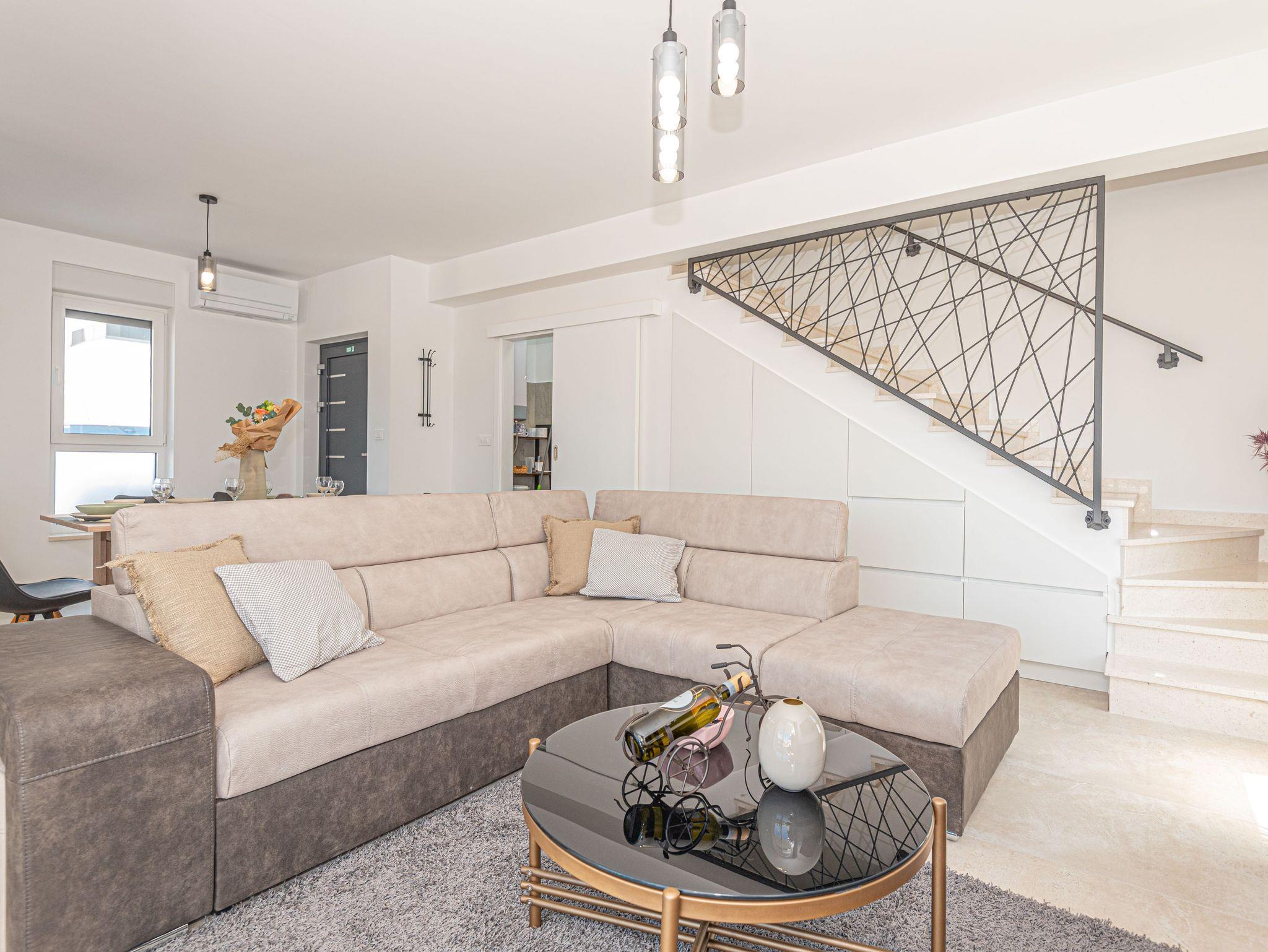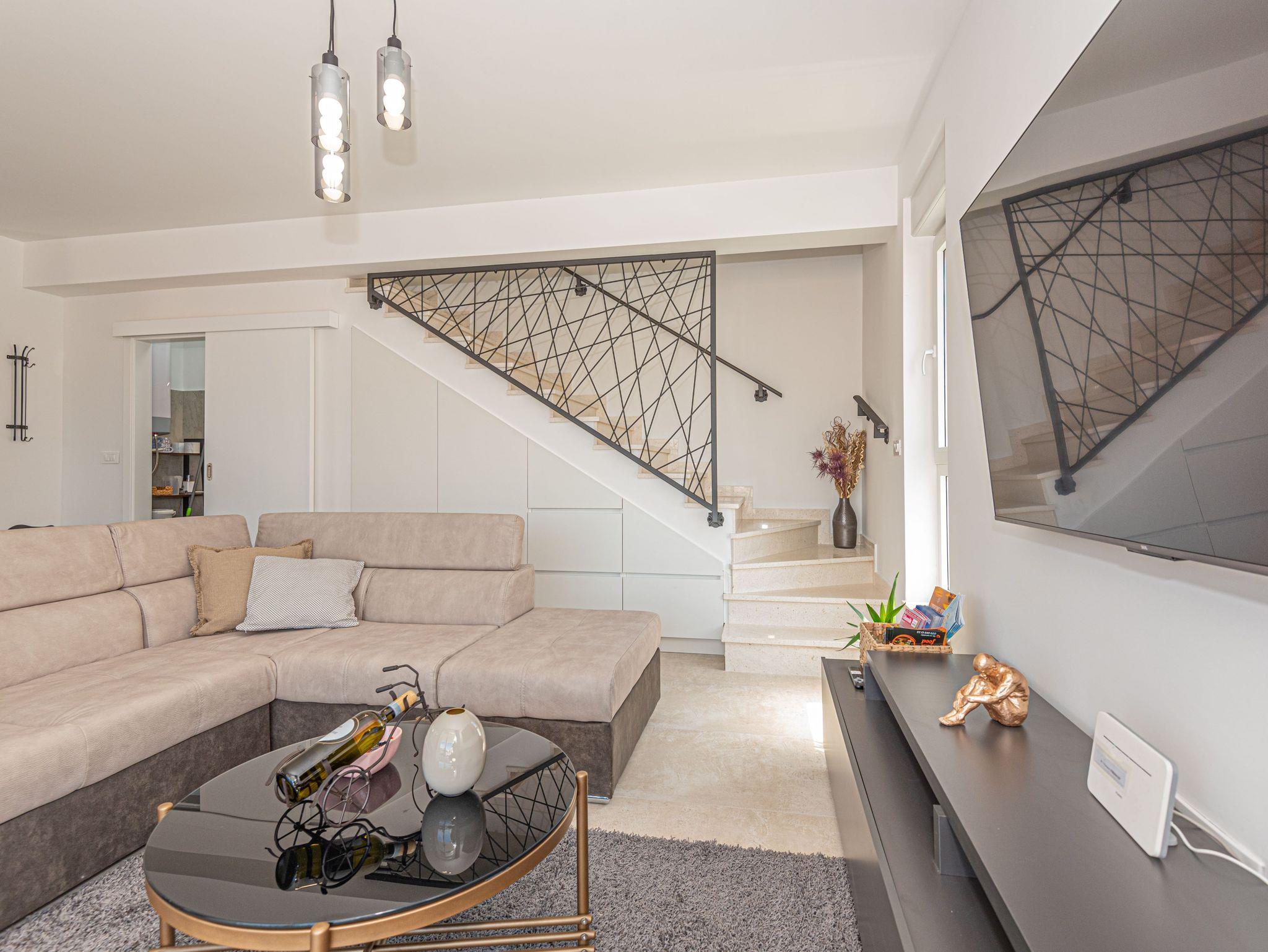 Haus bietet Platz für 6 Gäste. Die Betten sind in Schlafzimmern, die es 3 gibt, innerhalb einer Gesamtfläche von 101m2, angeordnet. Die Gäste haben eine eigene Terrasse zur Verfügung, auf der sie in warmen Sommernächten genießen können. Für vollen Genuss und Entspannung gibt es einen privaten Grill für Gäste dieser Unterkunft. Während ihres Aufenthalts können sich Gäste im privaten Schwimmbad entspannen. IM PREIS INBEGRIFFEN: Kurtaxe, Endreinigung, Klimatisierung, Pool, Parkplatz, Internet, Kinderbett, Bügeleisen, Bügelbrett, Föhn. VERBINDLICHE ZUSÄTZLICHE KOSTEN: Aufzahlung für Kurzaufenthalte (prozentualer Zuschlag pro Nächtigungsanzahl: 30% - 1, 20% - 2, 10% - 3). UNVERBINDLICHE ZUSÄTZLICHE KOSTEN: Boot (200,00 € pro Nacht). Die Verfügbarkeit zusätzlicher Dienstleistungen in Ihrem reservierten Termin und die Preise derselben (falls nicht aufgeführt) müssen im Voraus überprüft werden. Zusätzliche Dienstleistungen die in der Zahlungsaufforderung nicht aufgeführt sind werden direkt beim Vermieter bezahlt, angenommen der Gast nutzt auch diese. Ermäßigung auf den Grundpreis: Gratistag 14=13 (bei einem Aufenthalt von 14 Tagen oder mehr erhalten Sie einen Gratistag für den Aufenthalt bis 31.12.26).