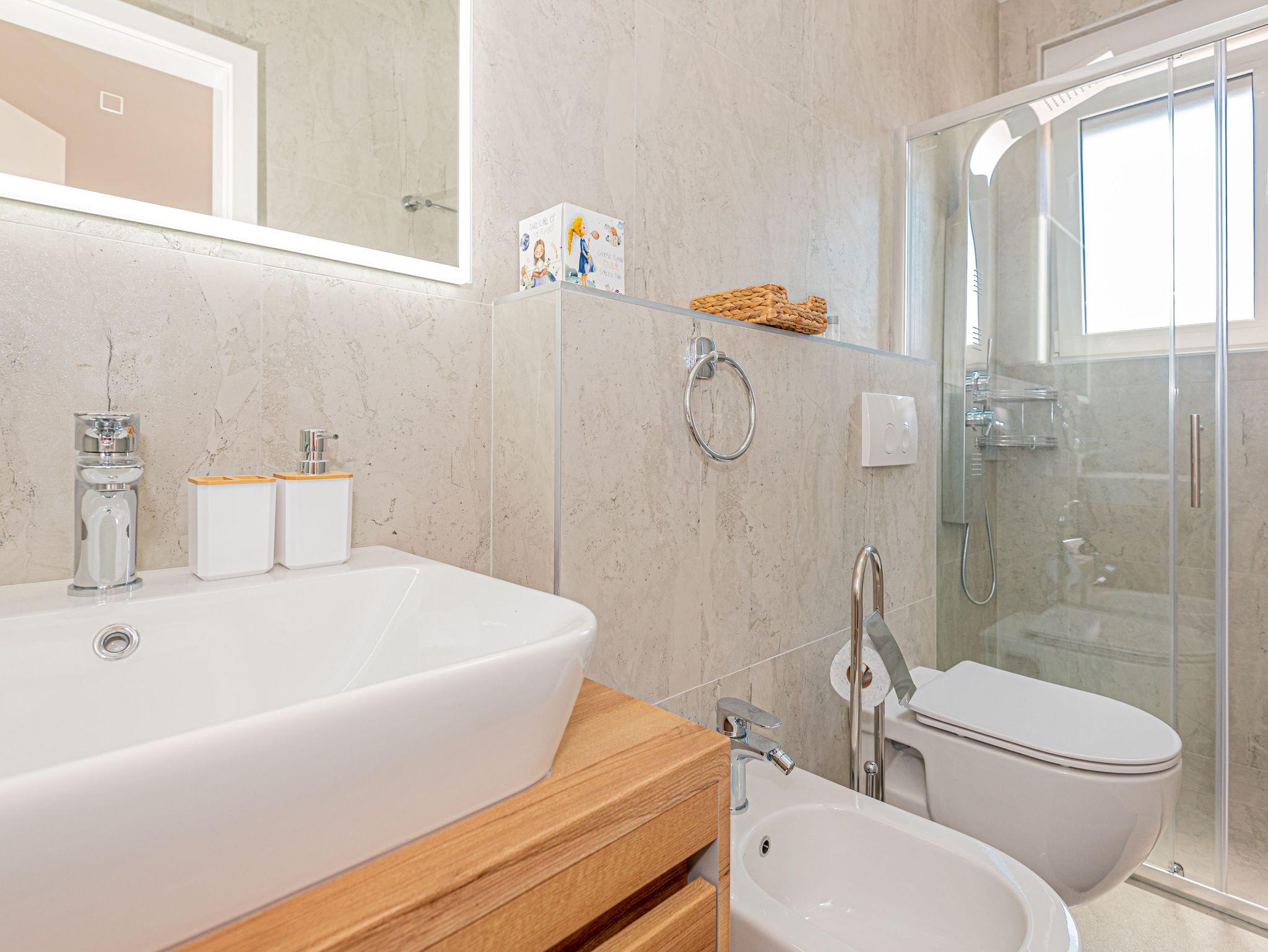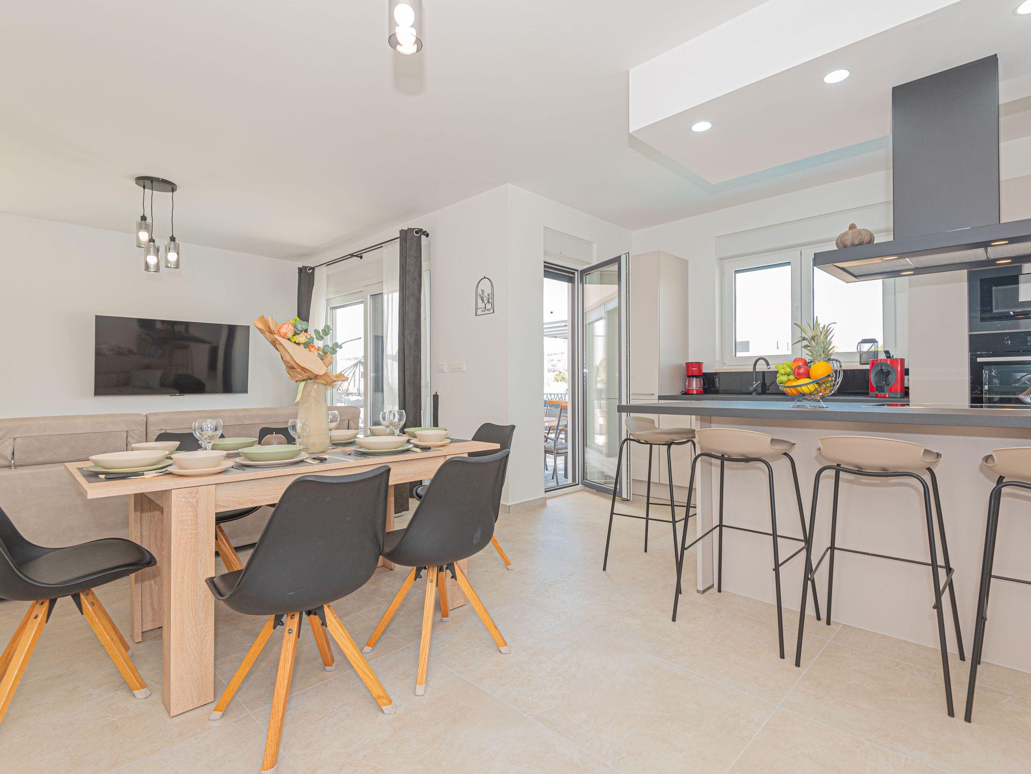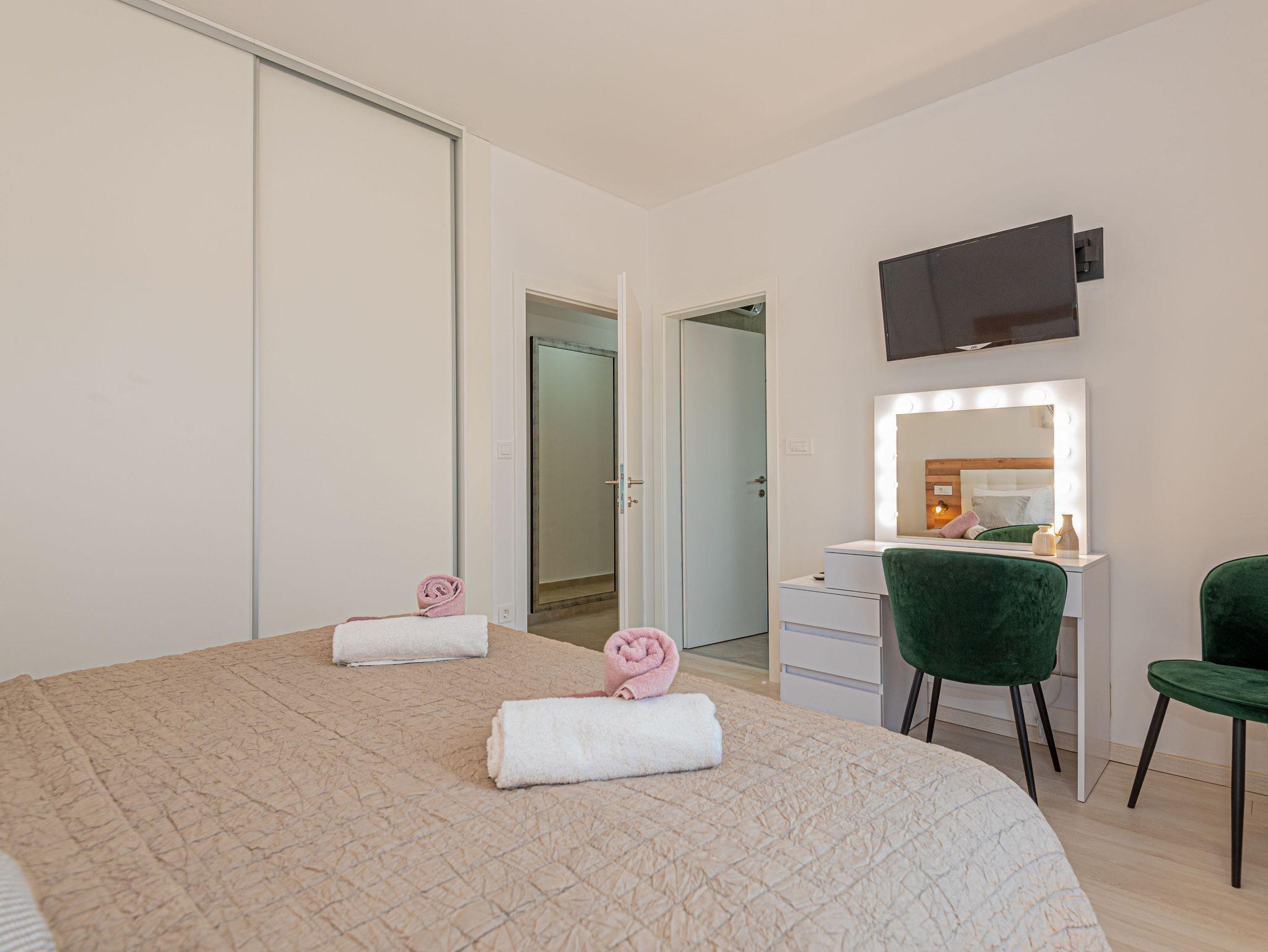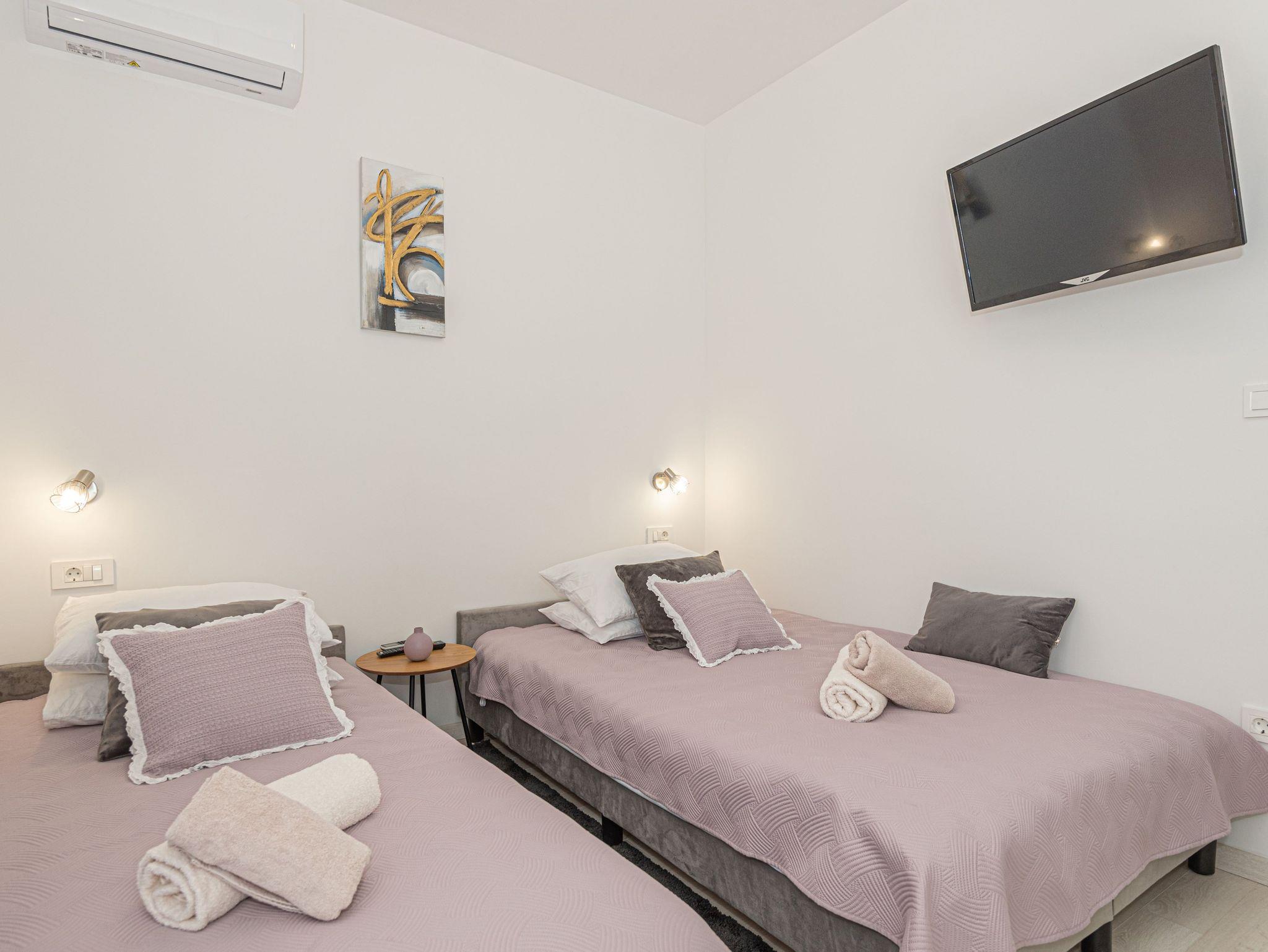 Haus bietet Platz für 6 Gäste. Die Betten sind in Schlafzimmern, die es 3 gibt, innerhalb einer Gesamtfläche von 101m2, angeordnet. Die Gäste haben eine eigene Terrasse zur Verfügung, auf der sie in warmen Sommernächten genießen können. Für vollen Genuss und Entspannung gibt es einen privaten Grill für Gäste dieser Unterkunft. Während ihres Aufenthalts können sich Gäste im privaten Schwimmbad entspannen. IM PREIS INBEGRIFFEN: Kurtaxe, Endreinigung, Klimatisierung, Pool, Parkplatz, Internet, Kinderbett, Bügeleisen, Bügelbrett, Föhn. VERBINDLICHE ZUSÄTZLICHE KOSTEN: Aufzahlung für Kurzaufenthalte (prozentualer Zuschlag pro Nächtigungsanzahl: 30% - 1, 20% - 2, 10% - 3). UNVERBINDLICHE ZUSÄTZLICHE KOSTEN: Boot (200,00 € pro Nacht). Die Verfügbarkeit zusätzlicher Dienstleistungen in Ihrem reservierten Termin und die Preise derselben (falls nicht aufgeführt) müssen im Voraus überprüft werden. Zusätzliche Dienstleistungen die in der Zahlungsaufforderung nicht aufgeführt sind werden direkt beim Vermieter bezahlt, angenommen der Gast nutzt auch diese. Ermäßigung auf den Grundpreis: Gratistag 14=13 (bei einem Aufenthalt von 14 Tagen oder mehr erhalten Sie einen Gratistag für den Aufenthalt bis 31.12.26).