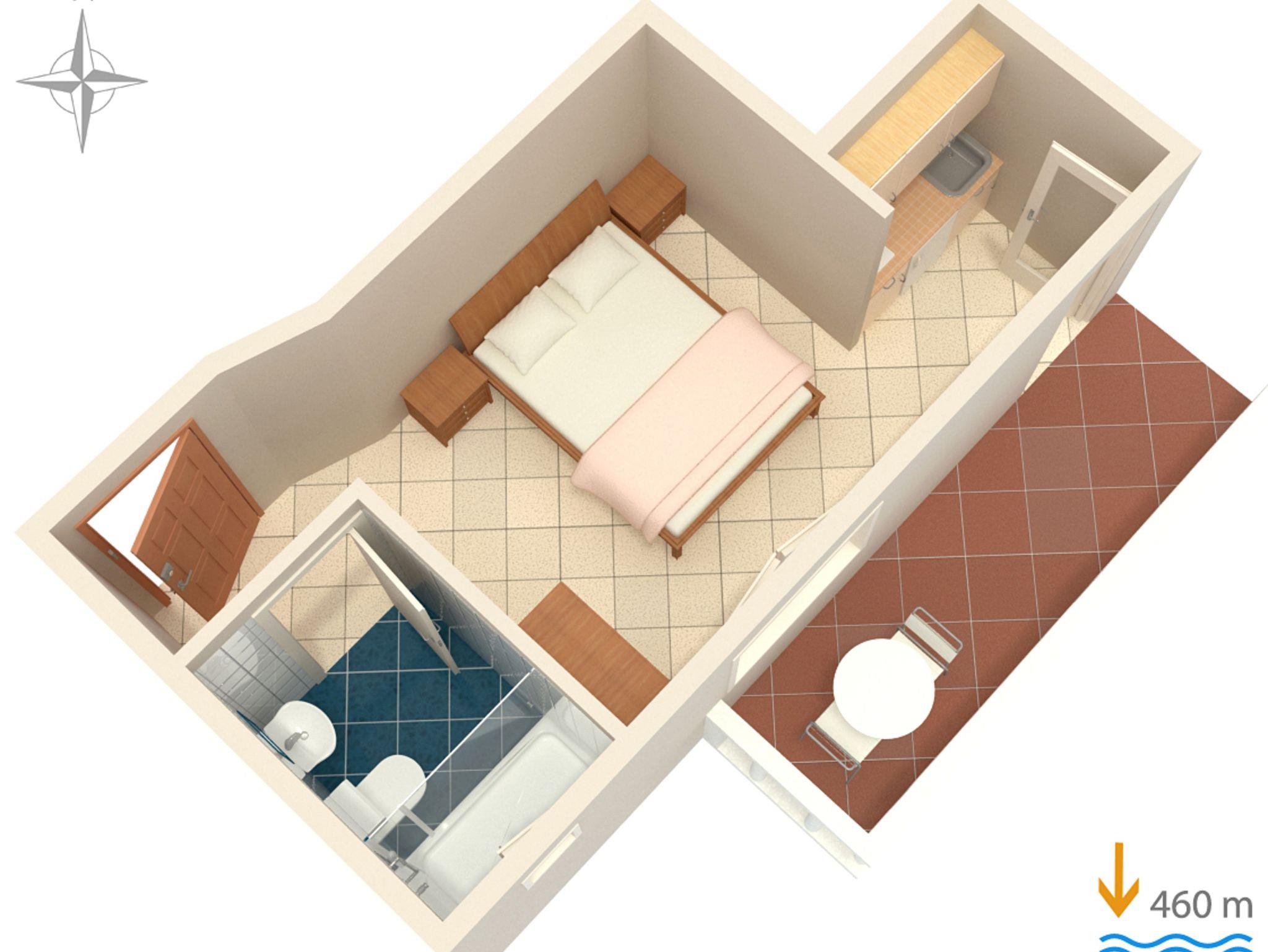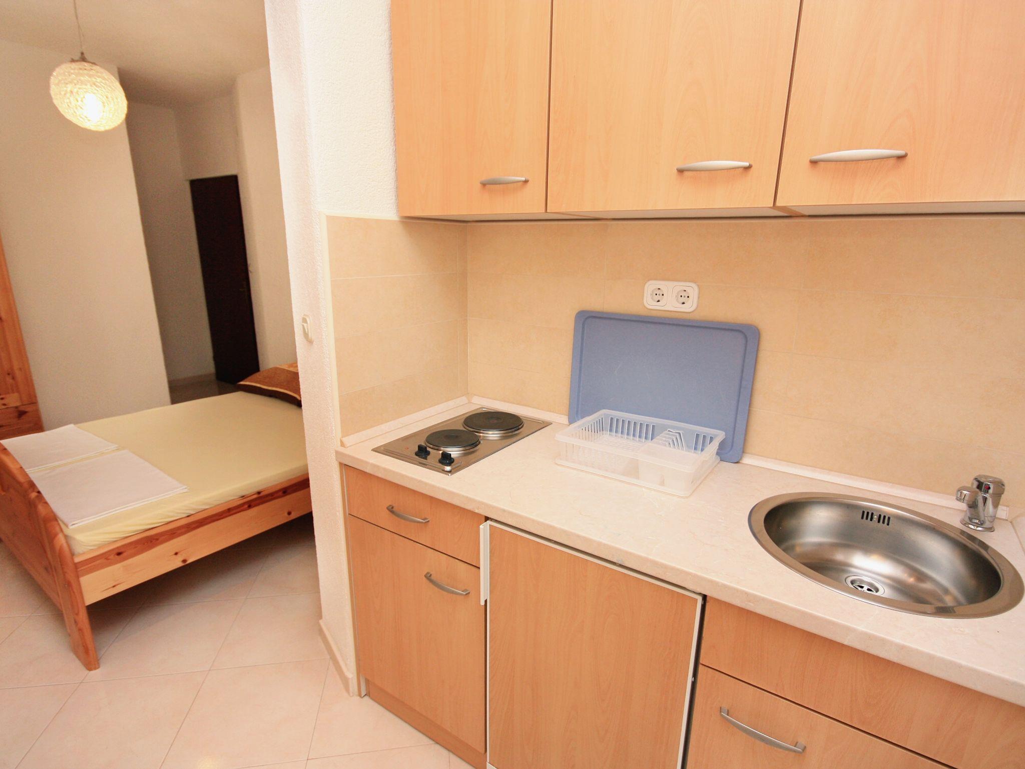 Studio bietet Platz für 2 Gäste. Die Betten sind in Schlafzimmern, die es 1 gibt, innerhalb einer Gesamtfläche von 16m2, angeordnet. Die Gäste haben eine eigene Terrasse zur Verfügung, auf der sie in warmen Sommernächten genießen können. Das Studio-Apartment bietet Meerblick. Es ist erlaubt, Speisen auf dem Gemeinschafts-Grill vorzubereiten. IM PREIS INBEGRIFFEN: Kurtaxe, Endreinigung, Klimatisierung, Parkplatz, Internet, Kinderbett, tragbarer Grill. VERBINDLICHE ZUSÄTZLICHE KOSTEN: Aufzahlung für Kurzaufenthalte (prozentualer Zuschlag pro Nächtigungsanzahl: 30% - 1, 20% - 2, 10% - 3). Die Verfügbarkeit zusätzlicher Dienstleistungen in Ihrem reservierten Termin und die Preise derselben (falls nicht aufgeführt) müssen im Voraus überprüft werden. Zusätzliche Dienstleistungen die in der Zahlungsaufforderung nicht aufgeführt sind werden direkt beim Vermieter bezahlt, angenommen der Gast nutzt auch diese.