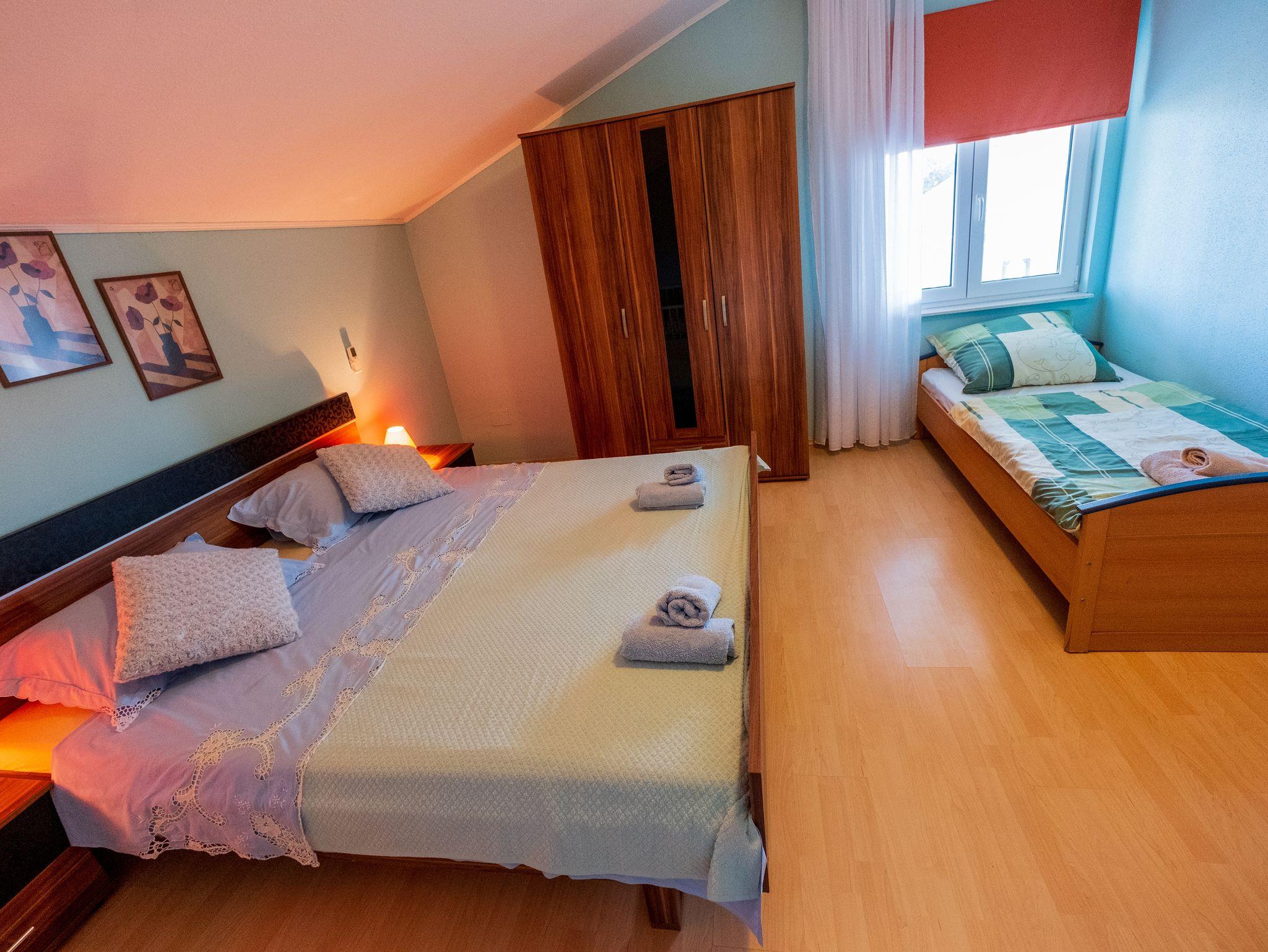 Ferienwohnung bietet Platz für 7 Gäste. Die Betten sind in Schlafzimmern, die es 3 gibt, innerhalb einer Gesamtfläche von 60m2, angeordnet. Es ist erlaubt, Speisen auf dem Gemeinschafts-Grill vorzubereiten. Die reservierte Unterkunftseinheit verfügt über einen gemeinsame Terrasse. Räume der gebuchten Unterkunftseinheit werden nicht in eine Ganze verbunden. Unterkunftseinheit hat Räume, die von dem Rest der Einheit abgetrennt werden. Eingang in die Unterkunftseinheit ist nicht mit einer Tür von anderen Räumen des Objektes getrennt. IM PREIS INBEGRIFFEN: Kurtaxe, Endreinigung, Klimatisierung, Parkplatz, Internet, Kinderbett, Bügeleisen, Bügelbrett, Föhn, tragbarer Grill. VERBINDLICHE ZUSÄTZLICHE KOSTEN: Aufzahlung für Kurzaufenthalte (prozentualer Zuschlag pro Nächtigungsanzahl: 30% - 1, 20% - 2, 10% - 3). Die Verfügbarkeit zusätzlicher Dienstleistungen in Ihrem reservierten Termin und die Preise derselben (falls nicht aufgeführt) müssen im Voraus überprüft werden. Zusätzliche Dienstleistungen die in der Zahlungsaufforderung nicht aufgeführt sind werden direkt beim Vermieter bezahlt, angenommen der Gast nutzt auch diese.
