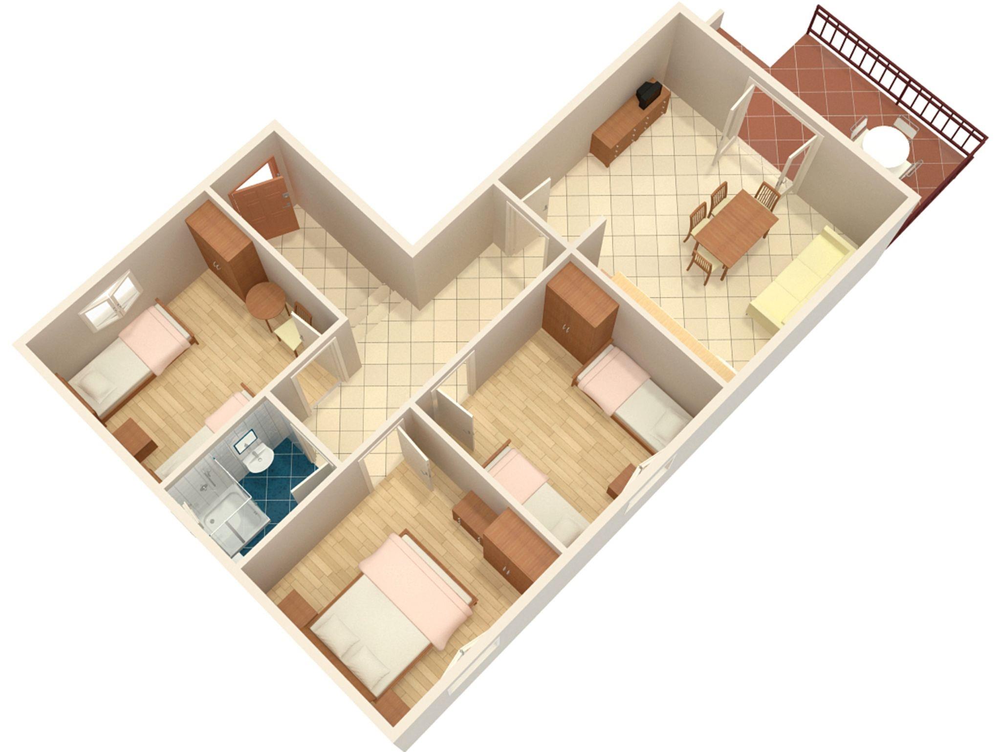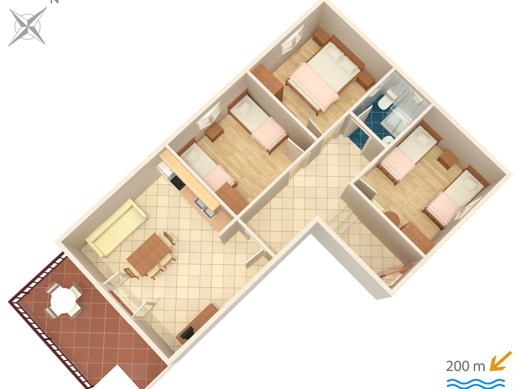 Ferienwohnung bietet Platz für 6 Gäste. Die Betten sind in Schlafzimmern, die es 3 gibt, innerhalb einer Gesamtfläche von 54m2, angeordnet. Die Gäste haben eine eigene Terrasse zur Verfügung, auf der sie in warmen Sommernächten genießen können. Es ist erlaubt, Speisen auf dem Gemeinschafts-Grill vorzubereiten. In der Unterkunftseinheit besteht die Möglichkeit des Mitbringens von Haustieren gegen Aufpreis. IM PREIS INBEGRIFFEN: Kurtaxe, Endreinigung, Parkplatz, Internet, Kinderbett, Bügelbrett, Föhn. VERBINDLICHE ZUSÄTZLICHE KOSTEN: Aufzahlung für Kurzaufenthalte (prozentualer Zuschlag pro Nächtigungsanzahl: 30% - 1, 20% - 2, 10% - 3). UNVERBINDLICHE ZUSÄTZLICHE KOSTEN: Klimatisierung (7,00 € pro Nacht), Wäschewaschen (5,00 € Waschen), Haustiere (5,00 € pro Nacht), Zusatzbett (10,00 € pro Nacht). Die Verfügbarkeit zusätzlicher Dienstleistungen in Ihrem reservierten Termin und die Preise derselben (falls nicht aufgeführt) müssen im Voraus überprüft werden. Zusätzliche Dienstleistungen die in der Zahlungsaufforderung nicht aufgeführt sind werden direkt beim Vermieter bezahlt, angenommen der Gast nutzt auch diese.