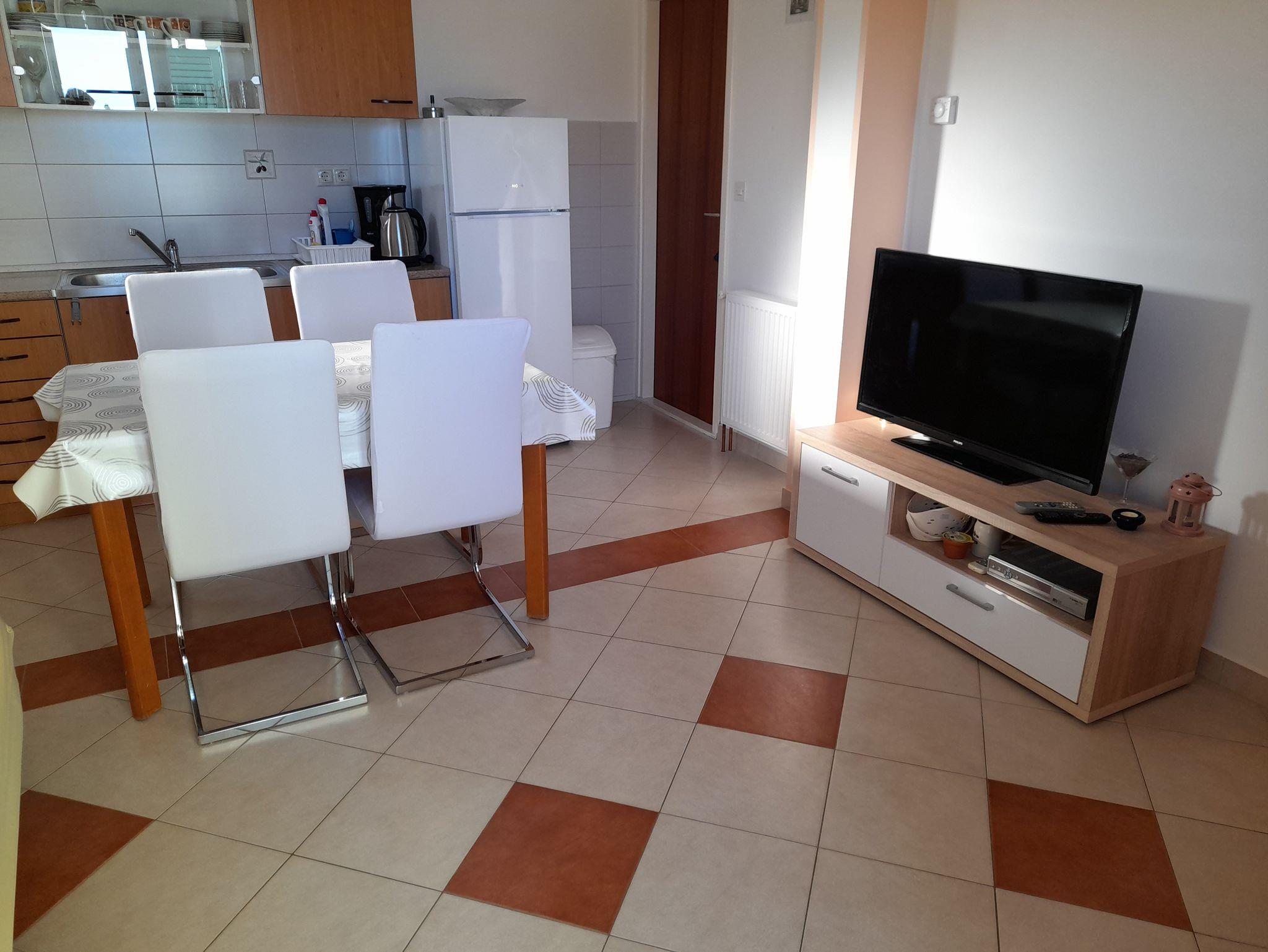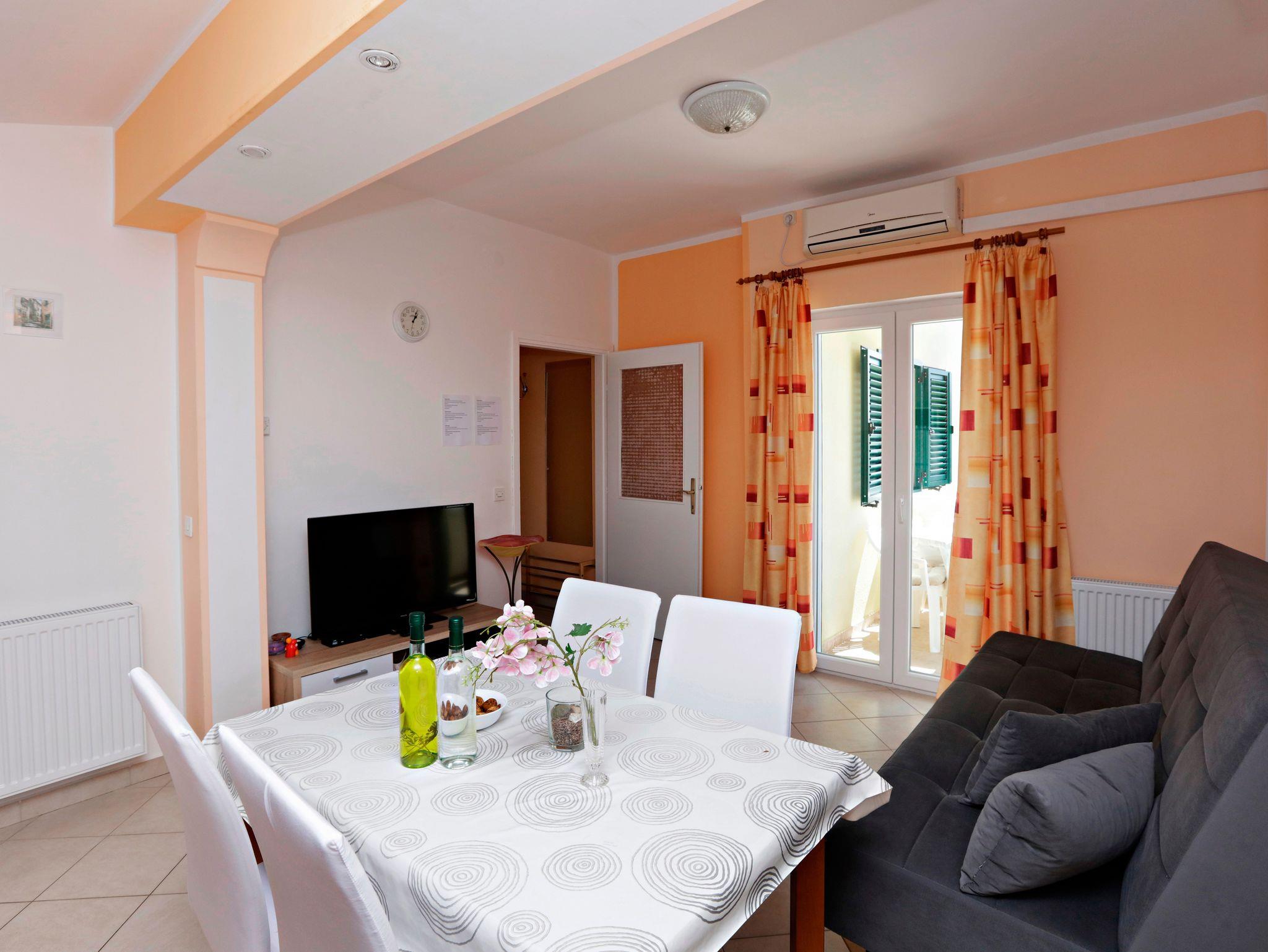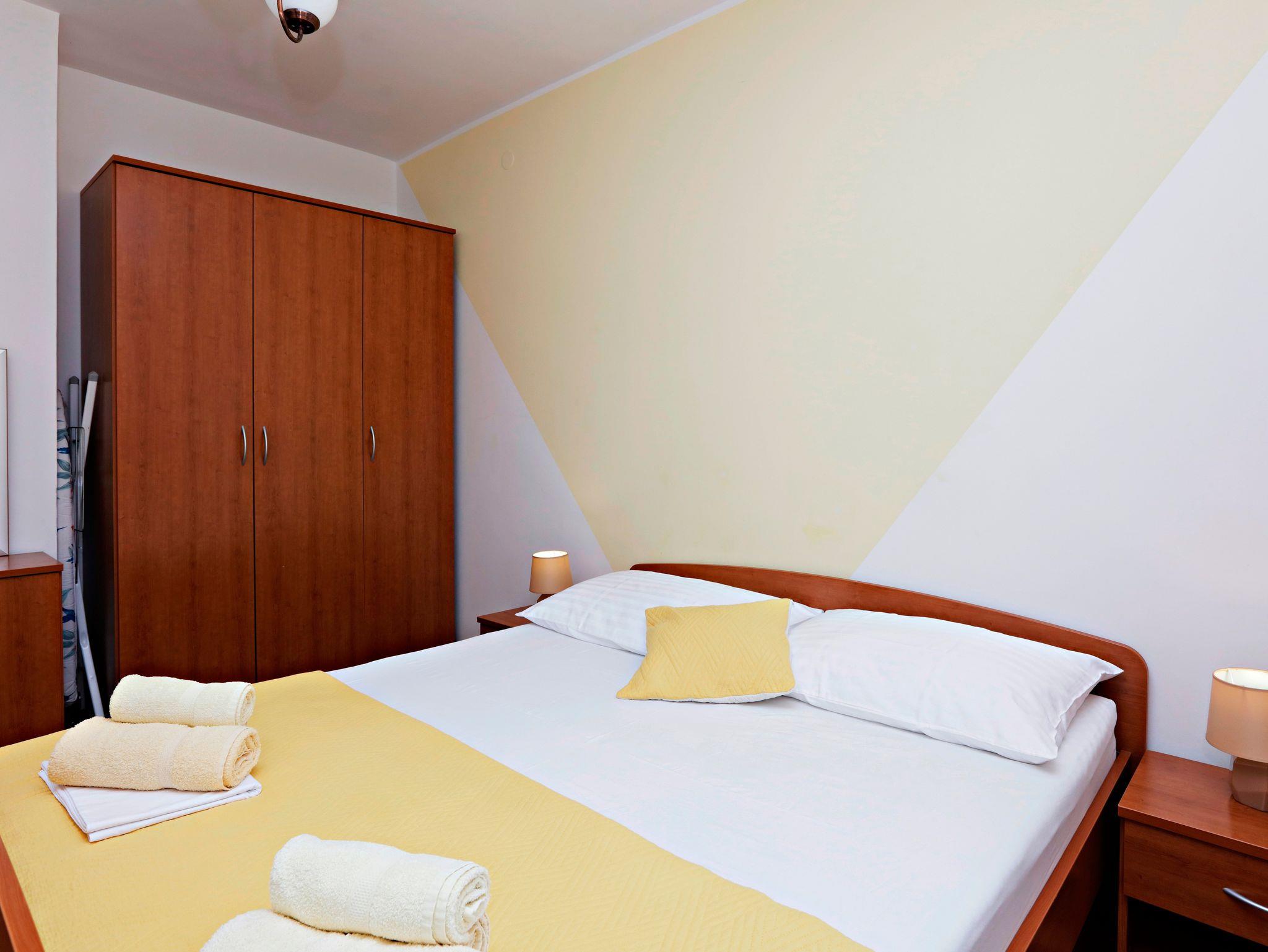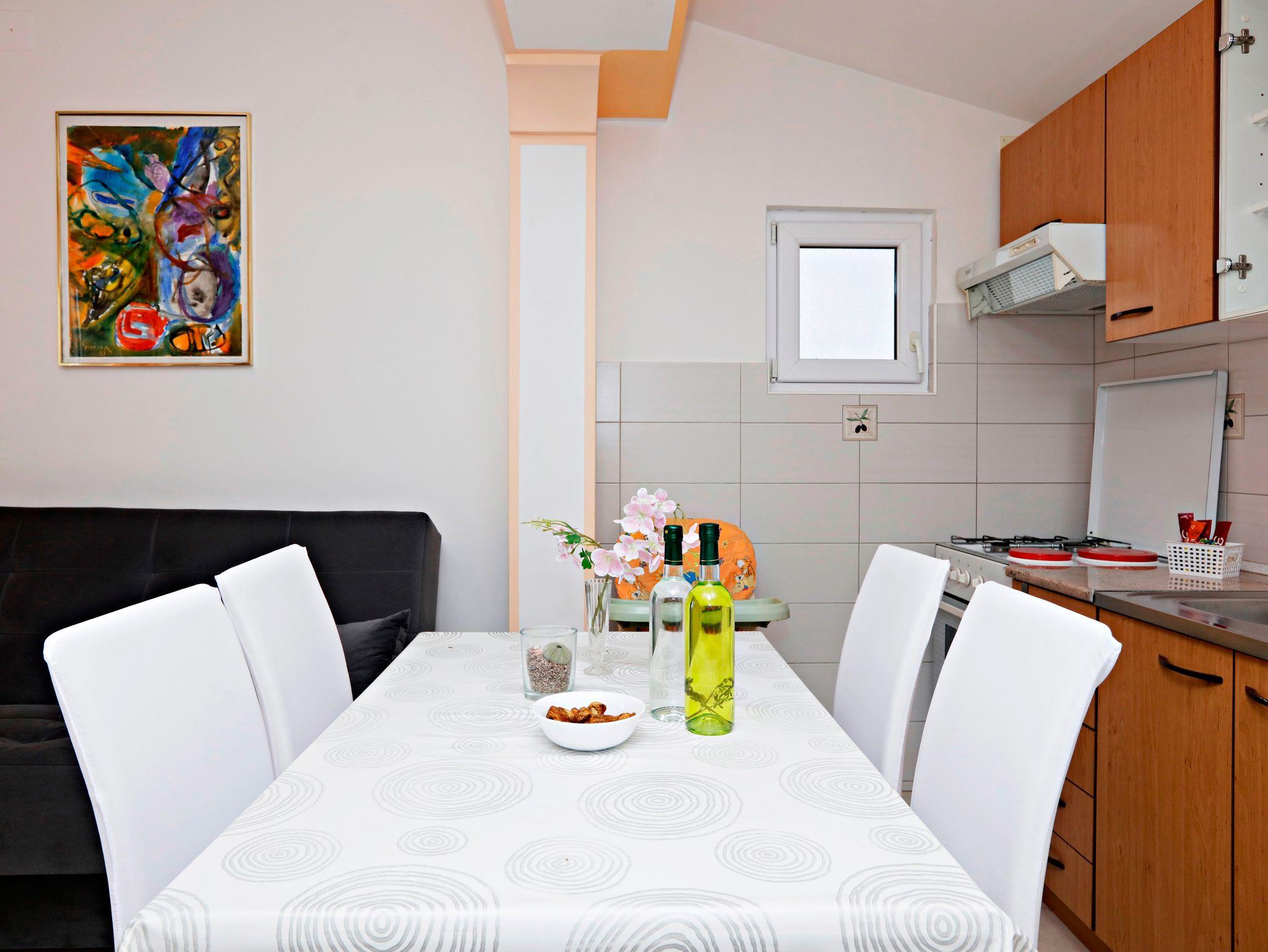 Ferienwohnung bietet Platz für 4 Gäste. Die Betten sind in Schlafzimmern, die es 1 gibt, und in Wohnzimmer, innerhalb einer Gesamtfläche von 45m2, angeordnet. Die Gäste haben eine eigene Terrasse zur Verfügung, auf der sie in warmen Sommernächten genießen können. Es ist erlaubt, Speisen auf dem Gemeinschafts-Grill vorzubereiten. In der Unterkunftseinheit besteht die Möglichkeit des Mitbringens von Haustieren, und die Dienstleistung ist im Preis der Unterkunft enthalten. IM PREIS INBEGRIFFEN: Kurtaxe, Endreinigung, Klimatisierung, Parkplatz, Internet, Wäschewaschen, Bootsanlegeplatz, Haustiere, Kinderbett, Bügeleisen, Bügelbrett, Föhn, 1 Bett für Kinder (im Preis enthalten). Die Verfügbarkeit zusätzlicher Dienstleistungen in Ihrem reservierten Termin und die Preise derselben (falls nicht aufgeführt) müssen im Voraus überprüft werden. Zusätzliche Dienstleistungen die in der Zahlungsaufforderung nicht aufgeführt sind werden direkt beim Vermieter bezahlt, angenommen der Gast nutzt auch diese.