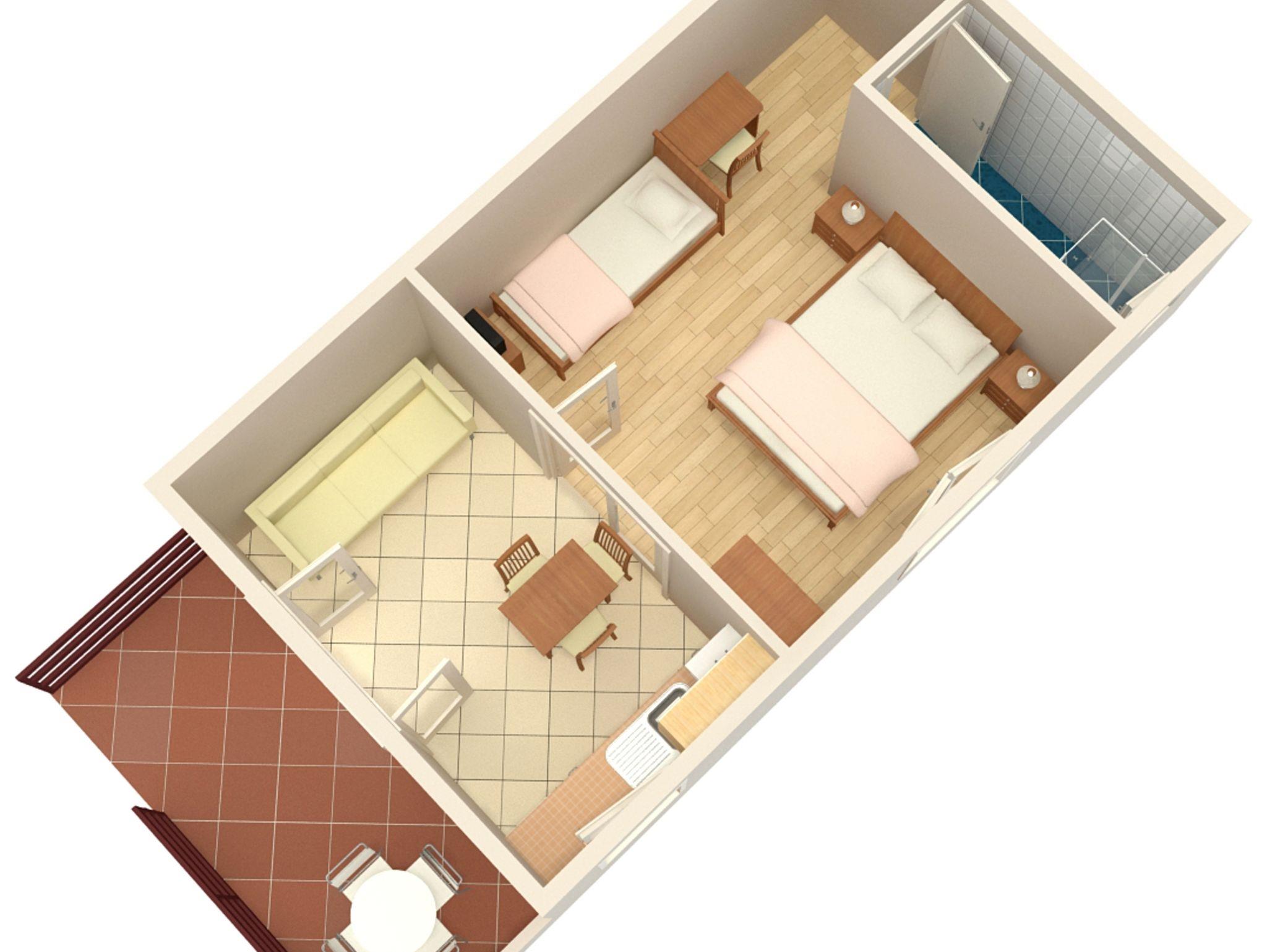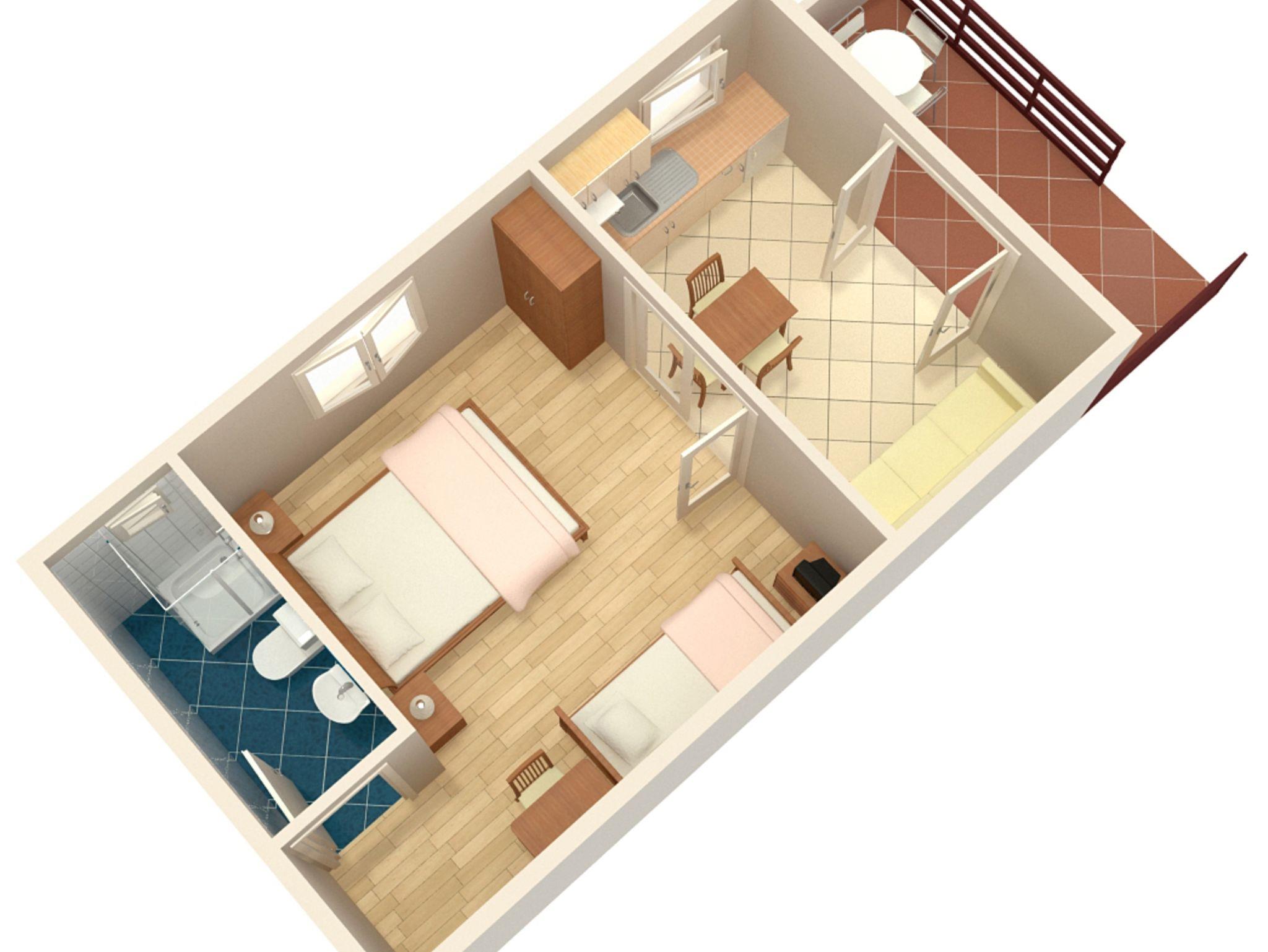 Ferienwohnung bietet Platz für 3 Gäste. Die Betten sind in Schlafzimmern, die es 1 gibt, innerhalb einer Gesamtfläche von 31m2, angeordnet. Die Gäste haben eine eigene Terrasse zur Verfügung, auf der sie in warmen Sommernächten genießen können. Es ist erlaubt, Speisen auf dem Gemeinschafts-Grill vorzubereiten. In der Unterkunftseinheit besteht die Möglichkeit des Mitbringens von Haustieren gegen Aufpreis. IM PREIS INBEGRIFFEN: Kurtaxe, Endreinigung, Parkplatz, Internet, Kinderbett. UNVERBINDLICHE ZUSÄTZLICHE KOSTEN: Klimatisierung (8,00 € pro Nacht), Wäschewaschen (10,00 € Waschen), Haustiere (9,00 € pro Nacht). Die Verfügbarkeit zusätzlicher Dienstleistungen in Ihrem reservierten Termin und die Preise derselben (falls nicht aufgeführt) müssen im Voraus überprüft werden. Zusätzliche Dienstleistungen die in der Zahlungsaufforderung nicht aufgeführt sind werden direkt beim Vermieter bezahlt, angenommen der Gast nutzt auch diese.