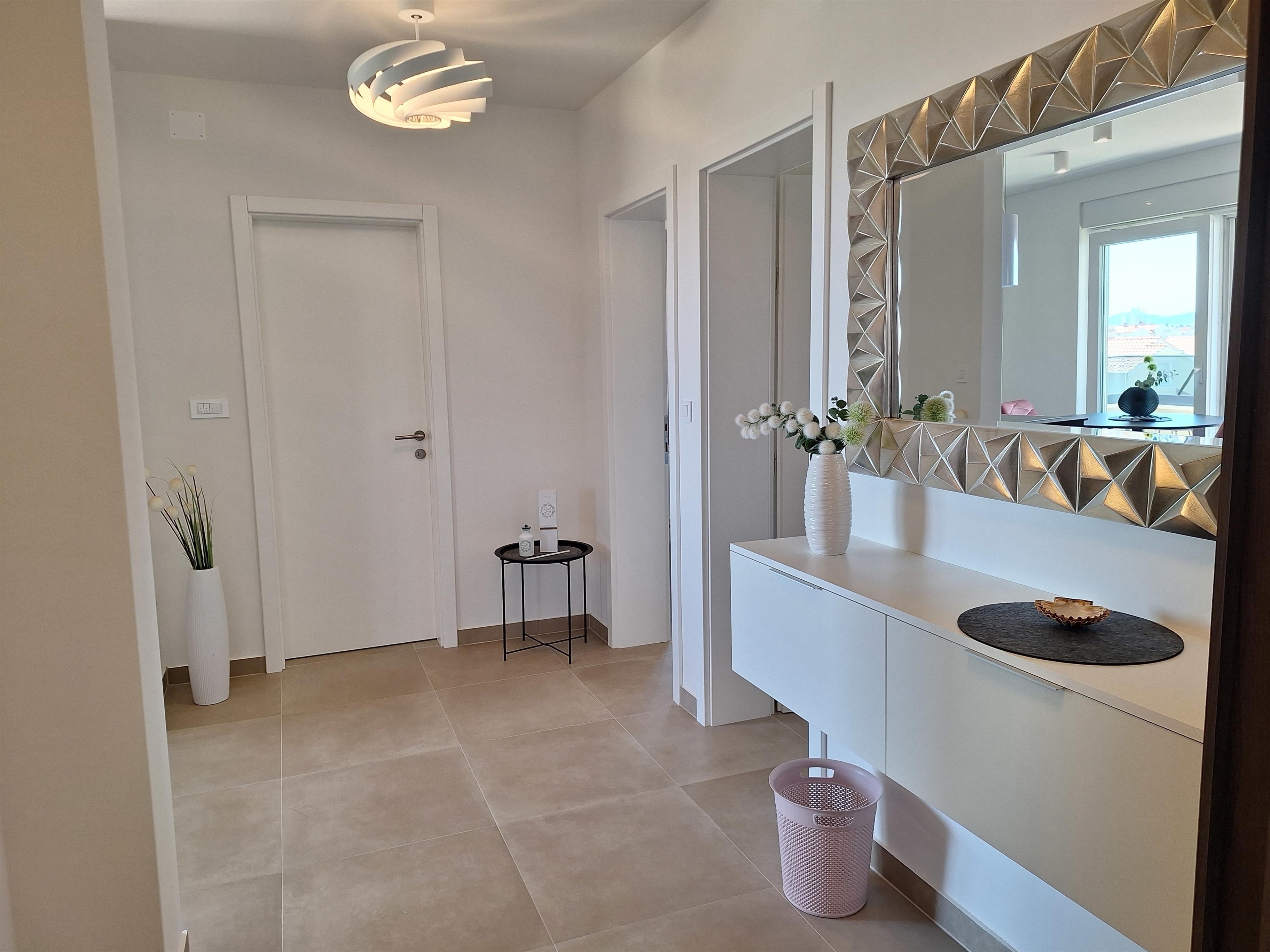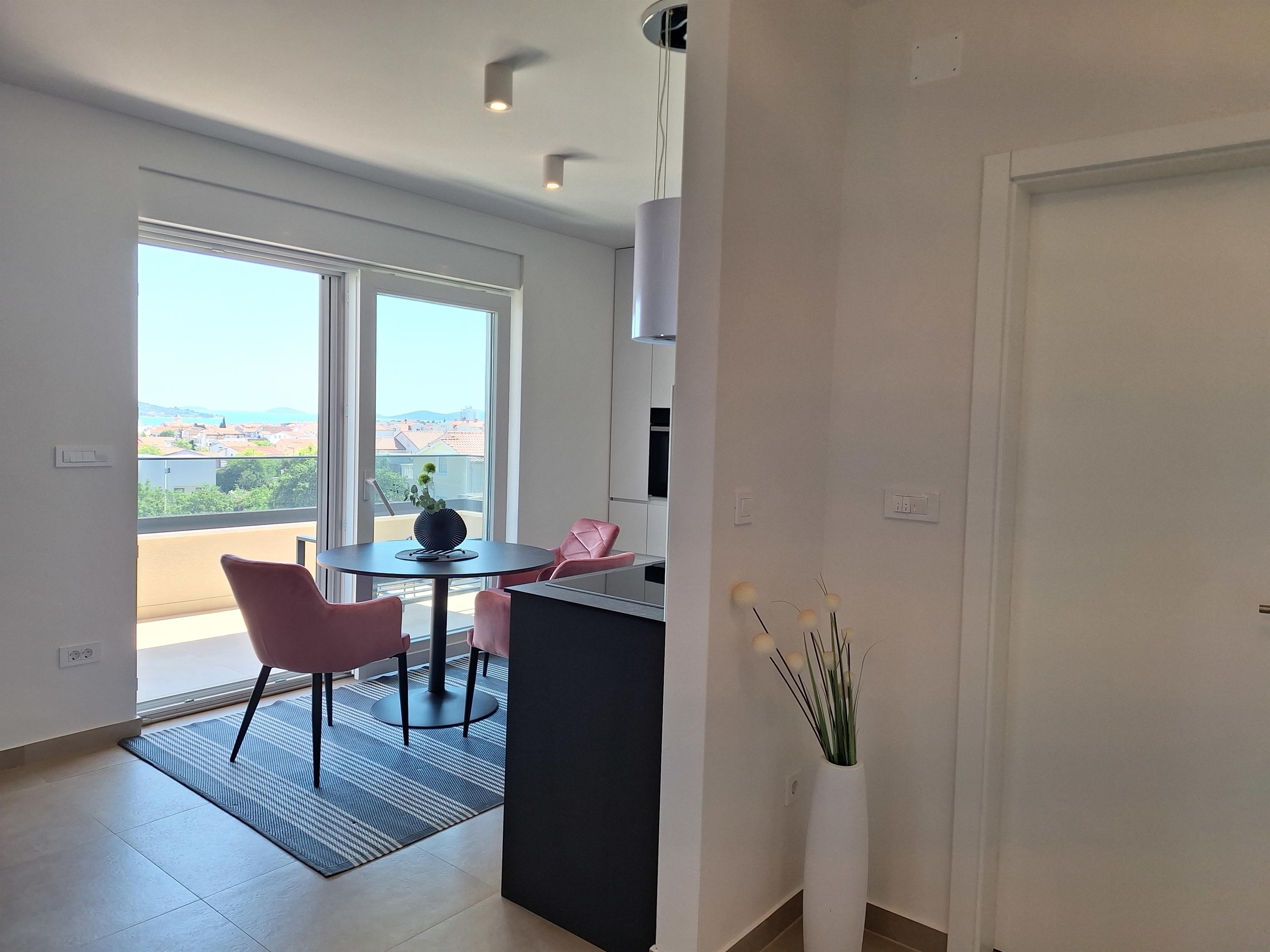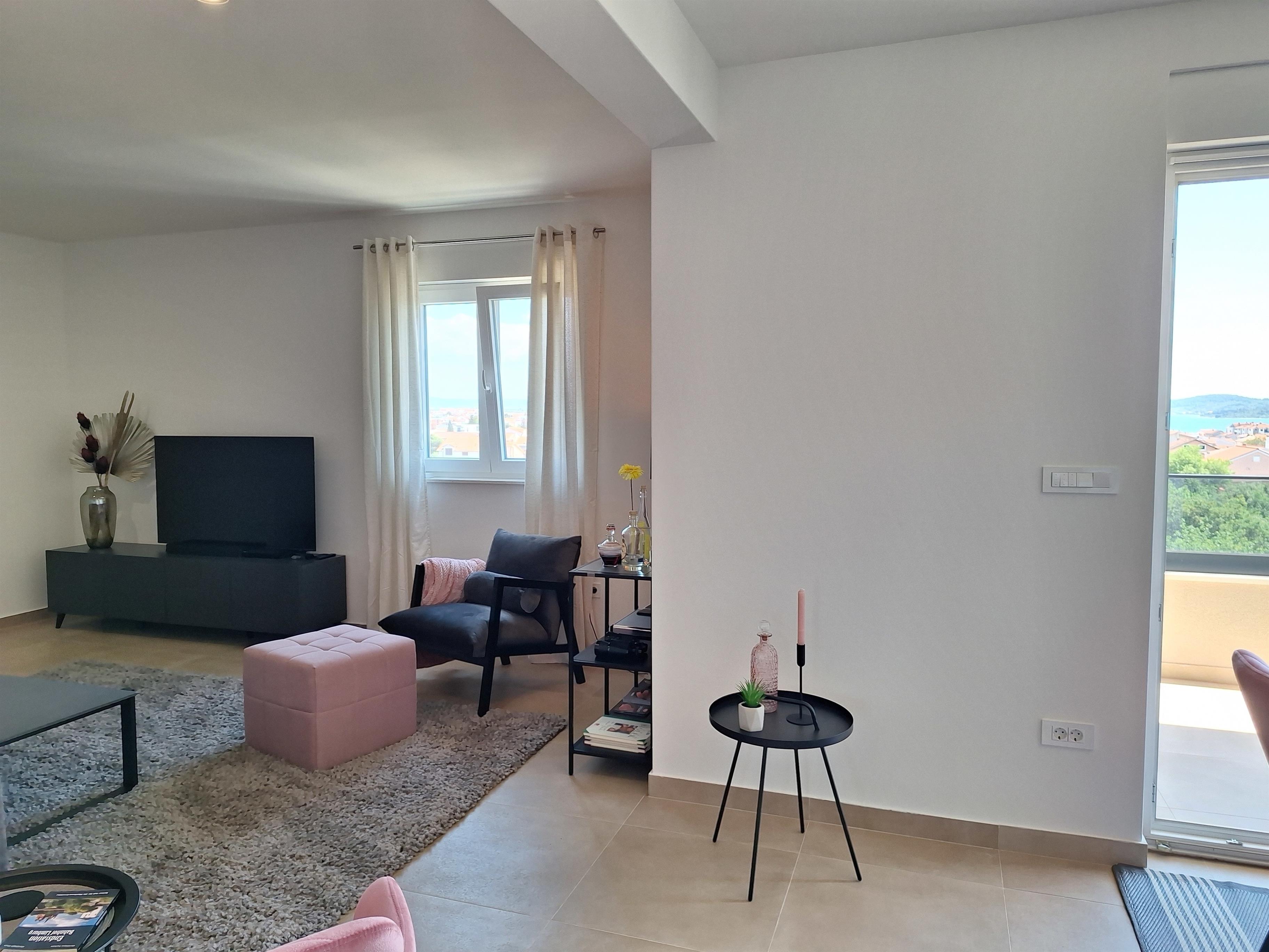 Neue Penthousewohnung mit traumhaftem Panorama-Meerblick über die Bucht von Vodice und den mit Fähre, Wassertaxi oder dem eigenen/gemieteten Boot leicht zu erreichenden vorgelagerten Inseln, den Yachthafen, auf Berge und Strände.