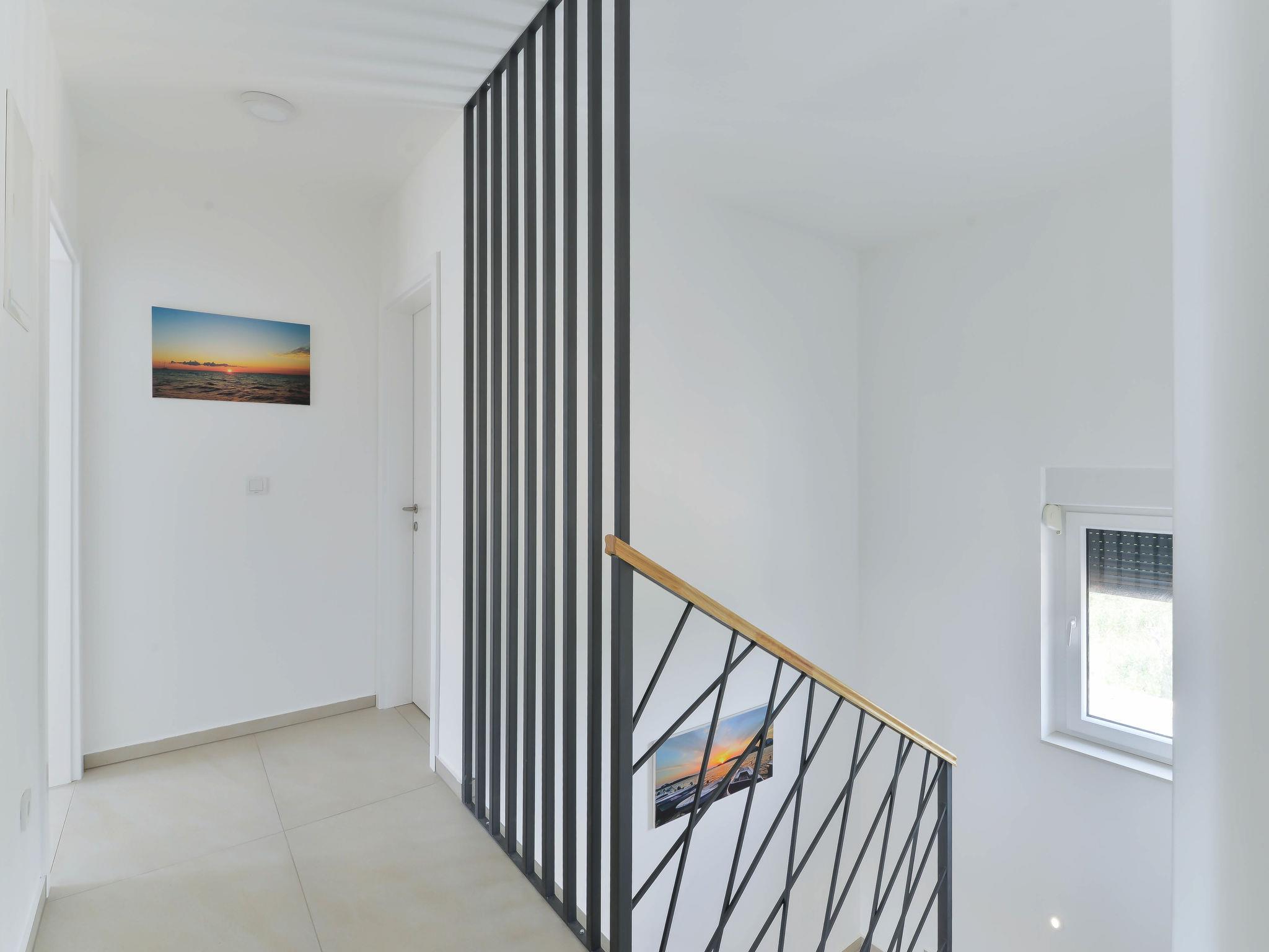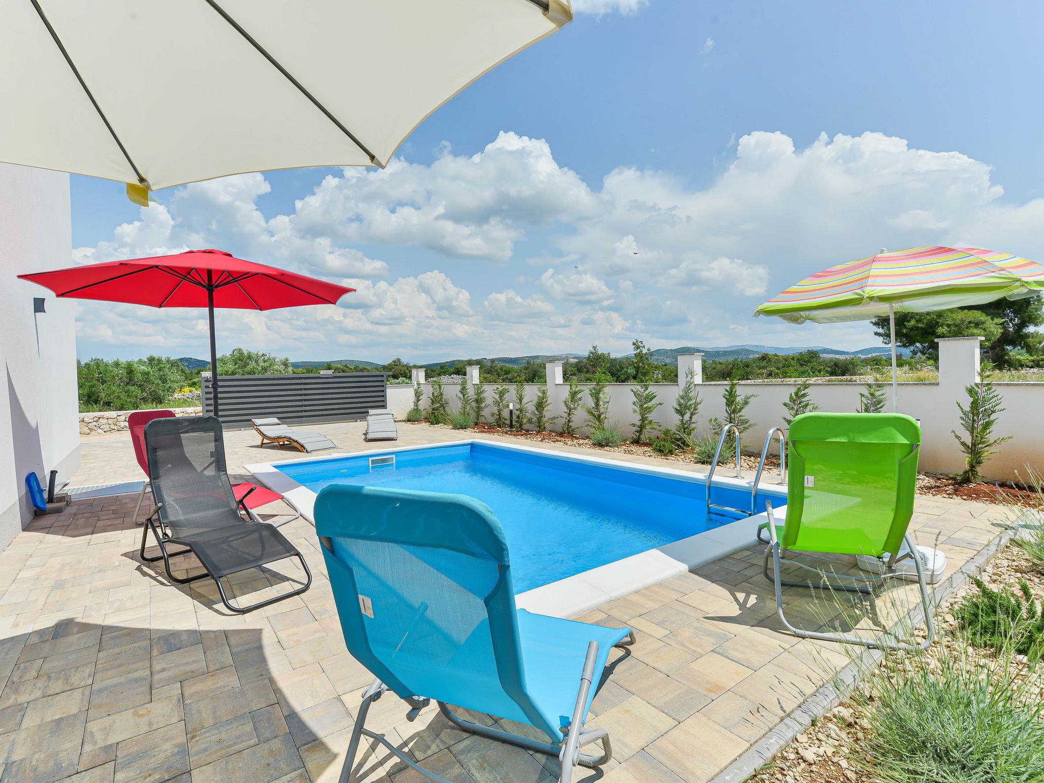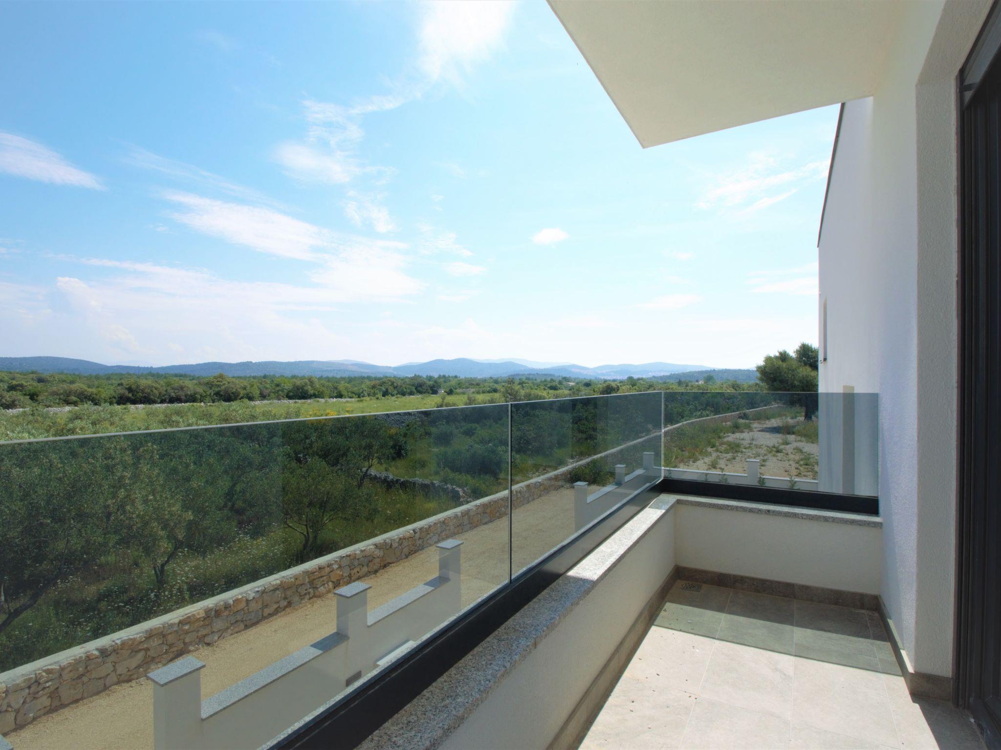 Jadrija 6 km from Vodice: Modern, beautiful semi-detached house "Sunrise", 2 storeys, built in 2023. In the hamlet Bogdanovici 4.5 km from the centre of Jadrija, in a quiet, sunny position, 1 km from the sea, 1 km from the beach. Private: property 390 m2, swimming pool angular (6 x 3 m, 21 m2, depth 150 cm, seasonal availability: 15.May. - 31.Oct.). Outdoor shower. In the house: internet access, washing machine. Parking (for 3 cars) at the house on the premises. Shop 4.5 km, restaurant 4.5 km, bus stop 6.3 km, rocky beach 1 km, public bathing area 5 km. Surf school 5 km. Nearby attractions: Aquapark 14 km, NP Krka 18 km. Please note: the photograph shows a typical example.