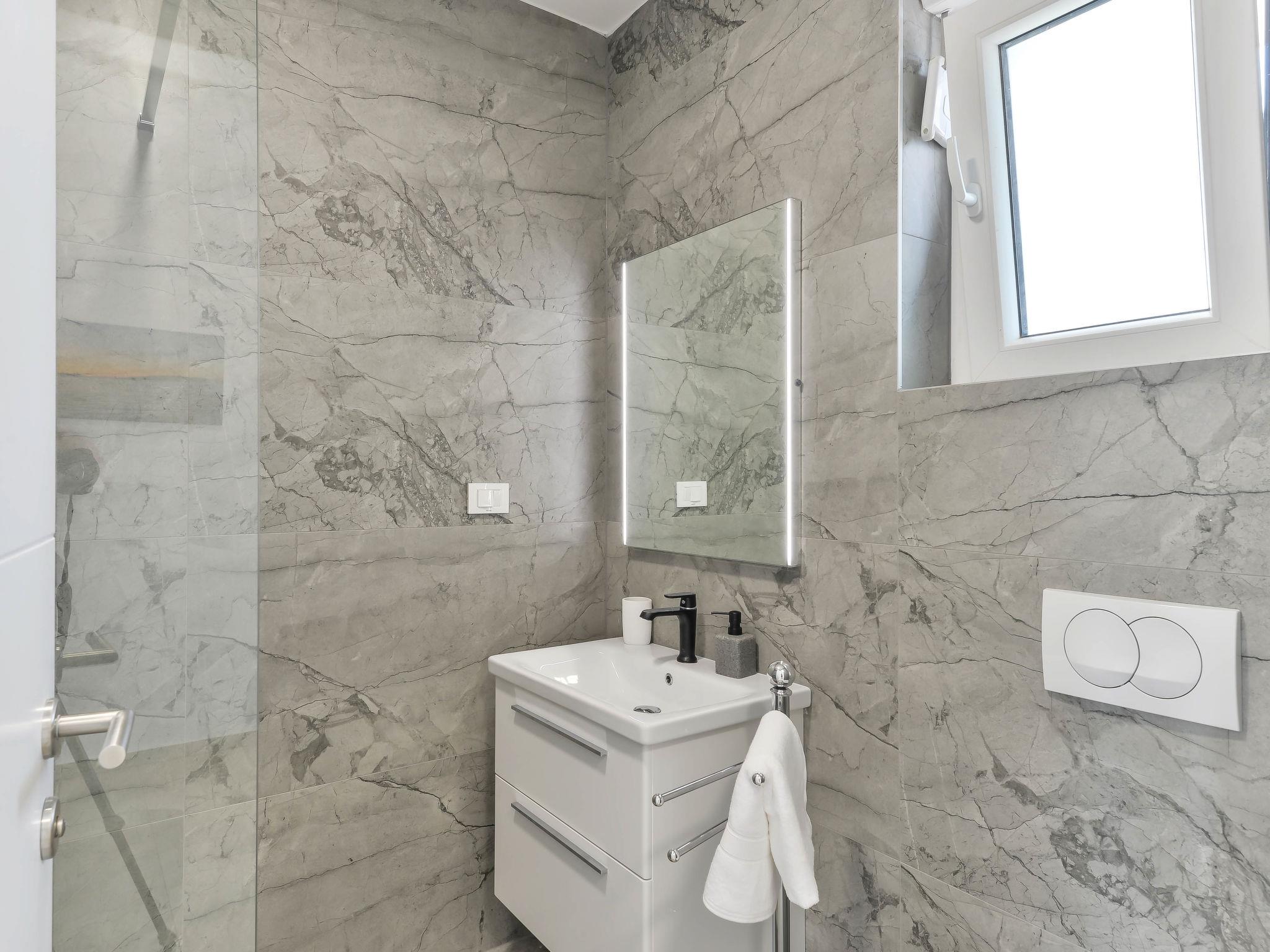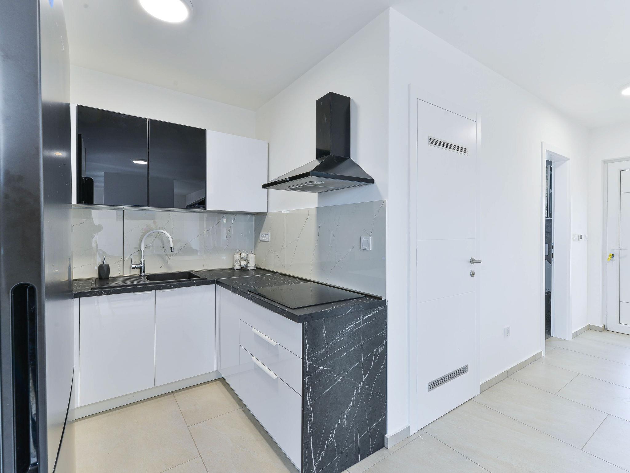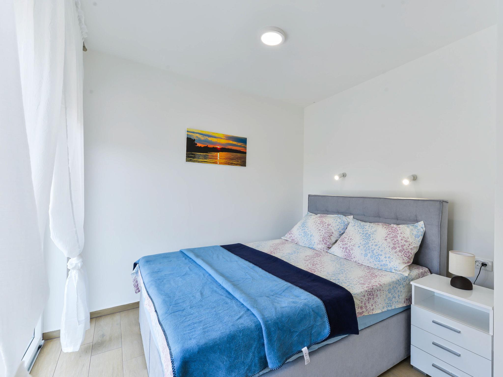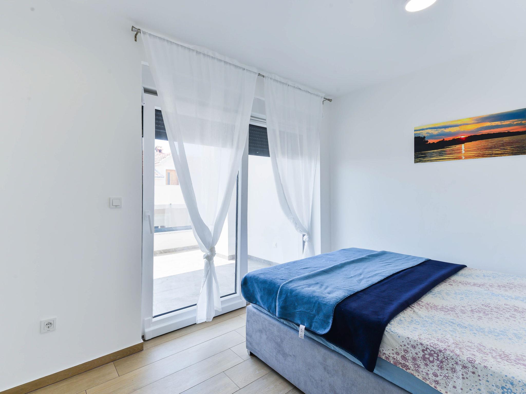 Jadrija 6 km from Vodice: Modern, beautiful semi-detached house "Sunrise", 2 storeys, built in 2023. In the hamlet Bogdanovici 4.5 km from the centre of Jadrija, in a quiet, sunny position, 1 km from the sea, 1 km from the beach. Private: property 390 m2, swimming pool angular (6 x 3 m, 21 m2, depth 150 cm, seasonal availability: 15.May. - 31.Oct.). Outdoor shower. In the house: internet access, washing machine. Parking (for 3 cars) at the house on the premises. Shop 4.5 km, restaurant 4.5 km, bus stop 6.3 km, rocky beach 1 km, public bathing area 5 km. Surf school 5 km. Nearby attractions: Aquapark 14 km, NP Krka 18 km. Please note: the photograph shows a typical example.