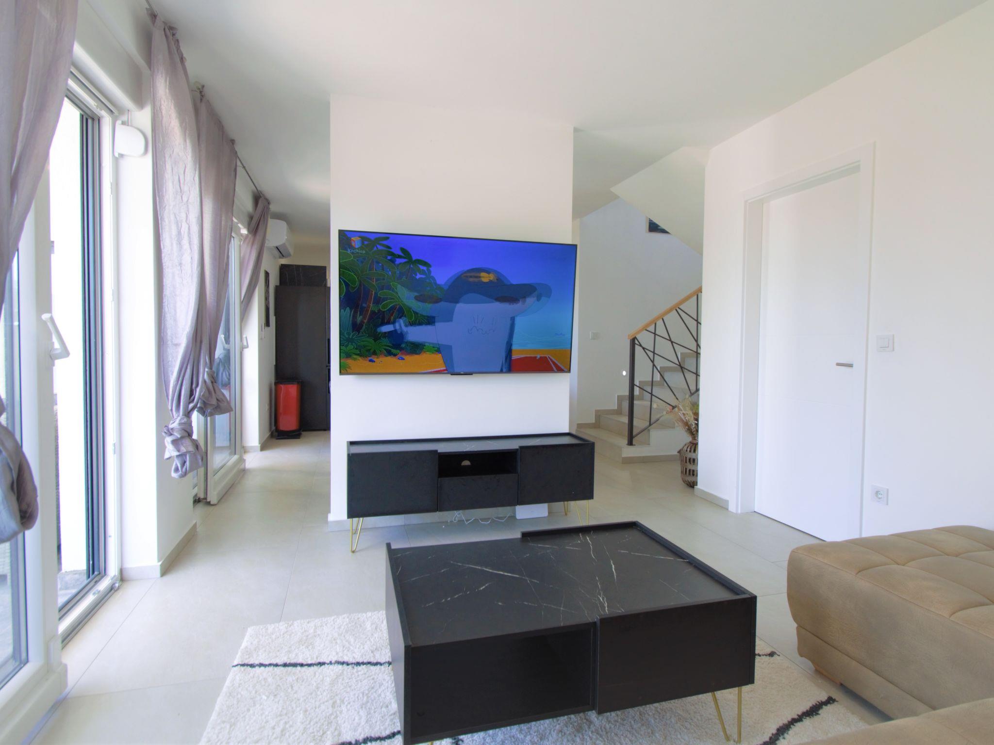 5-room semi-detached house 136 m2 on 2 levels, south-west facing position. Modern furnishings: living/dining room 22 m2 with satellite TV (flat screen), air conditioning. Exit to the terrace. 1 room with 1 french bed (140 cm, length 200 cm), satellite TV (flat screen), air conditioning. Open kitchen (oven, dishwasher, 4 ceramic glass hob hotplates, microwave, freezer, electric coffee machine). Exit to the terrace. Shower/WC. Upper floor: 1 room 20 m2 with 1 french bed (160 cm, length 200 cm), shower/WC and TV (flat screen), air conditioning. Exit to the terrace. 1 room with 1 french bed (160 cm, length 200 cm), TV (flat screen), air conditioning. Exit to the terrace. 1 room with 1 french bed (160 cm, length 200 cm), TV (flat screen), air conditioning. Exit to the balcony. Shower/WC. No heating option. Balcony 3 m2, terrace 15 m2 partly roofed terrace 25 m2 partly roofed. Terrace furniture, deck chairs. View of the swimming pool. Facilities: baby cot. Internet (WiFi, free). 1 small pet/ dog allowed.
