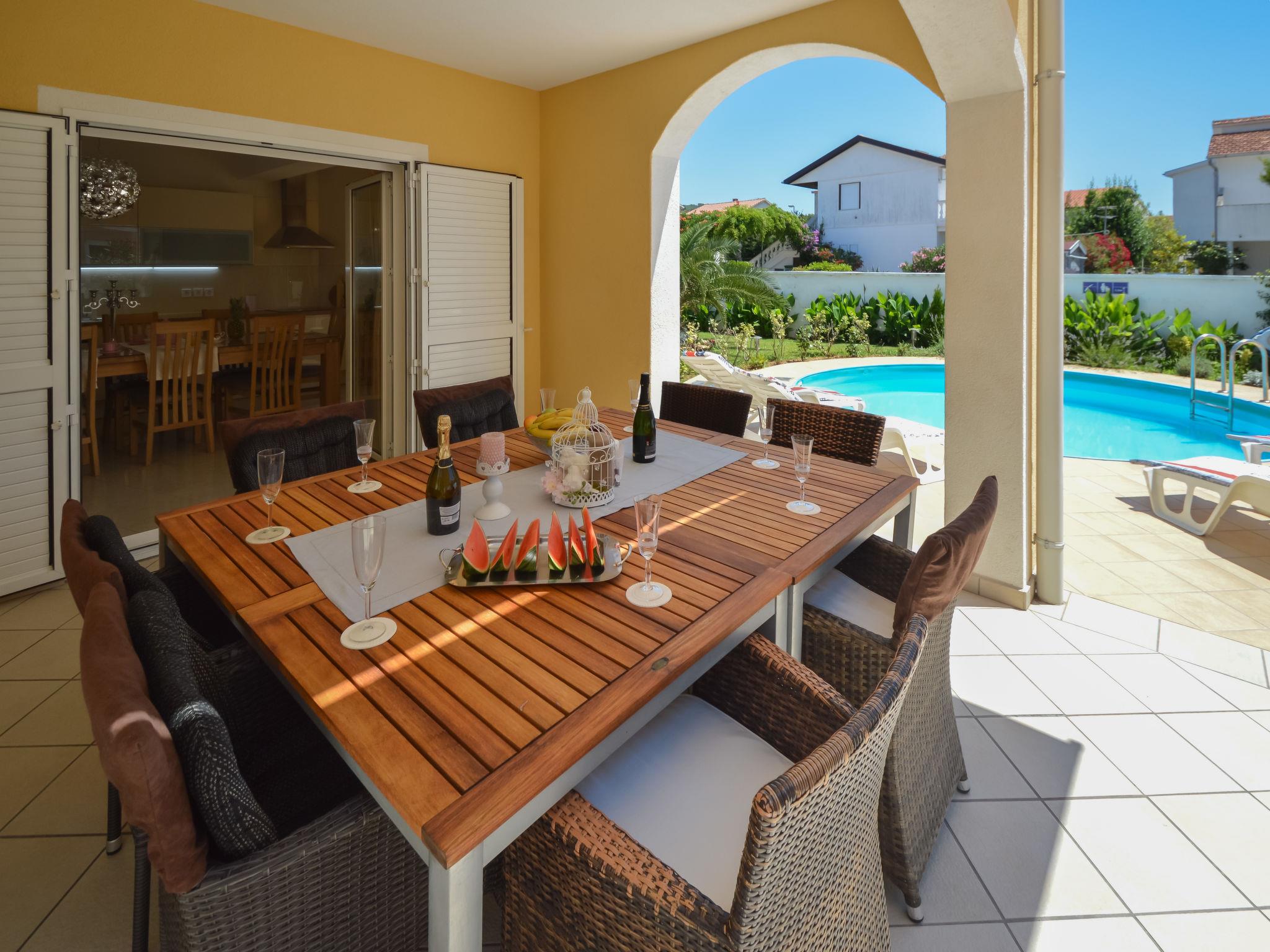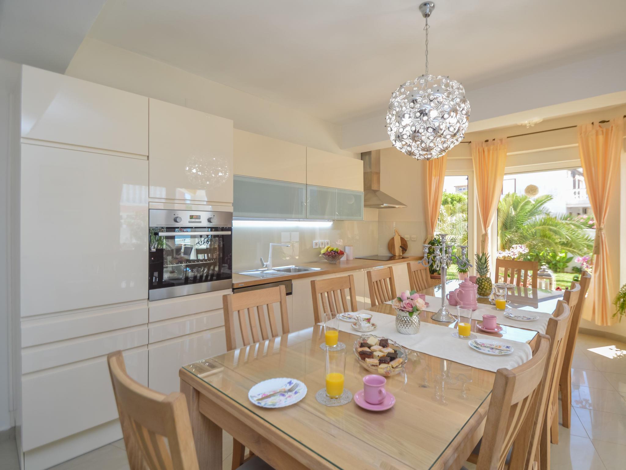 6-room semi-detached house 170 m2 on 2 levels. Comfortable and modern furnishings: living/dining room 50 m2 with satellite TV (flat screen), DVD and air conditioning. Exit to the terrace. 1 room with 1 french bed (180 cm, length 200 cm). 1 room with 1 french bed (180 cm, length 200 cm). Exit to the terrace. 1 room with 2 beds (90 cm, length 200 cm). Exit to the terrace. Open kitchen (oven, dishwasher, 4 ceramic glass hob hotplates, microwave, freezer, electric coffee machine). Shower/WC. Upper floor: 1 room 10 m2 with 1 french bed (160 cm, length 200 cm), shower/WC and satellite TV (flat screen), air conditioning. Exit to the terrace. 1 room with 1 french bed (160 cm, length 200 cm). Kitchen (2 ceramic glass hob hotplates) with dining table, air conditioning. Shower/WC. No heating option. Terrace 20 m2 partly roofed, 3 terraces 4 m2. Terrace furniture. View of the swimming pool. Facilities: baby cot. Internet (WiFi, free).