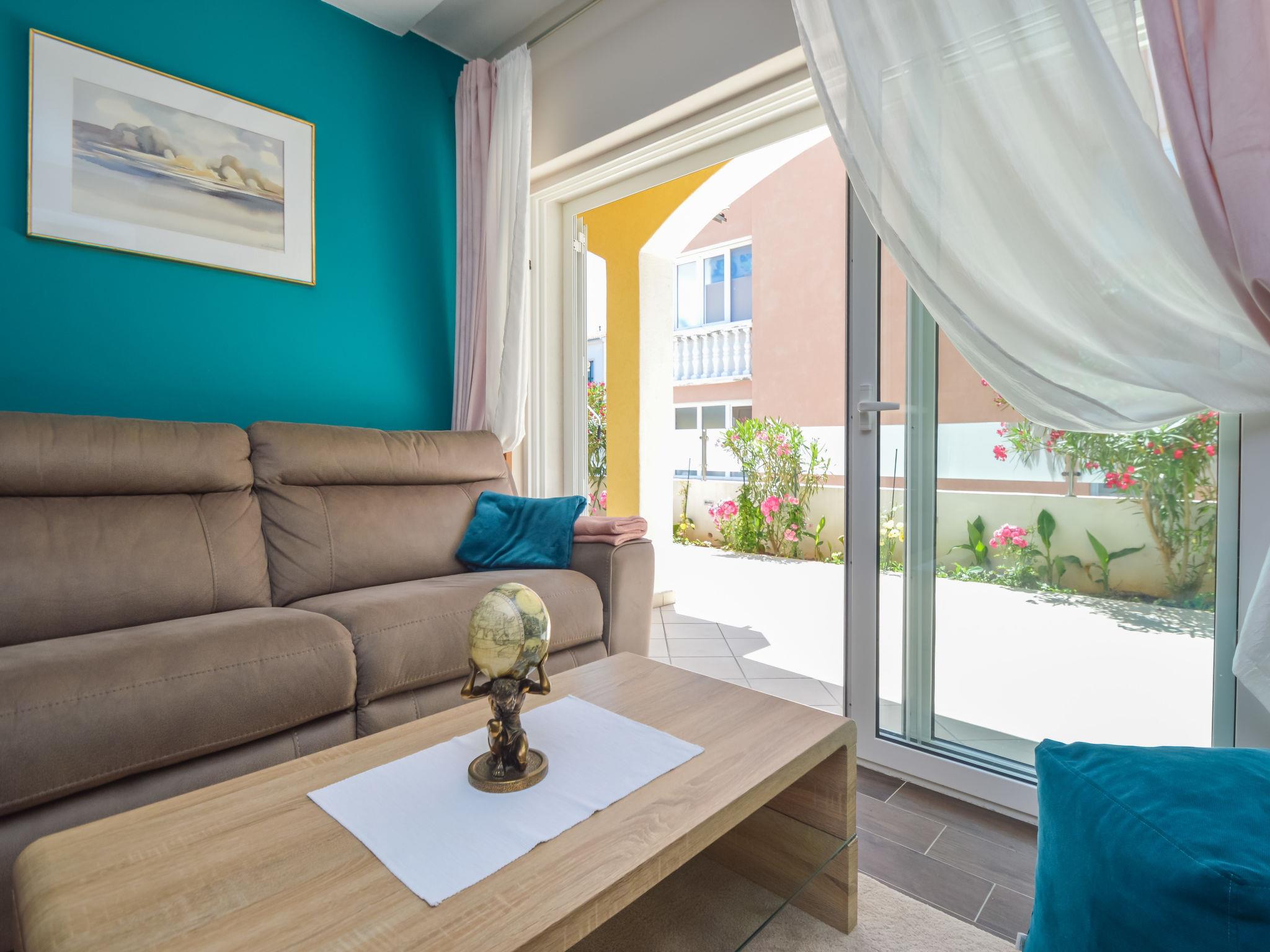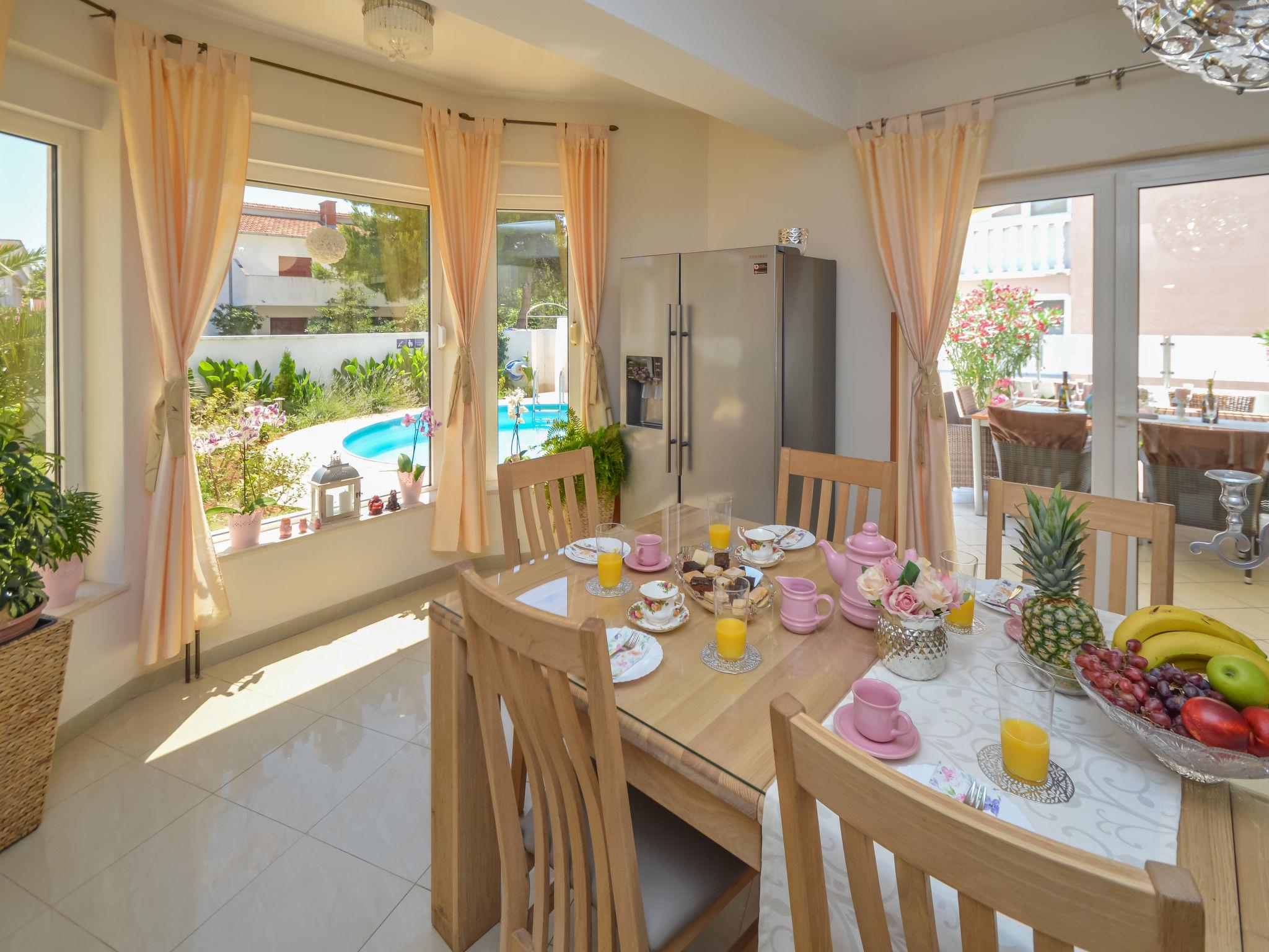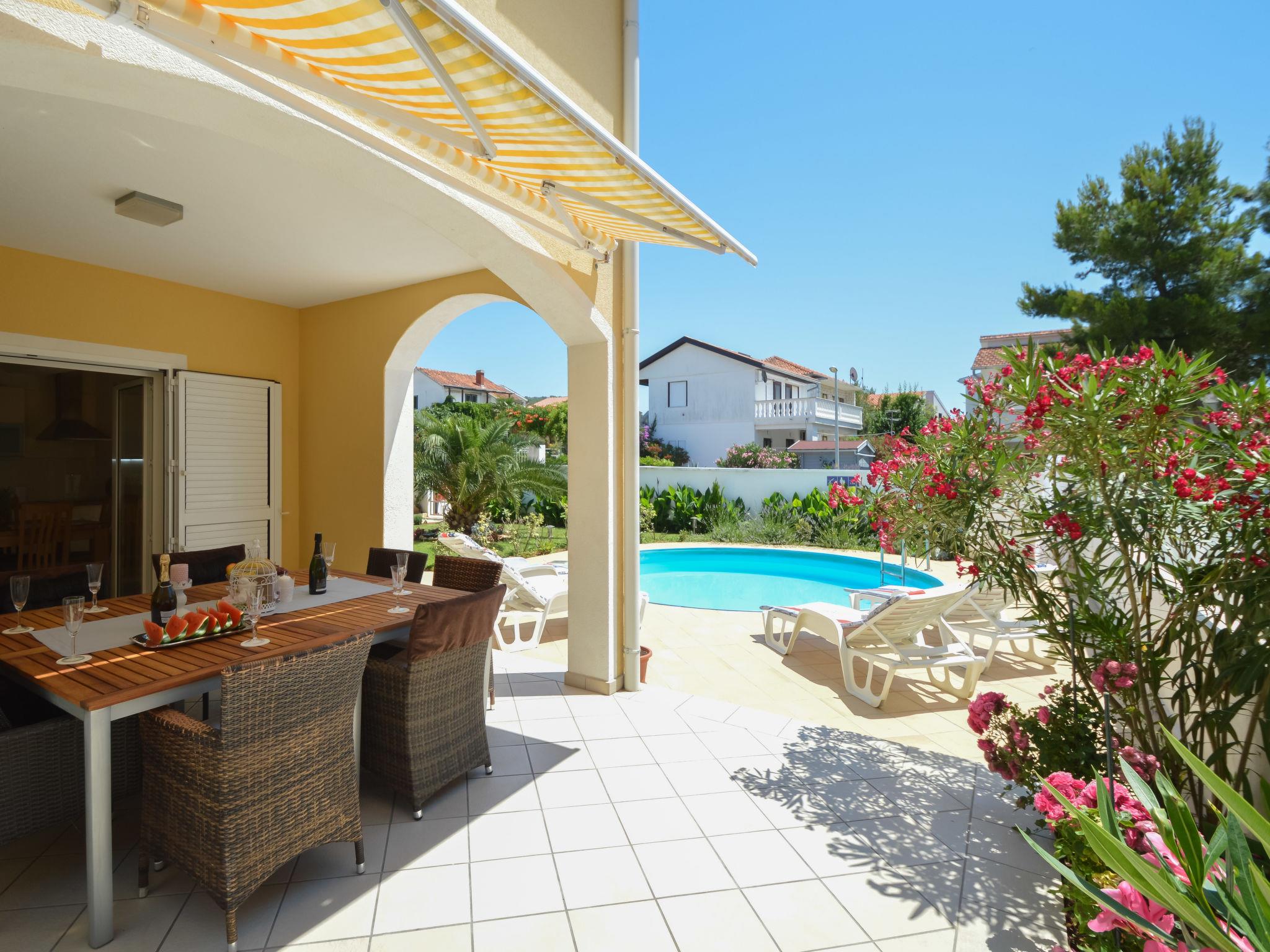 Tribunj 3 km from Vodice: Semi-detached house "Valdor", 2 storeys. In the hamlet Sovlje 1.5 km from the centre of Tribunj, in a quiet, sunny position, 500 m from the sea, 500 m from the beach, in a cul-de-sac. Private: property (fenced) with lawn, swimming pool round (5 m diameter, depth 110 cm, seasonal availability: 01.May. - 15.Oct.). Outdoor shower, terrace (12 m2), garden furniture, barbecue. In the house: internet access, washing machine. Parking at the house on the premises. Shop 1.5 km, restaurant 150 m, bus stop 4.8 km, pebble beach, rocky beach, concrete beach 500 m. The owner does not accept any youth groups. Neighbourhood highly sensitive to noise. Quietness and good behaviour expected. Concrete beach with showers in the bay of Sovlje, 500 m from the house.