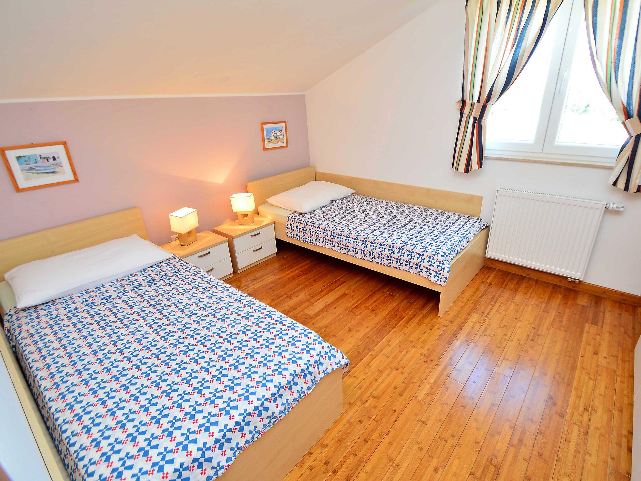 3-room apartment 60 m2. With sloping ceilings, modern and cosy furnishings: top floor: living/dining room, ceiling height 160 - 260 cm with 1 sofabed, satellite TV, flat screen, DVD and air conditioning. Exit to the terrace. 1 room, ceiling height 160 - 260 cm with 1 french bed (160 cm, length 200 cm). 1 room, ceiling height 160 - 260 cm with 2 beds (90 cm, length 200 cm). Open kitchen (dishwasher, 2 ceramic glass hob hotplates, microwave, freezer) with air conditioning. Shower/WC. No heating option. Terrace 8 m2. Terrace furniture. View of the sea. Facilities: washing machine, safe. Internet (WiFi, free).