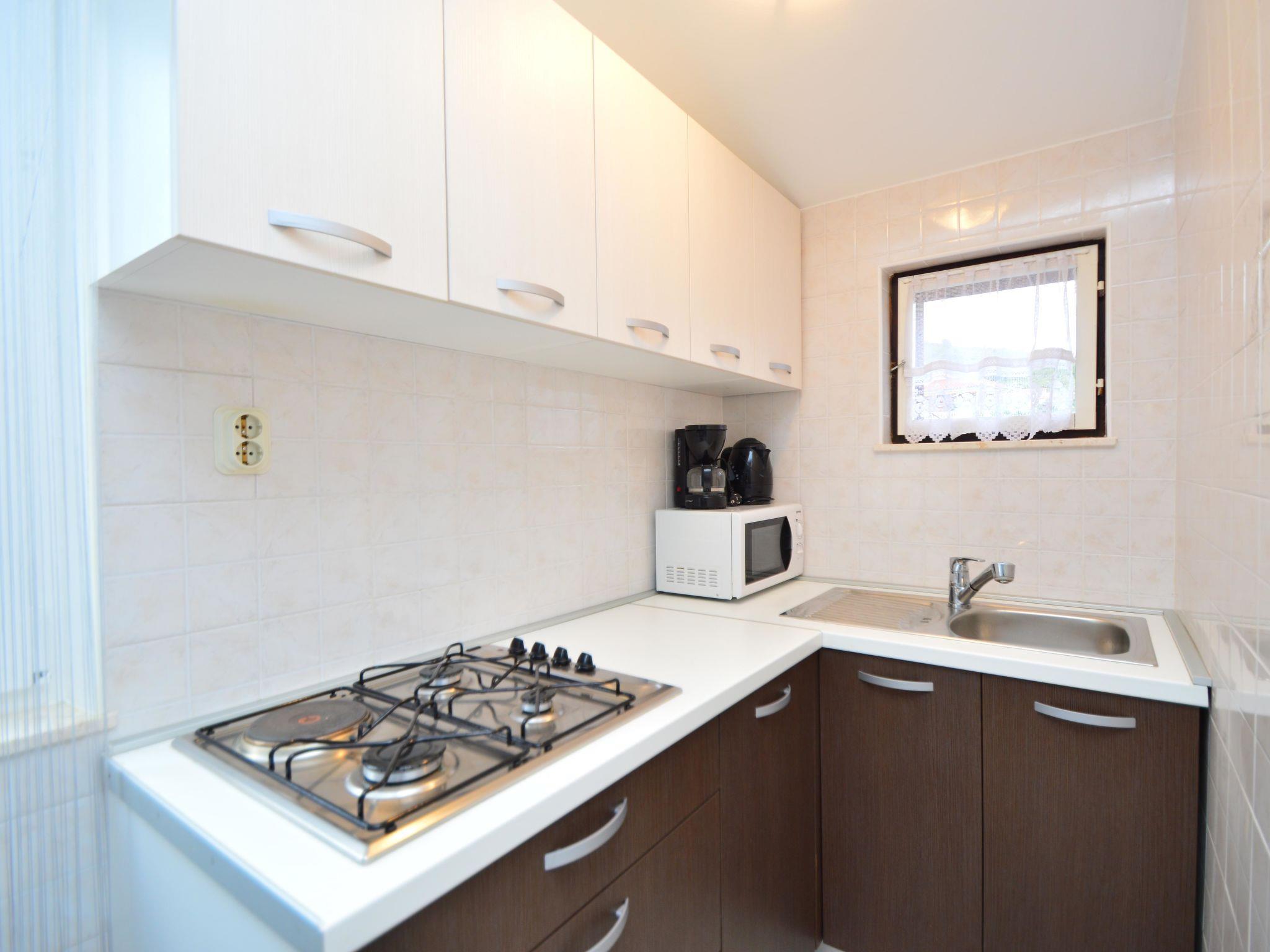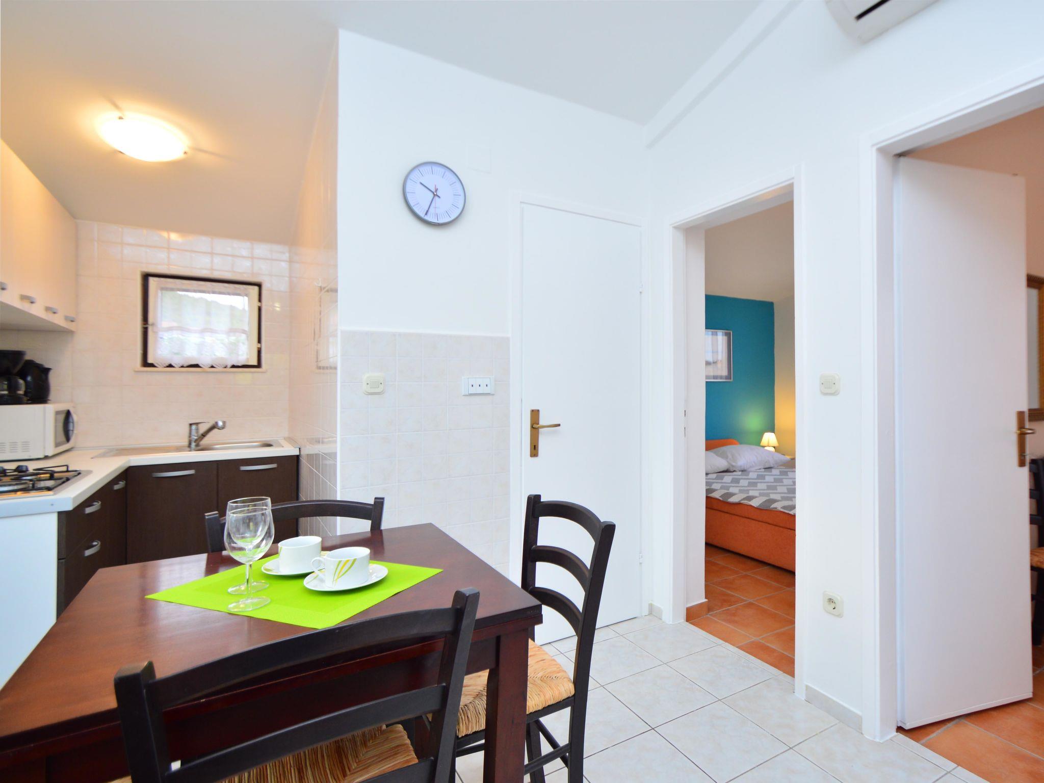3-room apartment 38 m2 on 1st floor, south-west facing position. Living/dining room with TV (flat screen), air conditioning. Exit to the terrace. 1 room with 1 french bed (140 cm, length 200 cm). 1 room with 1 french bed (160 cm, length 200 cm). Open kitchen (4 hot plates, microwave, freezer, electric coffee machine). Shower/WC. No heating option. Terrace 8 m2, roofed. Terrace furniture. Partial view of the swimming pool. Facilities: Internet (WiFi, free). Parking (fenced). Maximum 1 pet/ dog allowed.
