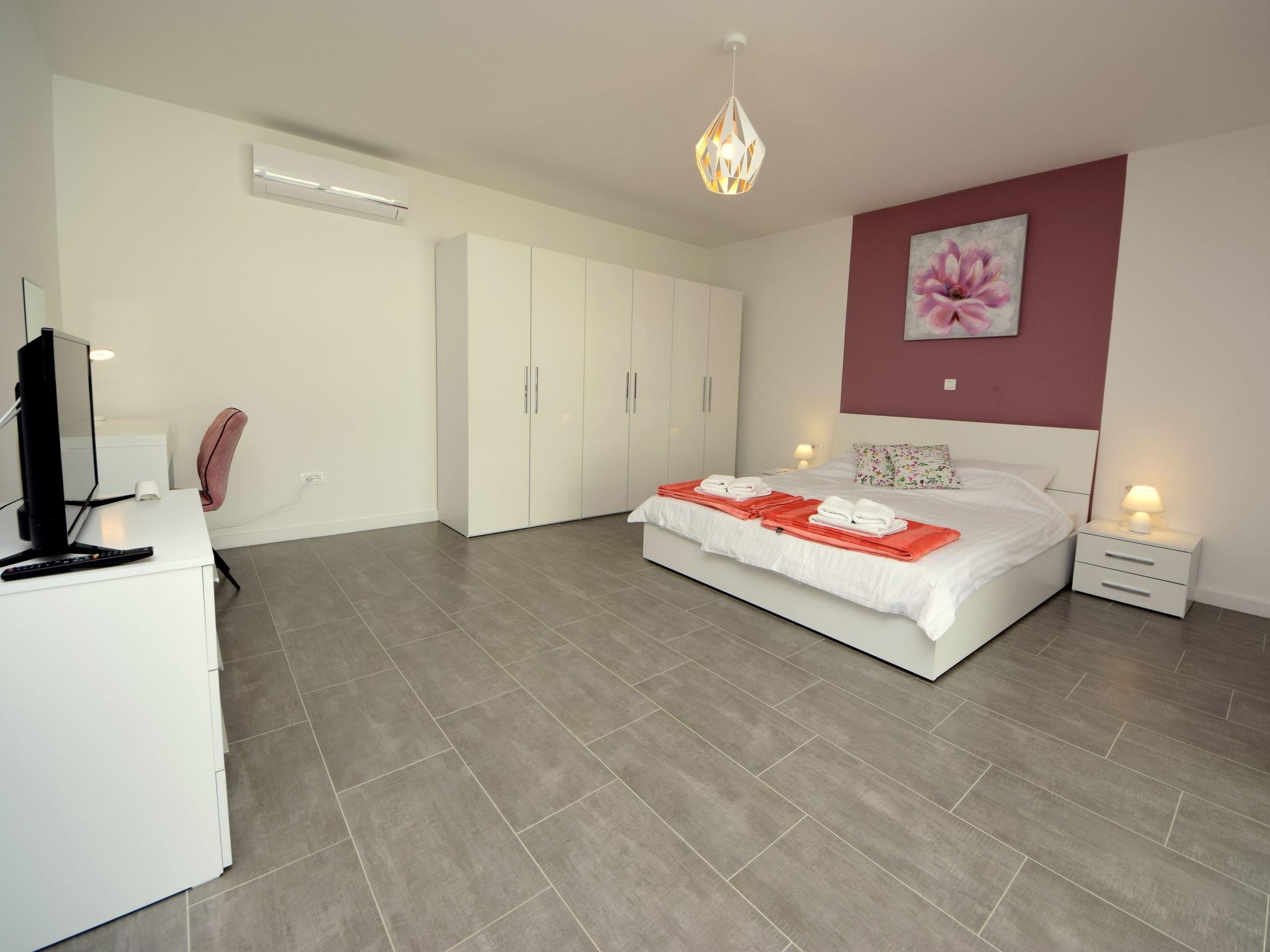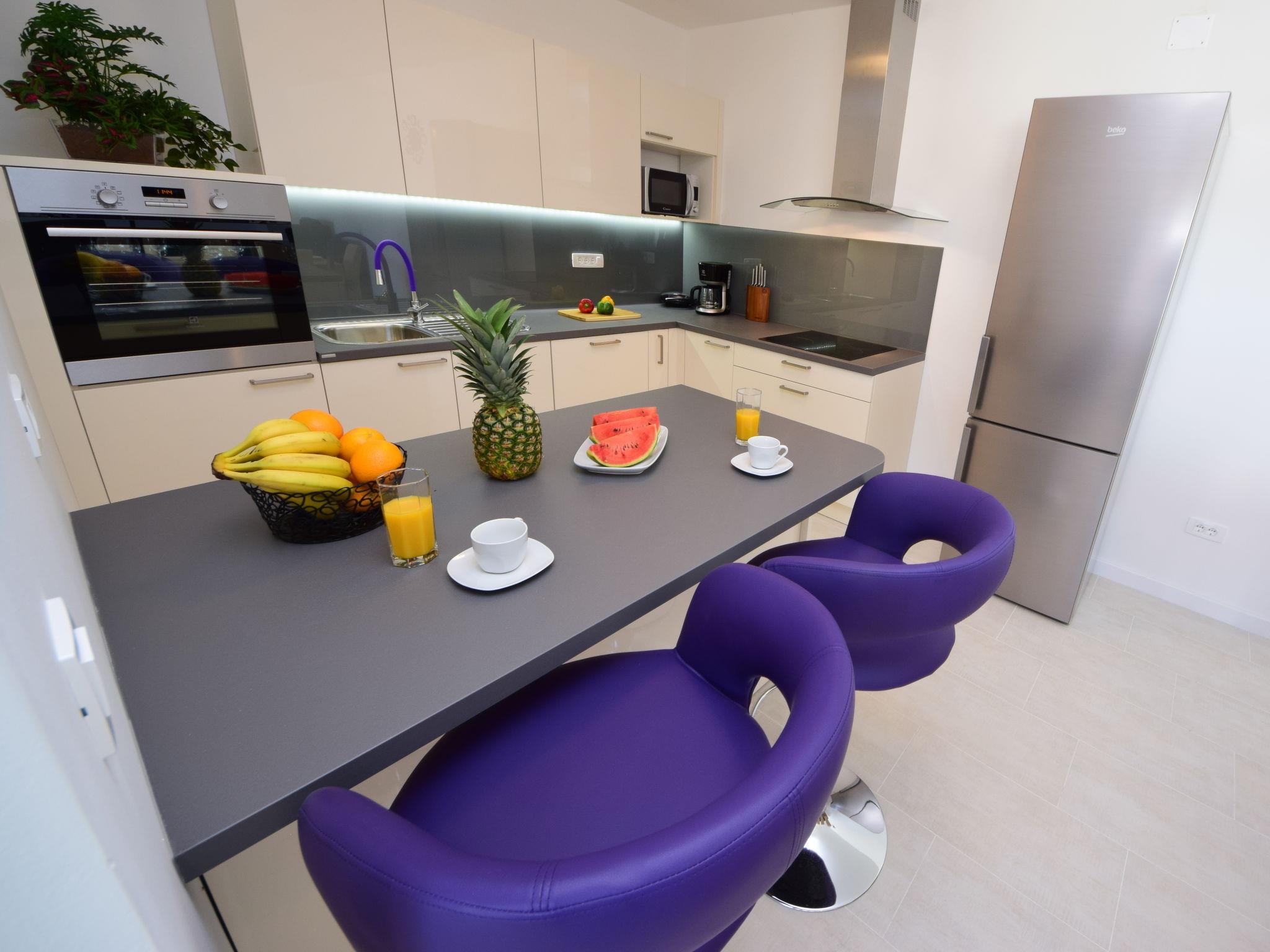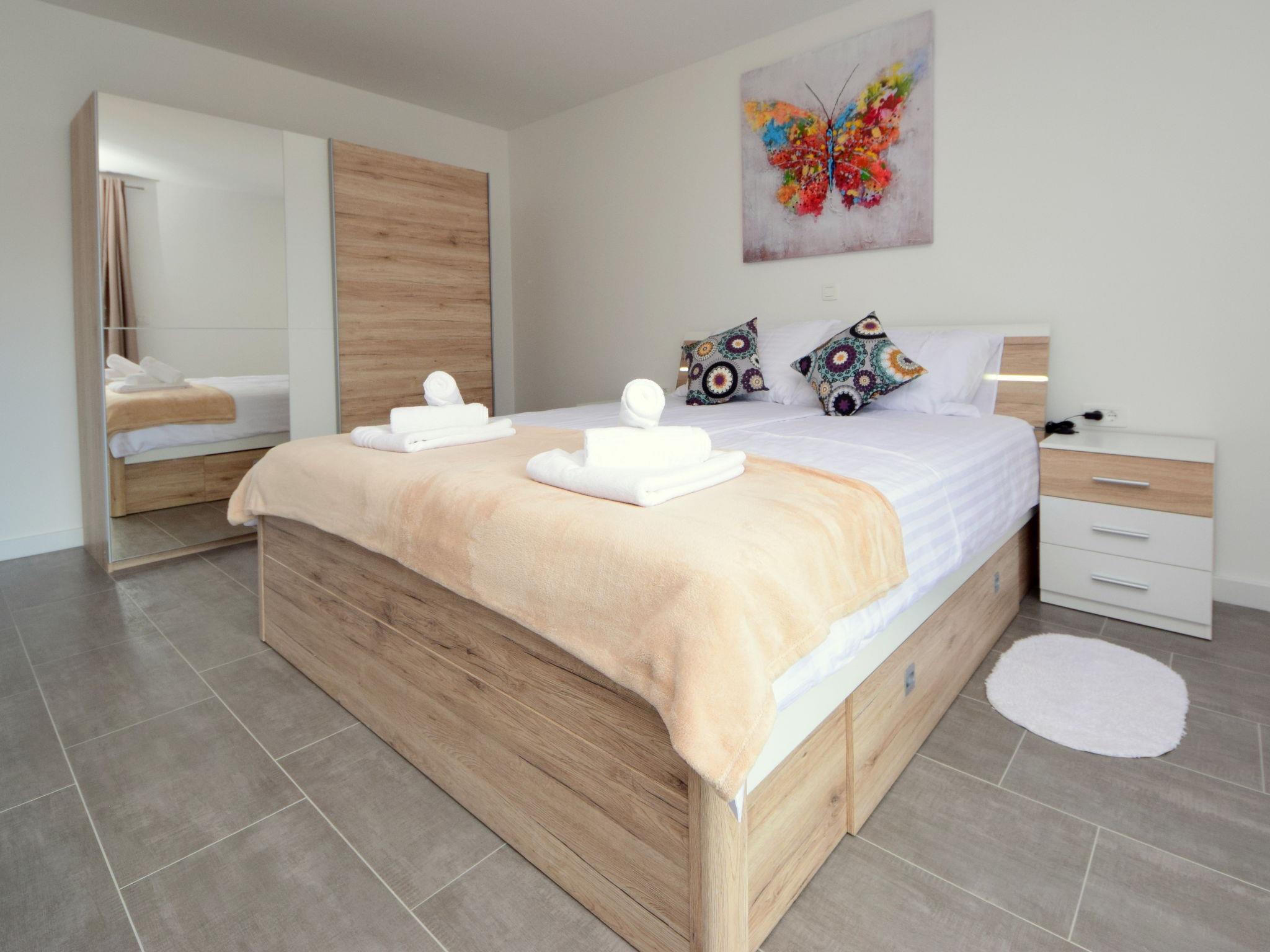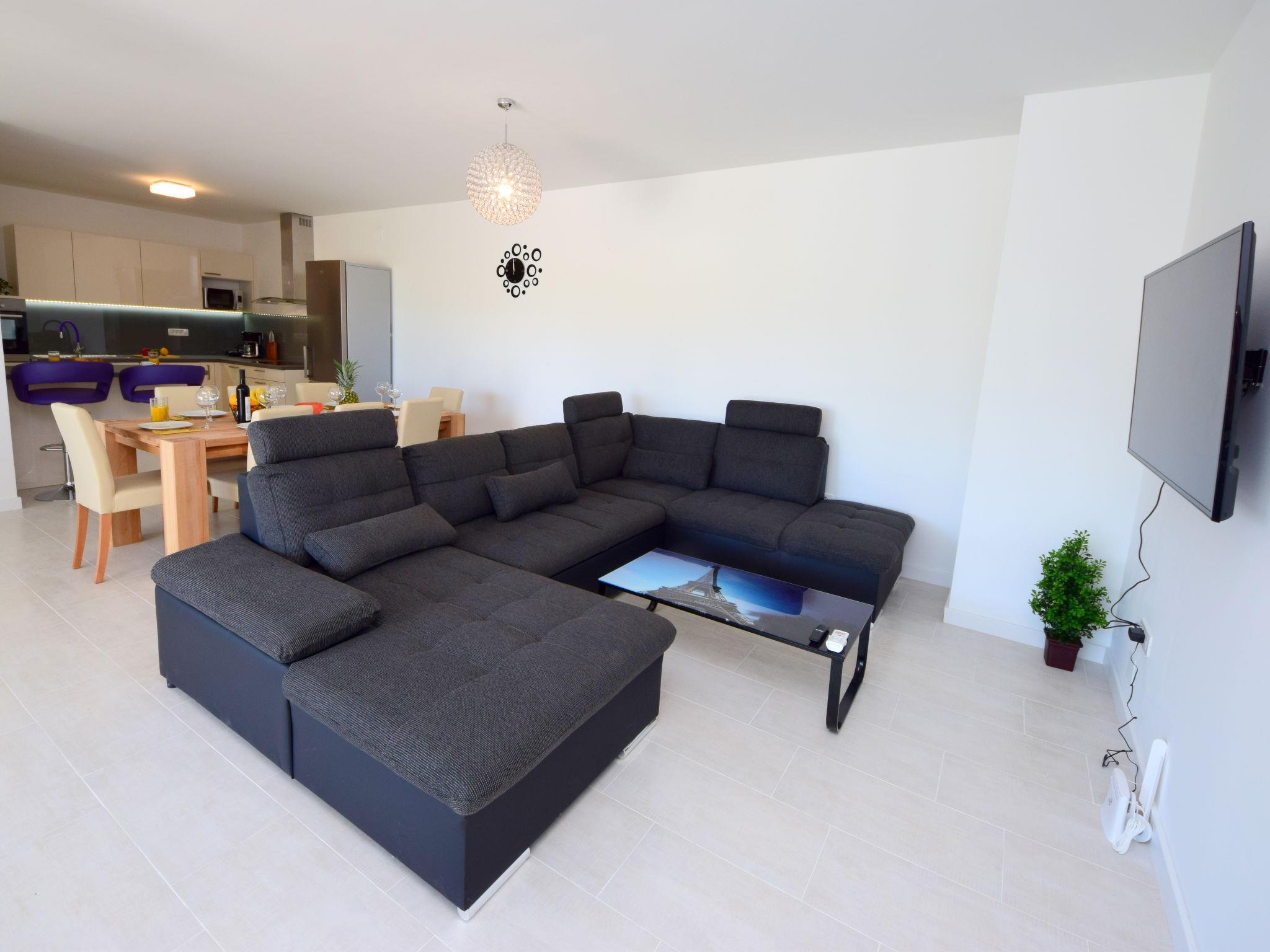 5-room semi-detached house 260 m2 on 2 levels, south-west facing position. Modern furnishings: living/dining room 40 m2 with 1 double sofabed (150 cm, length 220 cm), satellite TV (flat screen), air conditioning. Exit to the terrace. 1 room 40 m2 with 1 french bed (180 cm, length 200 cm), shower/WC and satellite TV (flat screen), air conditioning. Exit to the terrace. Open kitchen (oven, dishwasher, 4 ceramic glass hob hotplates, toaster, kettle, microwave, freezer, electric coffee machine). Sep. WC. Upper floor: 1 room 30 m2 with 1 french bed (180 cm, length 200 cm), shower/WC and satellite TV (flat screen), air conditioning. Exit to the terrace. 1 room 40 m2 with 1 french bed (180 cm, length 200 cm), shower/WC and satellite TV (flat screen), air conditioning. Exit to the terrace. 1 room 30 m2 with 1 french bed (180 cm, length 200 cm), shower/WC and satellite TV (flat screen), air conditioning. Exit to the terrace. Forced-air heating. Terrace 55 m2 partly roofed, terrace 12 m2 partly roofed. Terrace furniture, deck chairs. View of the swimming pool. Facilities: safe, iron, baby cot. Internet (WiFi, free). Terrace 10 m2. 13460