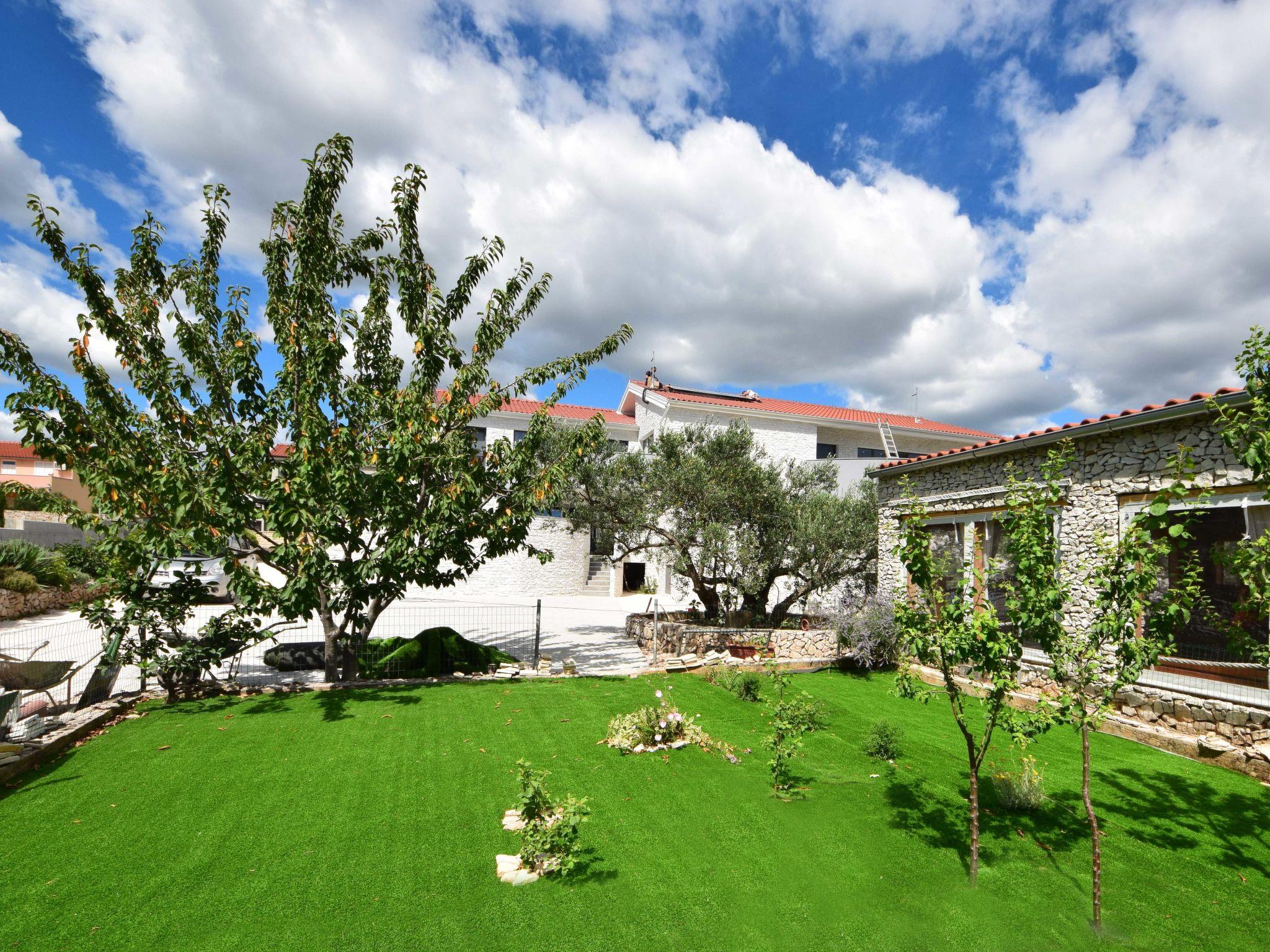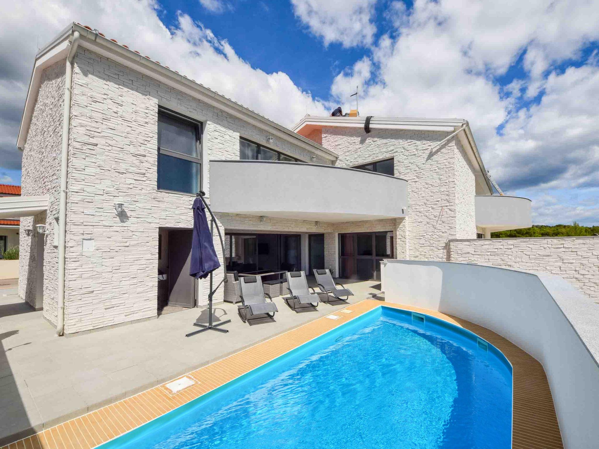 Tribunj 5 km from Vodice: Semi-detached house "West", 2 storeys, built in 2018. In the hamlet Sovlje 1.5 km from the centre of Tribunj, in a quiet, sunny position, 250 m from the sea, 450 m from the beach. For shared use: property 400 m2. Garden furniture, barbecue, children's playground (slide, swing). Private: swimming pool heated (20 m2, depth 150 cm, seasonal availability: 01.May. - 31.Oct.) with internal staircase. Unconventional pool shape. WC in the pool area, outdoor shower. In the house: internet access, washing machine, tumble dryer. Cook on request (extra). Parking (for 3 cars) at the house on the premises. Shop 1 km, restaurant 200 m, bus stop 5.2 km, pebble beach, concrete beach 450 m.