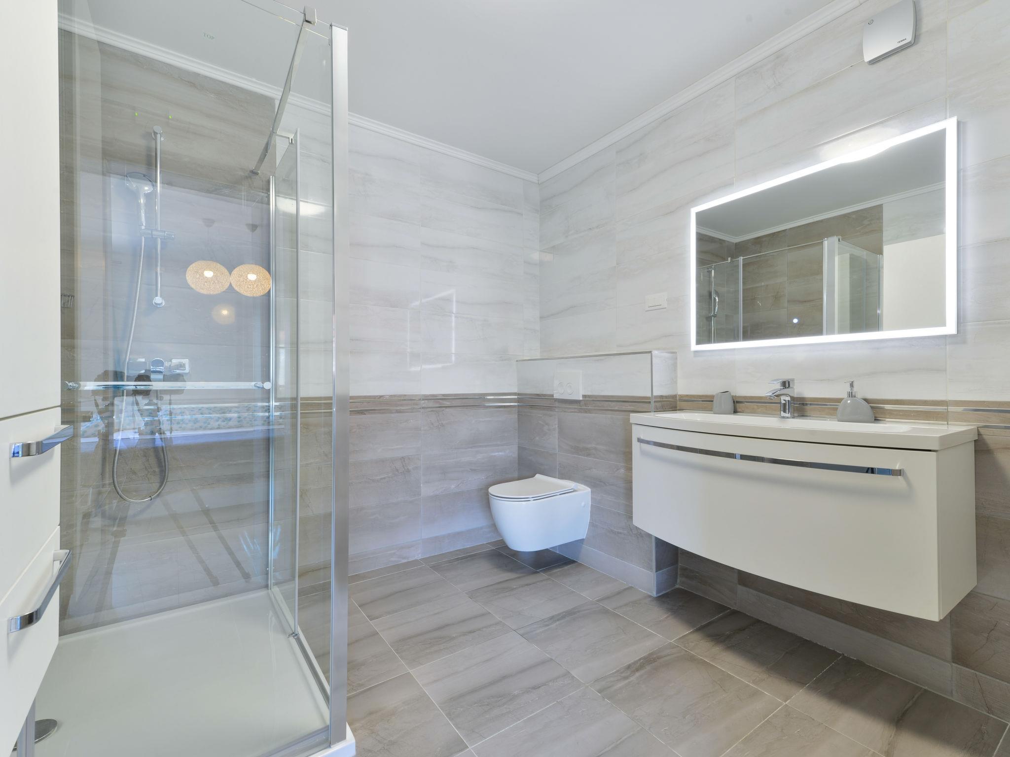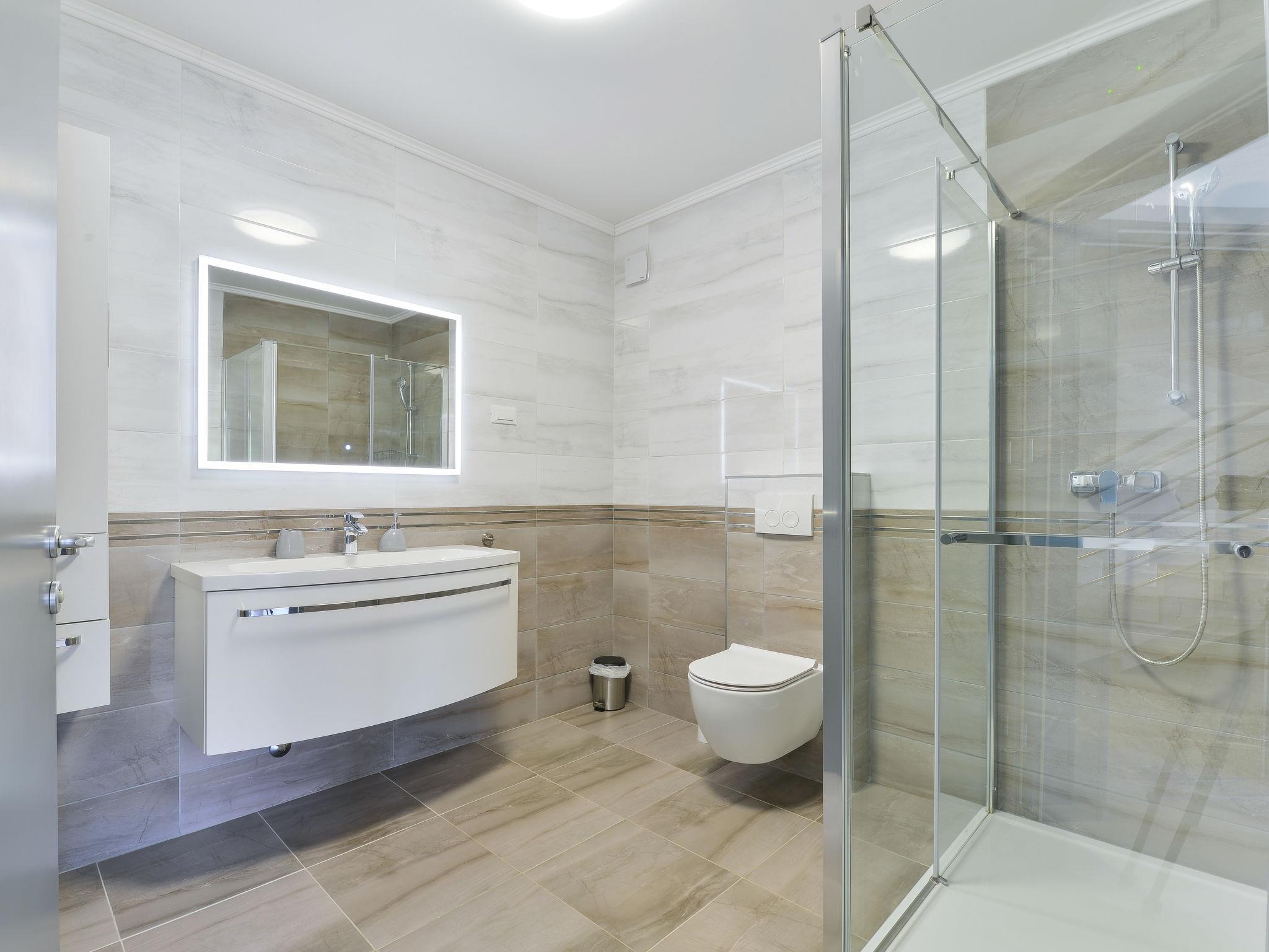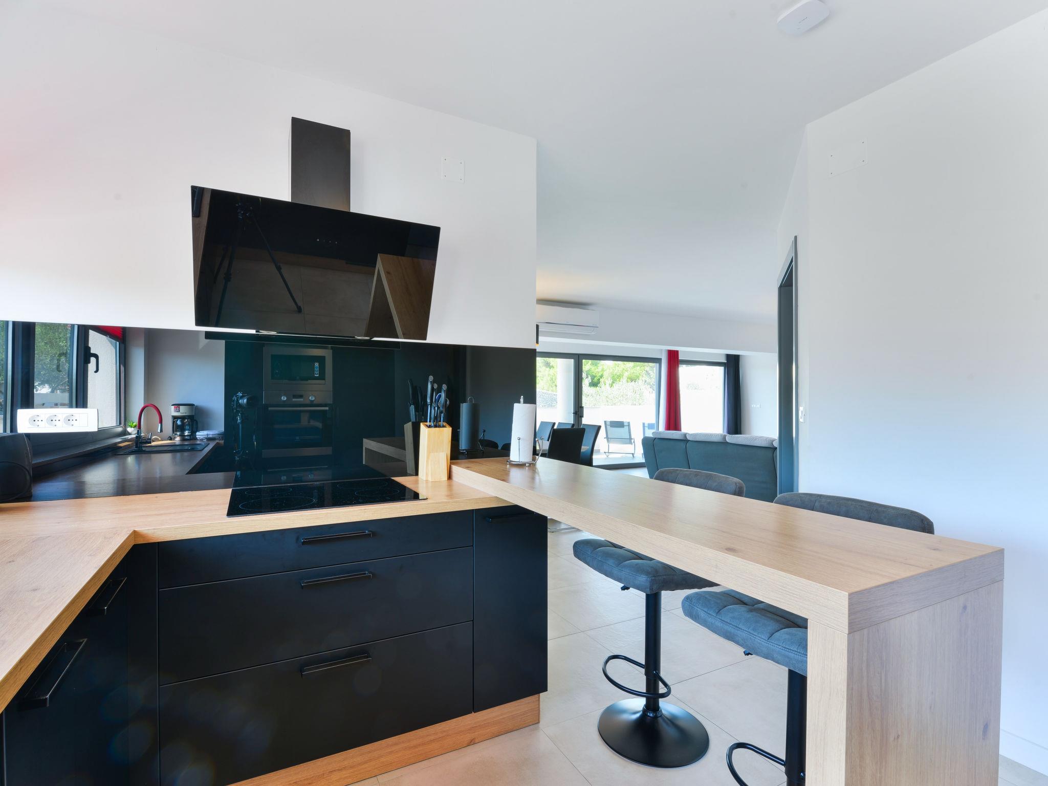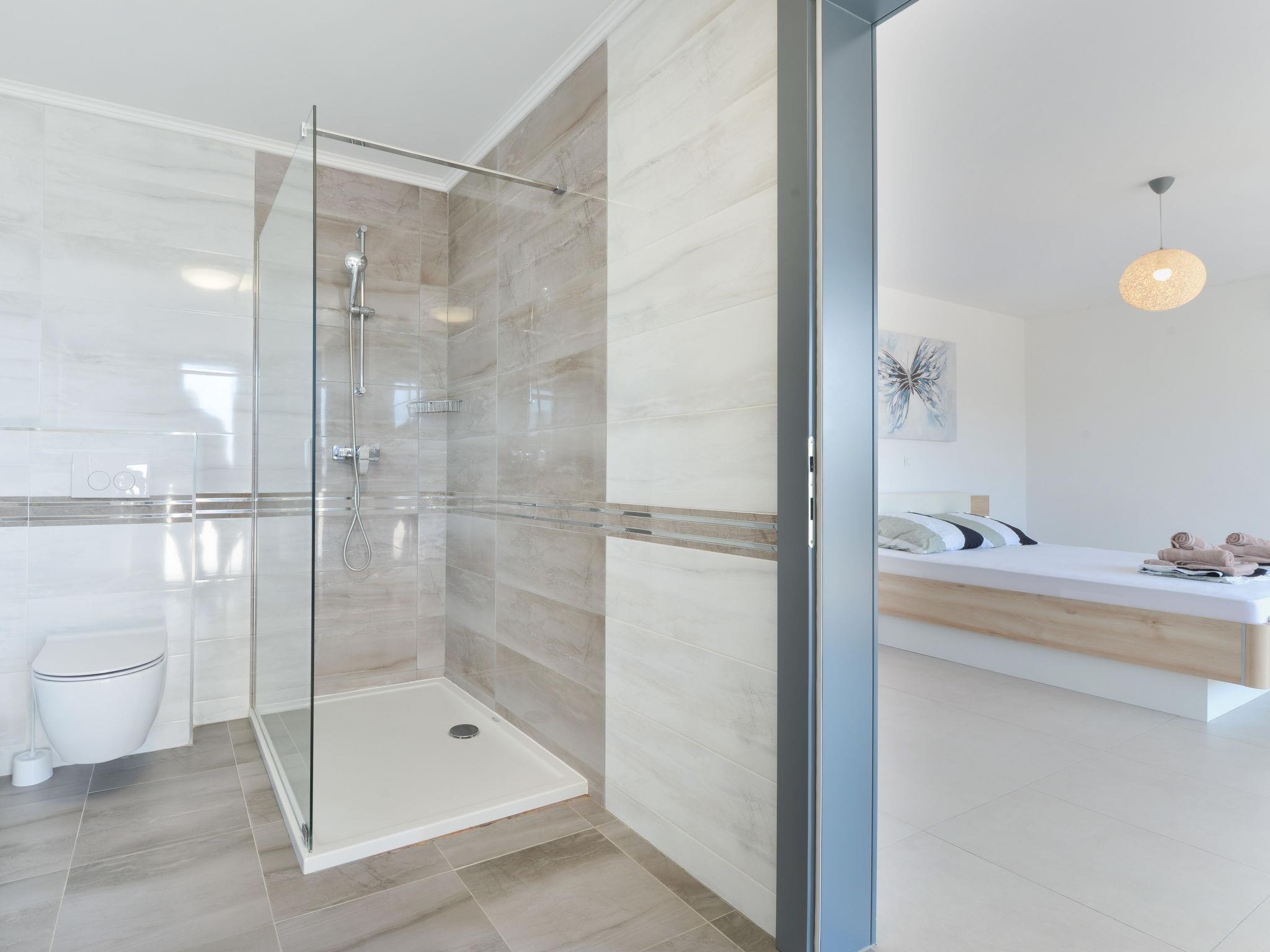 5-room semi-detached house 260 m2 on 2 levels, south-east facing position. Modern furnishings: living/dining room 45 m2 with 1 sofabed (125 cm, length 220 cm), 1 folding bed (80 cm, length 190 cm), satellite TV (flat screen), air conditioning. Exit to the terrace. 1 room 20 m2 with 1 french bed (180 cm, length 200 cm), shower/WC and satellite TV (flat screen), air conditioning. Exit to the balcony. Open kitchen (oven, dishwasher, 4 ceramic glass hob hotplates, toaster, kettle, microwave, freezer, electric coffee machine). Sep. WC. Upper floor: 2 rooms 20 m2, each room with 1 french bed (180 cm, length 200 cm), shower/WC and satellite TV (flat screen), air conditioning. Exit to the terrace. 1 room 20 m2 with 1 french bed (180 cm, length 200 cm), shower/WC and satellite TV (flat screen), air conditioning. Exit to the balcony. Forced-air heating. 2 balconies 6 m2, terrace 80 m2 partly roofed, terrace 38 m2, roofed. Terrace furniture, deck chairs. View of the swimming pool. Facilities: safe, iron, baby cot. Internet (WiFi, free). 13460