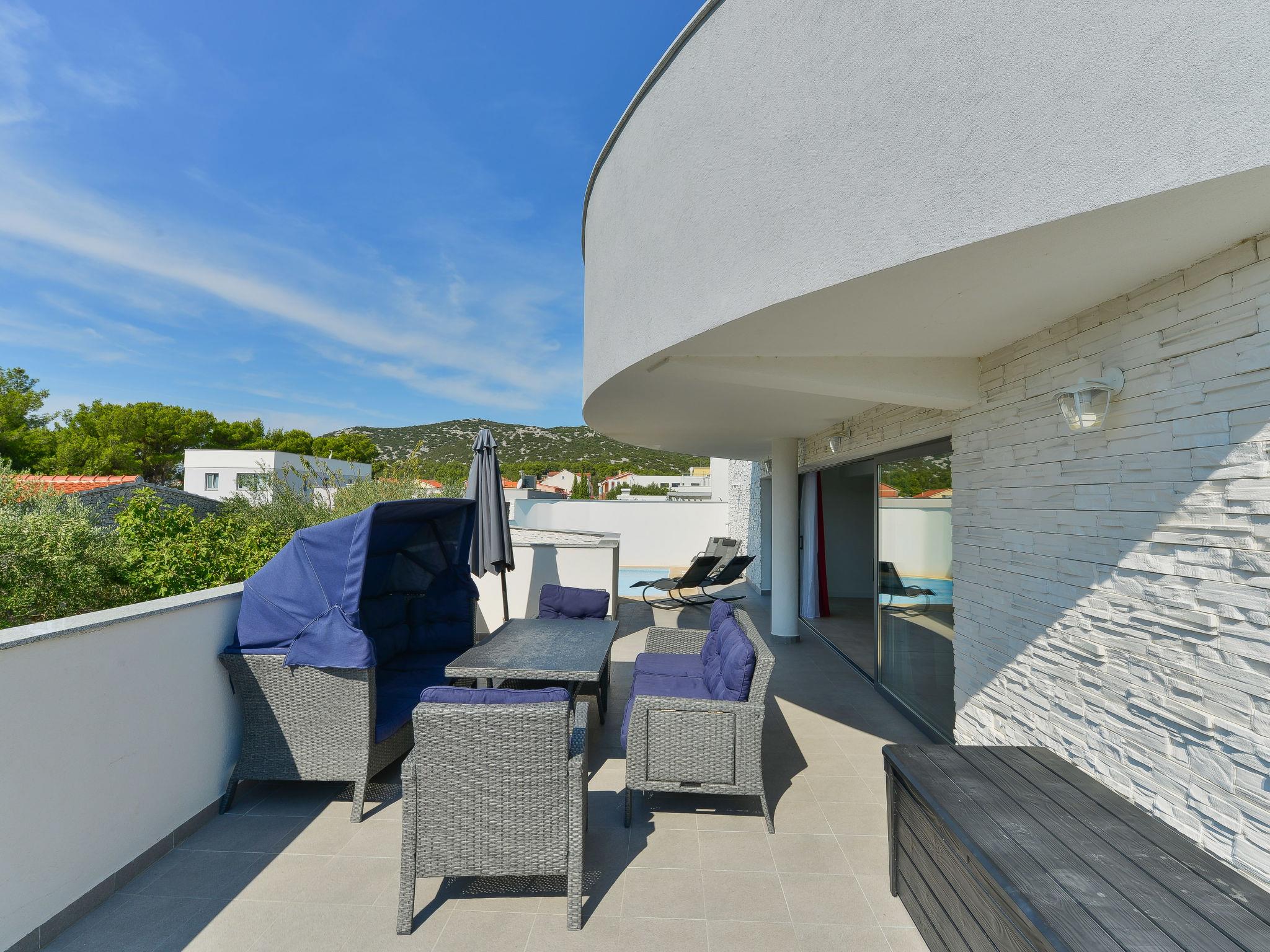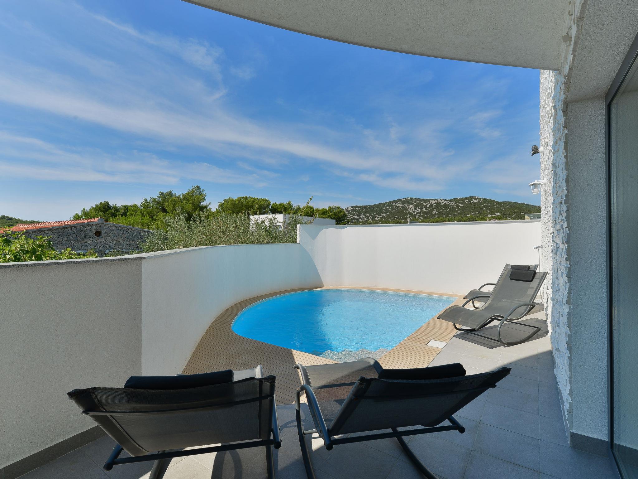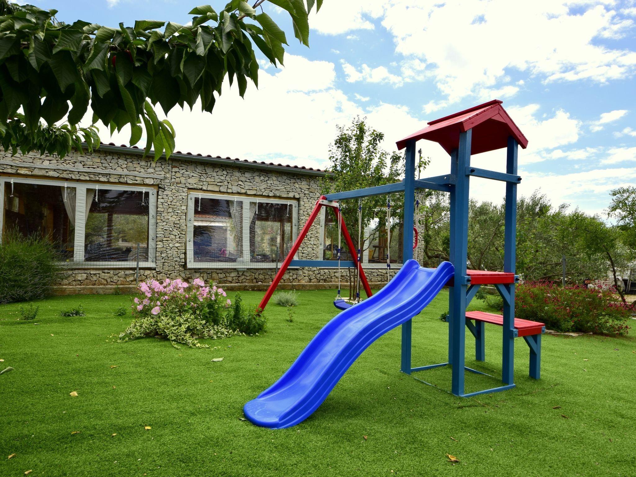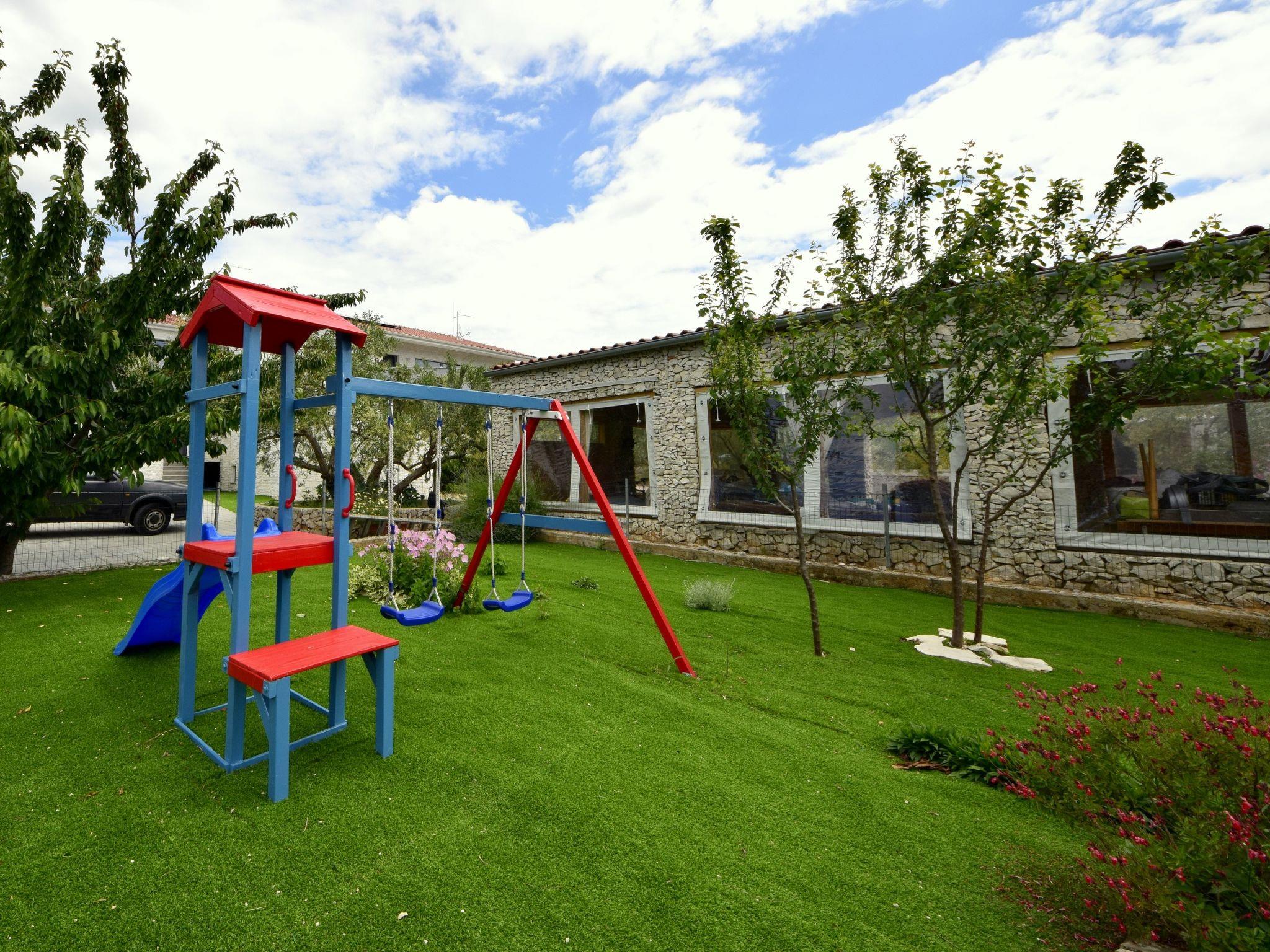 Tribunj 5 km from Vodice: Semi-detached house "East", 2 storeys, built in 2018. In the hamlet Sovlje 1.5 km from the centre of Tribunj, in a quiet, sunny position, 250 m from the sea, 450 m from the beach. For shared use: property 400 m2. Garden furniture, barbecue, children's playground (slide, swing). Private: swimming pool heated (20 m2, depth 150 cm, seasonal availability: 01.May. - 31.Oct.) with internal staircase. Unconventional pool shape. WC in the pool area, outdoor shower. In the house: internet access, washing machine, tumble dryer. Cook on request (extra). Parking (for 3 cars) at the house on the premises. Shop 1 km, restaurant 200 m, bus stop 5.2 km, pebble beach, concrete beach 450 m.