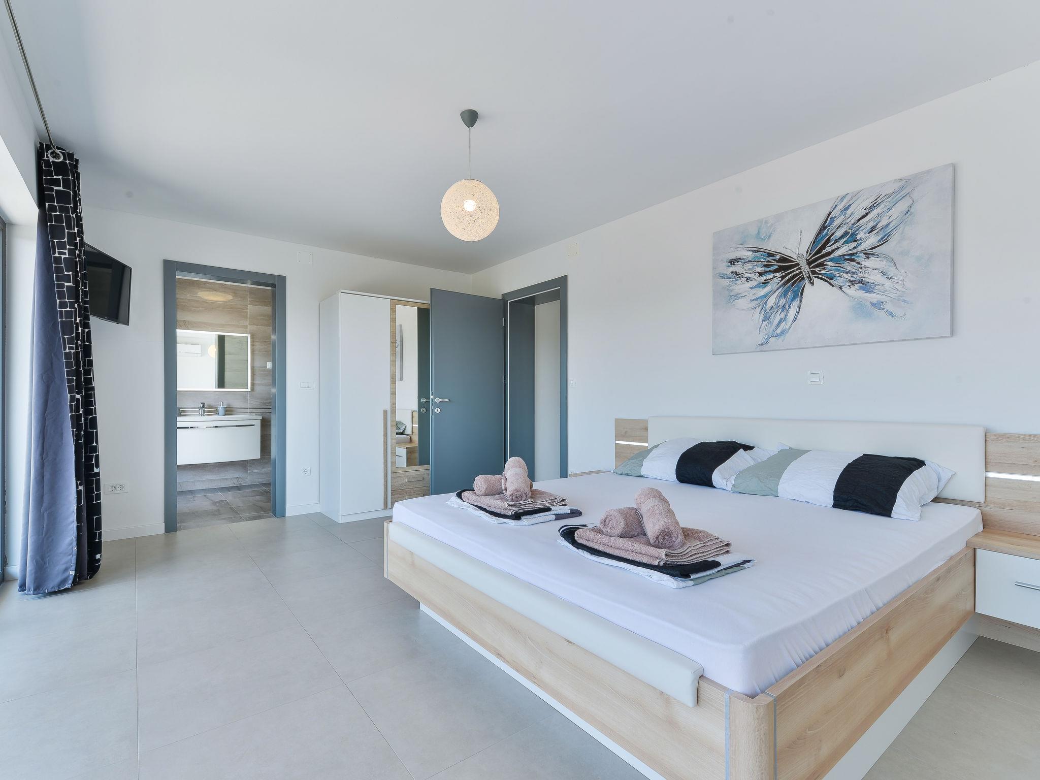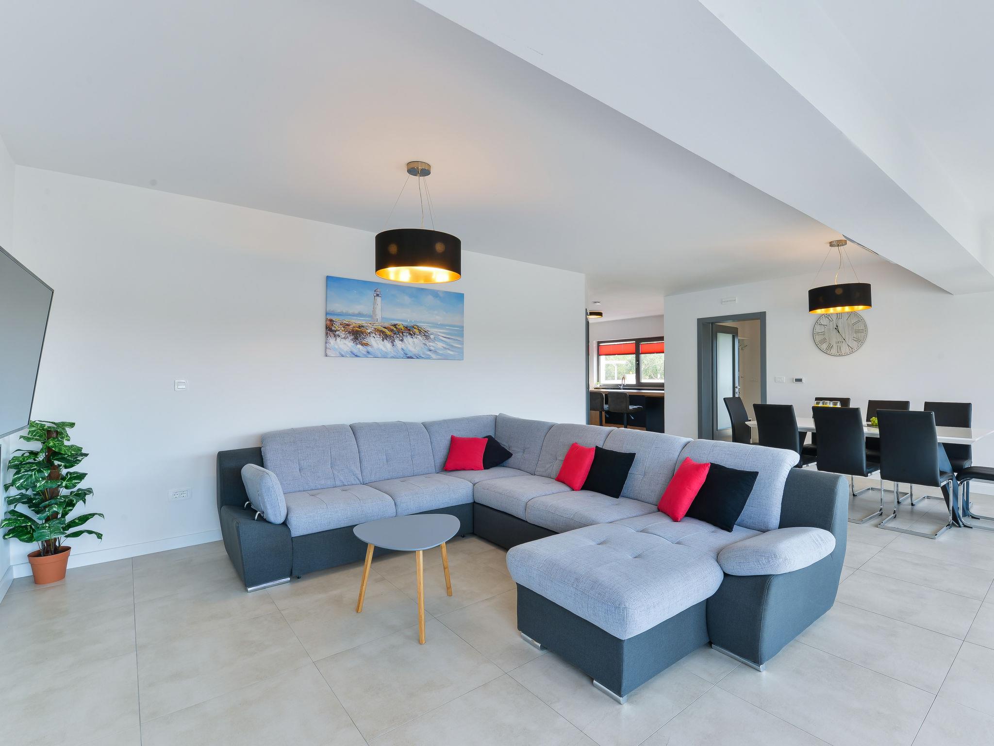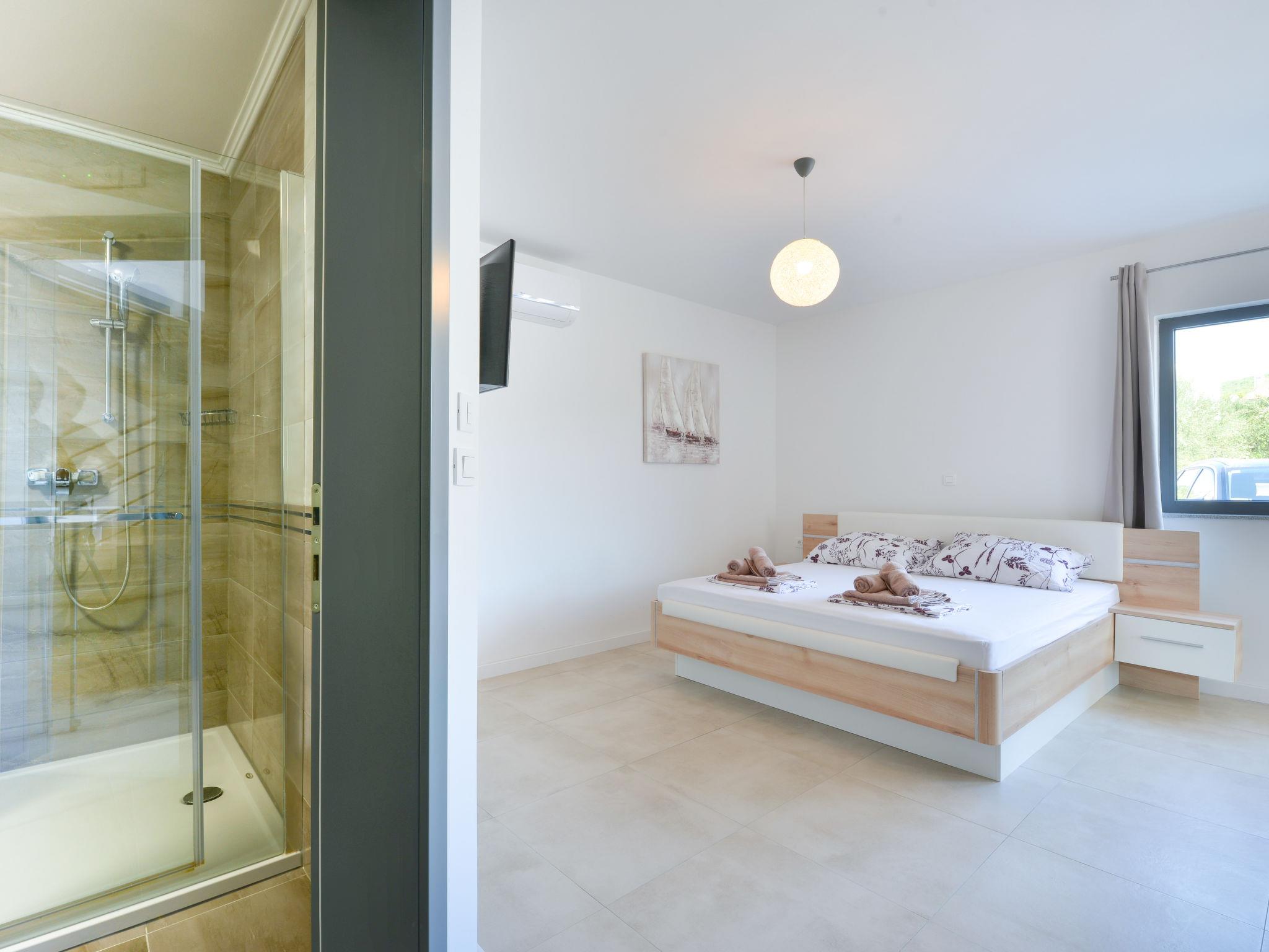 Tribunj 5 km from Vodice: Semi-detached house "East", 2 storeys, built in 2018. In the hamlet Sovlje 1.5 km from the centre of Tribunj, in a quiet, sunny position, 250 m from the sea, 450 m from the beach. For shared use: property 400 m2. Garden furniture, barbecue, children's playground (slide, swing). Private: swimming pool heated (20 m2, depth 150 cm, seasonal availability: 01.May. - 31.Oct.) with internal staircase. Unconventional pool shape. WC in the pool area, outdoor shower. In the house: internet access, washing machine, tumble dryer. Cook on request (extra). Parking (for 3 cars) at the house on the premises. Shop 1 km, restaurant 200 m, bus stop 5.2 km, pebble beach, concrete beach 450 m.