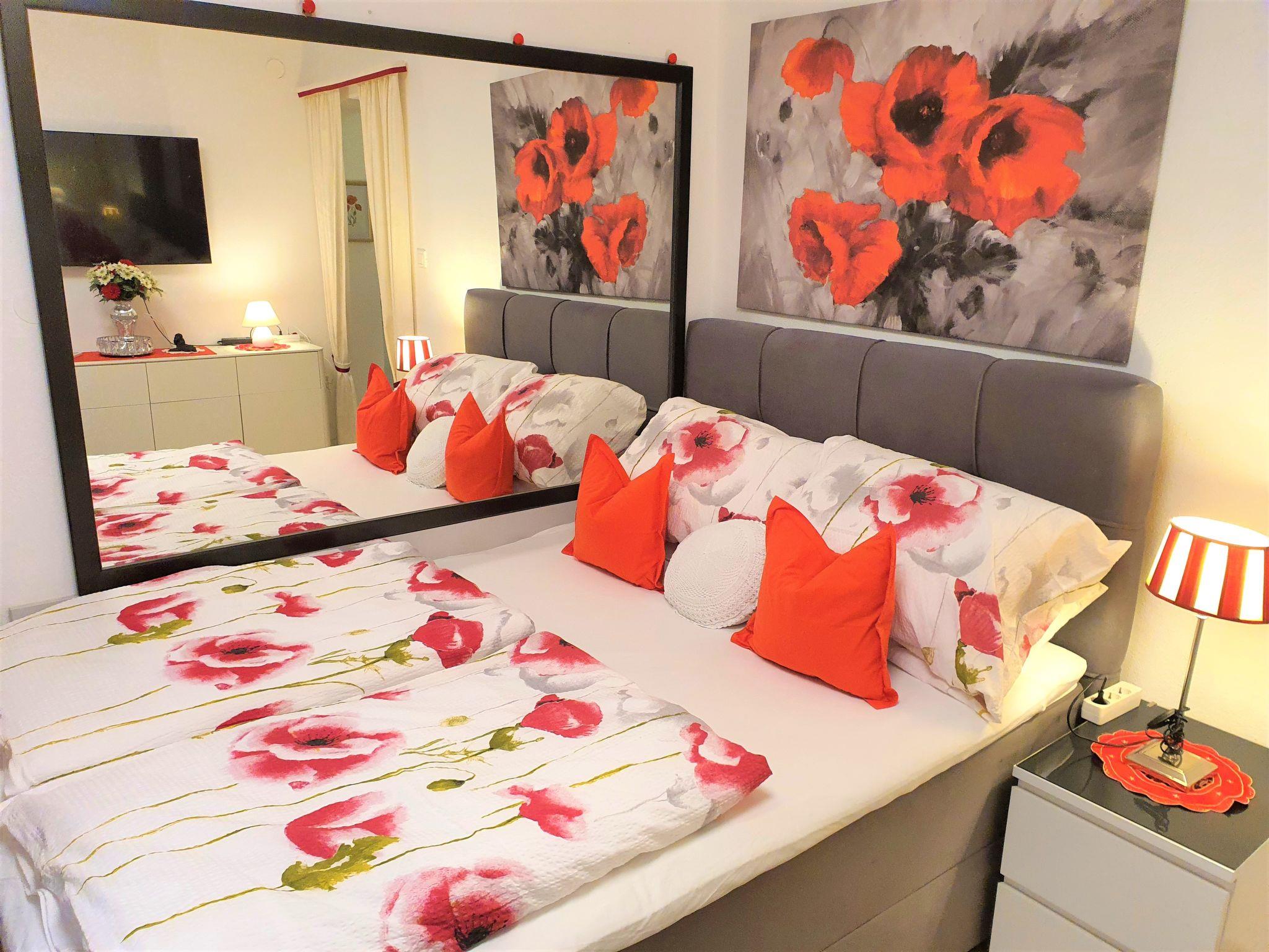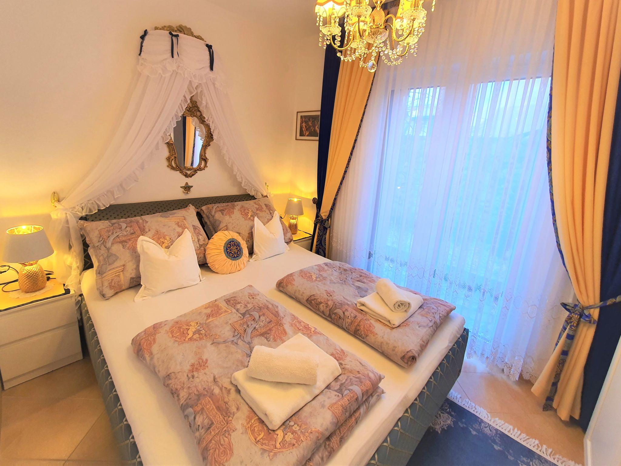 2-room apartment 39 m2, on the ground floor, west facing position. Beautiful and cosy furnishings: living/dining room with 1 double sofabed (140 cm, length 200 cm), satellite TV (flat screen), air conditioning. 1 room with 1 double bed (2 x 80 cm, length 200 cm). Exit to the terrace. Open kitchen (dishwasher, 4 ceramic glass hob hotplates, kettle, microwave, freezer, electric coffee machine). Shower/bidet/WC. Terrace 30 m2. Terrace furniture, barbecue. Facilities: Internet (WiFi, free). Please note: private entrance.