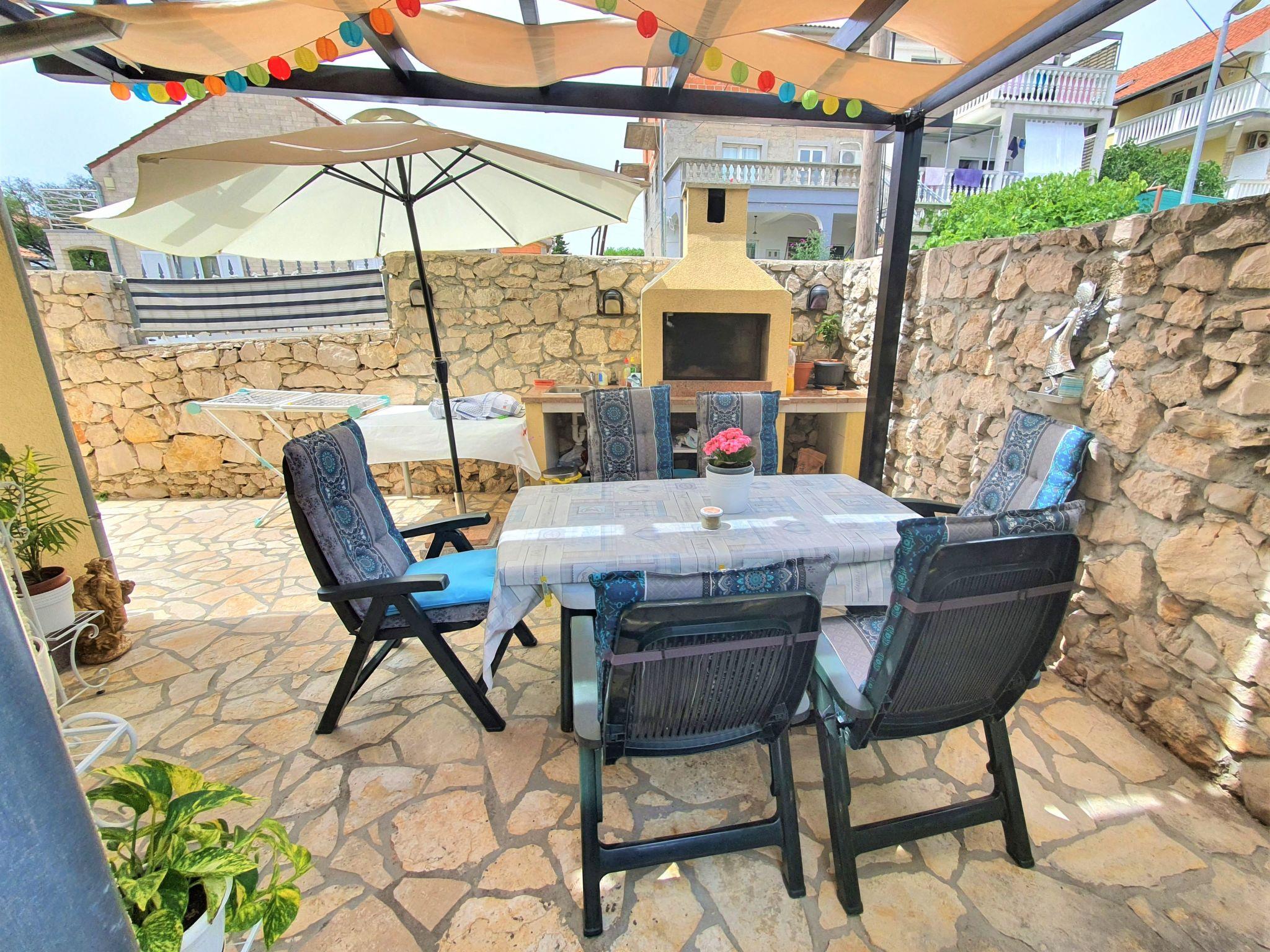 Tribunj 3 km from Vodice: Beautiful apartment house "Friedrich". In the hamlet Sovlje 1.5 km from the centre of Tribunj, in a quiet, sunny position, 250 m from the sea, 300 m from the beach. For shared use: well-kept garden (fenced), swimming pool (24 m2, depth 150 cm, seasonal availability: 01.May. - 22.Oct.) with internal staircase. Outdoor shower, arbour, garden furniture, children's playground. In the house: internet access, washing machine (for shared use, extra). Parking at the house. Shop 1.3 km, restaurant 350 m, bus stop 5.4 km, pebble beach 400 m, rocky beach 300 m, concrete beach 400 m. For shared use: deck chairs and parasols. Parking for trailer available.