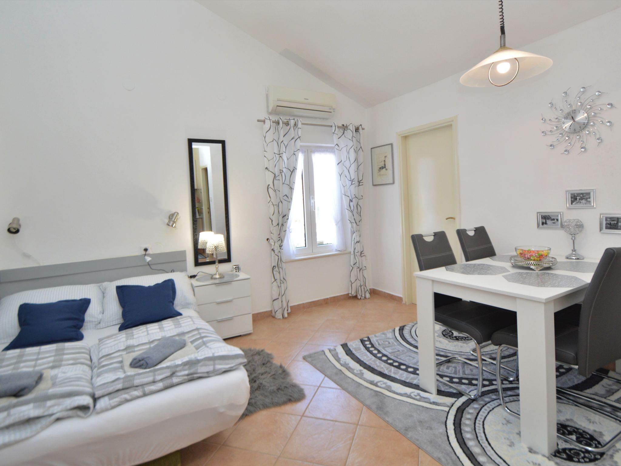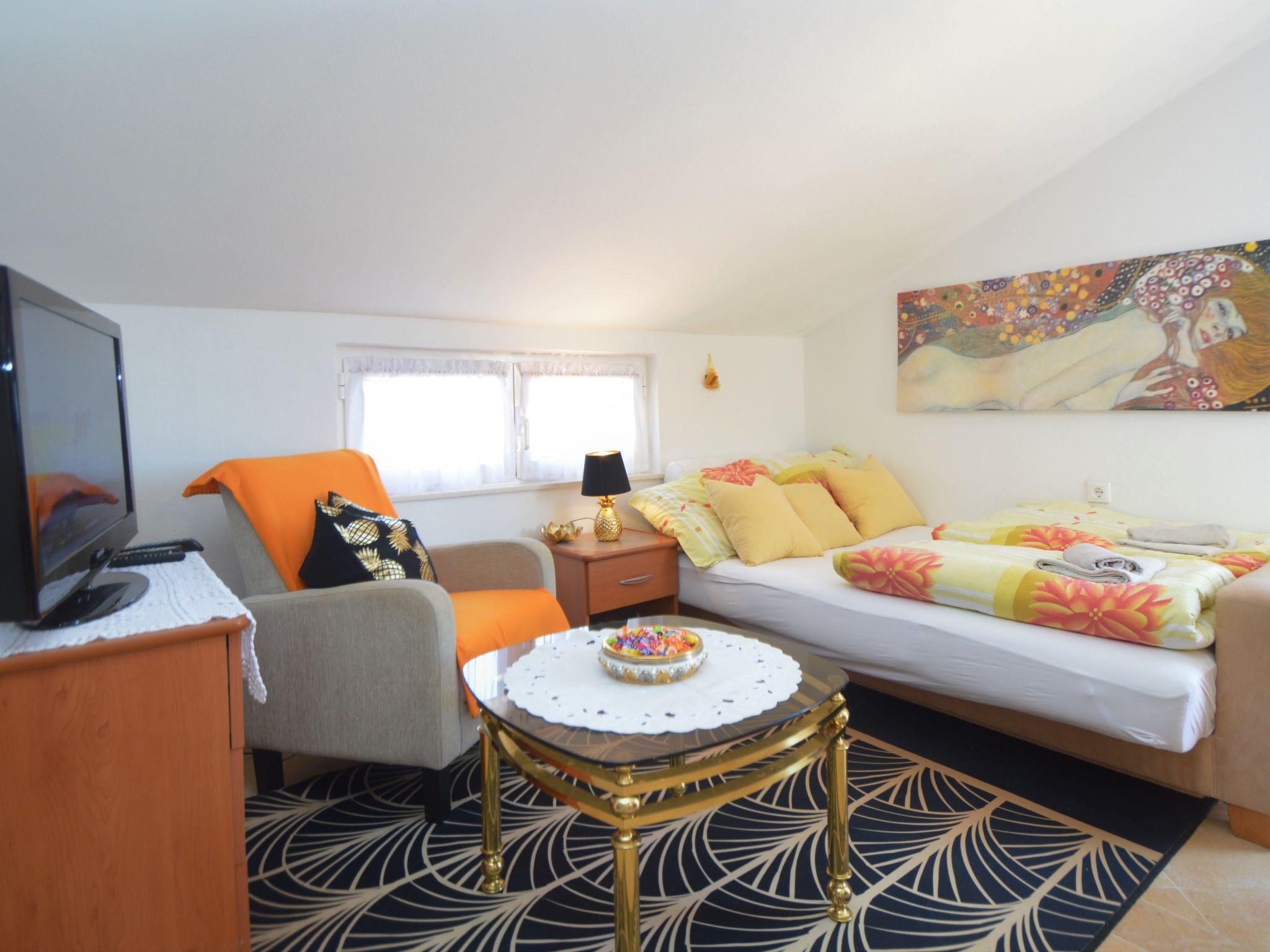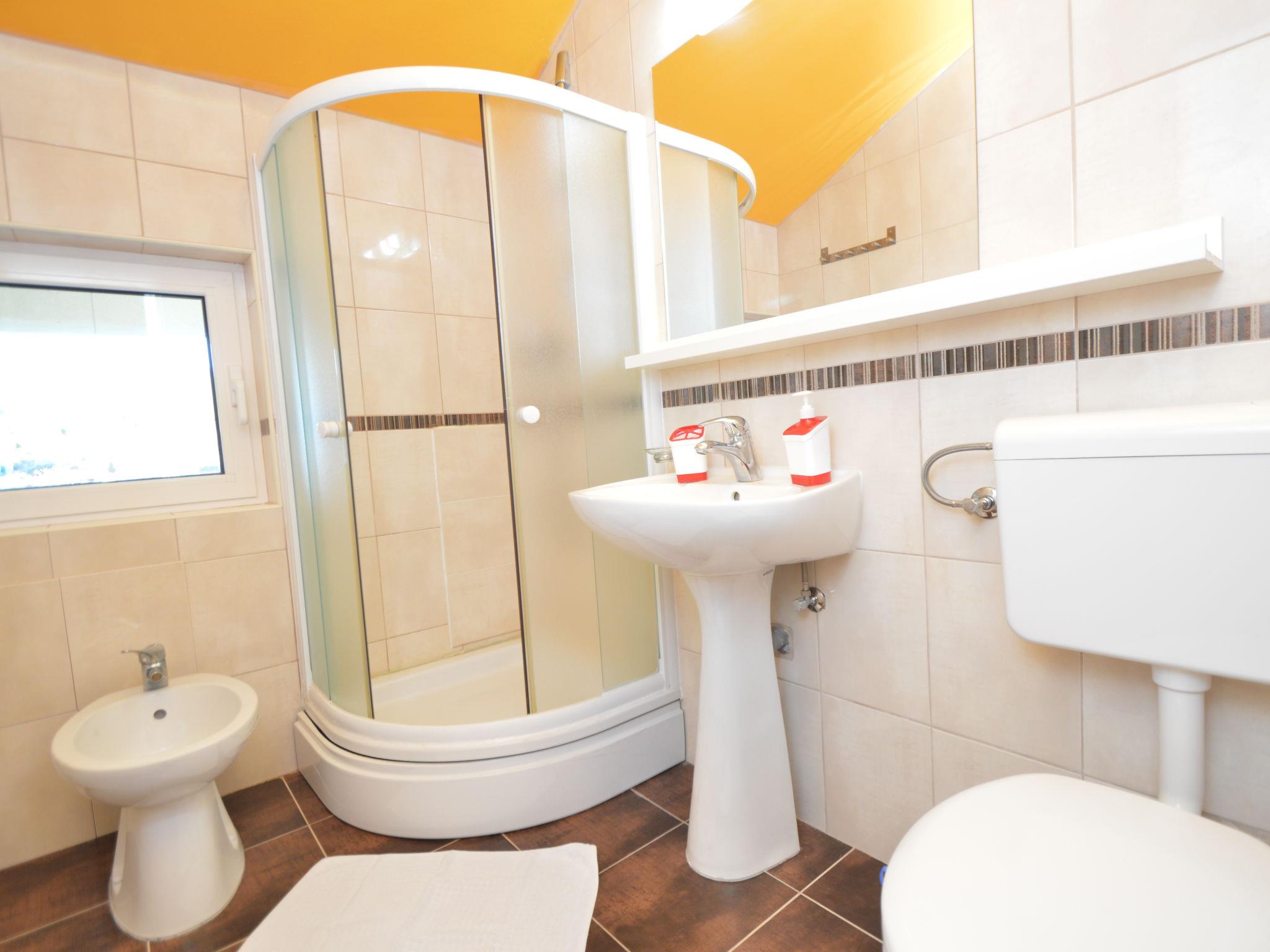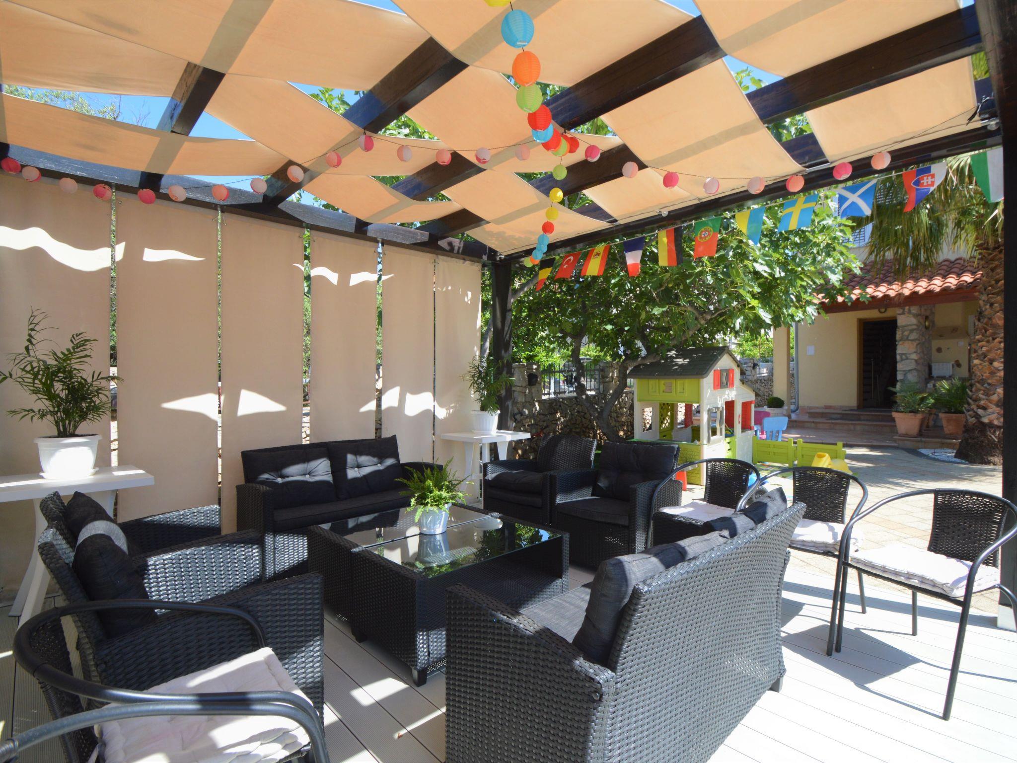 4-room apartment 89 m2 on 2nd floor, south facing position. Beautiful and cosy furnishings: living/dining room with 1 double sofabed (140 cm, length 200 cm), kitchen corner and satellite TV (flat screen), air conditioning. 1 room, ceiling height 155 - 300 cm with 1 french bed (140 cm, length 200 cm). Living/dining room, ceiling height 145 - 300 cm with 1 sofabed (140 cm, length 200 cm), satellite TV (flat screen), air conditioning. Exit to the balcony. 1 room, ceiling height 145 - 300 cm with 1 french bed (160 cm, length 200 cm). Open kitchen (dishwasher, 4 ceramic glass hob hotplates, kettle, microwave, freezer, electric coffee machine). 2 showers/bidet/WC. No heating option. Balcony 4 m2, terrace 30 m2, roofed. Terrace furniture, barbecue. View of the sea and the swimming pool. Facilities: Internet (WiFi, free). The unit consists of 2 separate apartments, rented as one unit, occupying the second floor. Each apartment with living/dining area, open kitchen and bedroom. Ideal for 2 families spending holidays together.