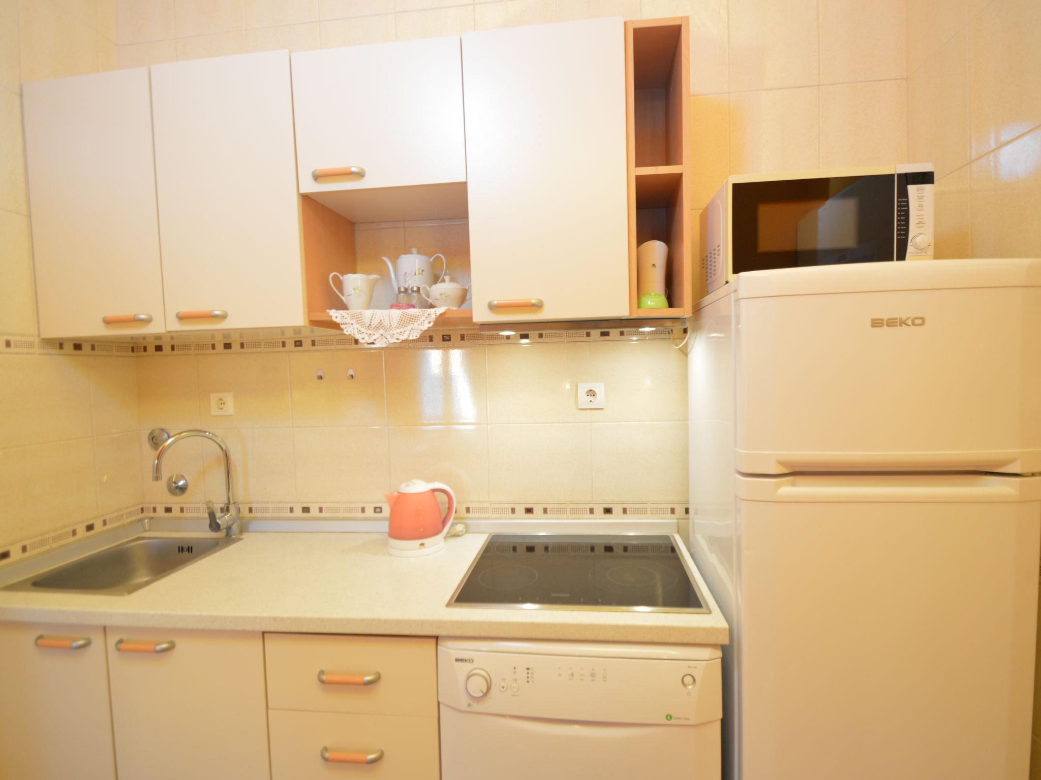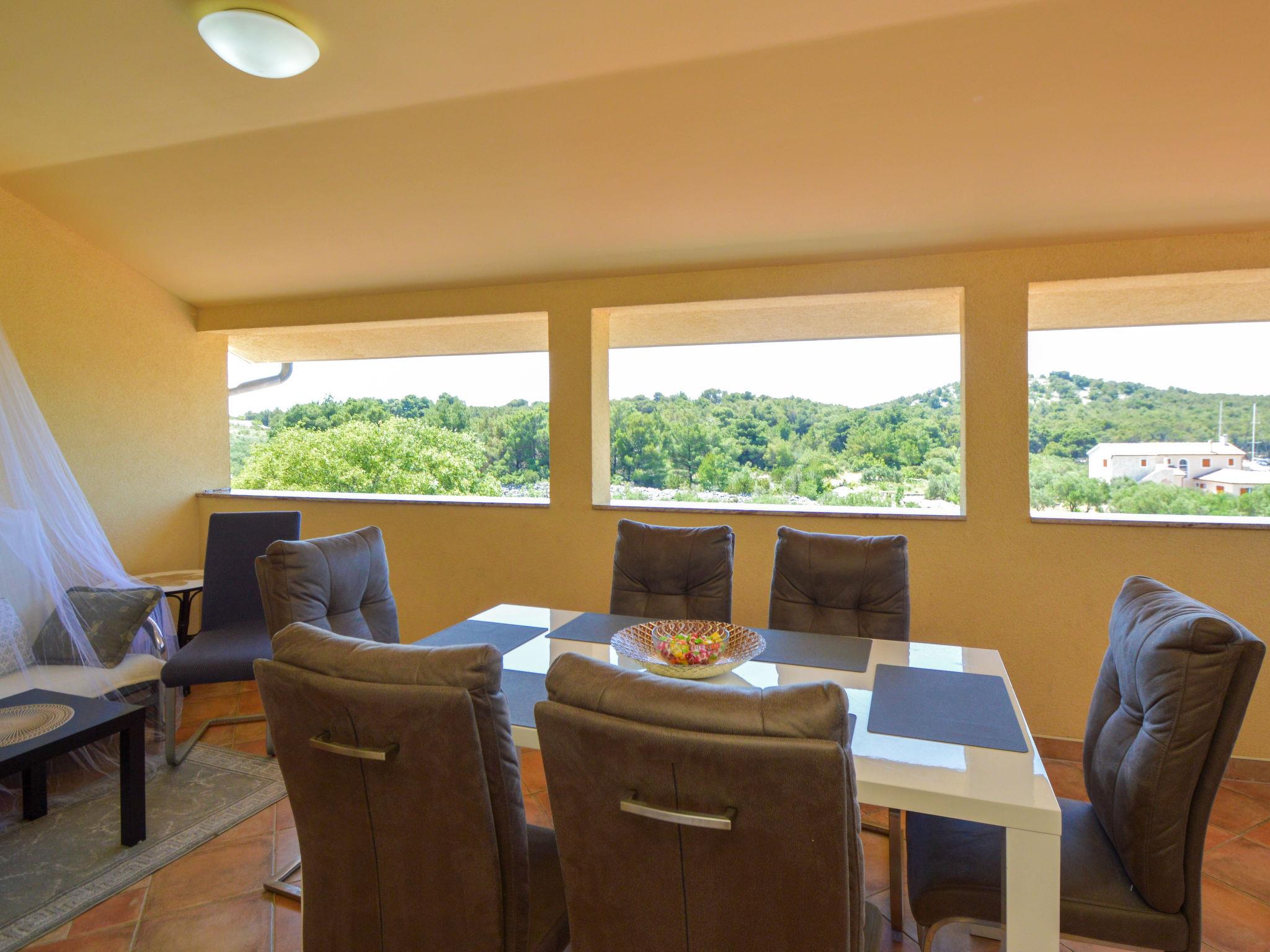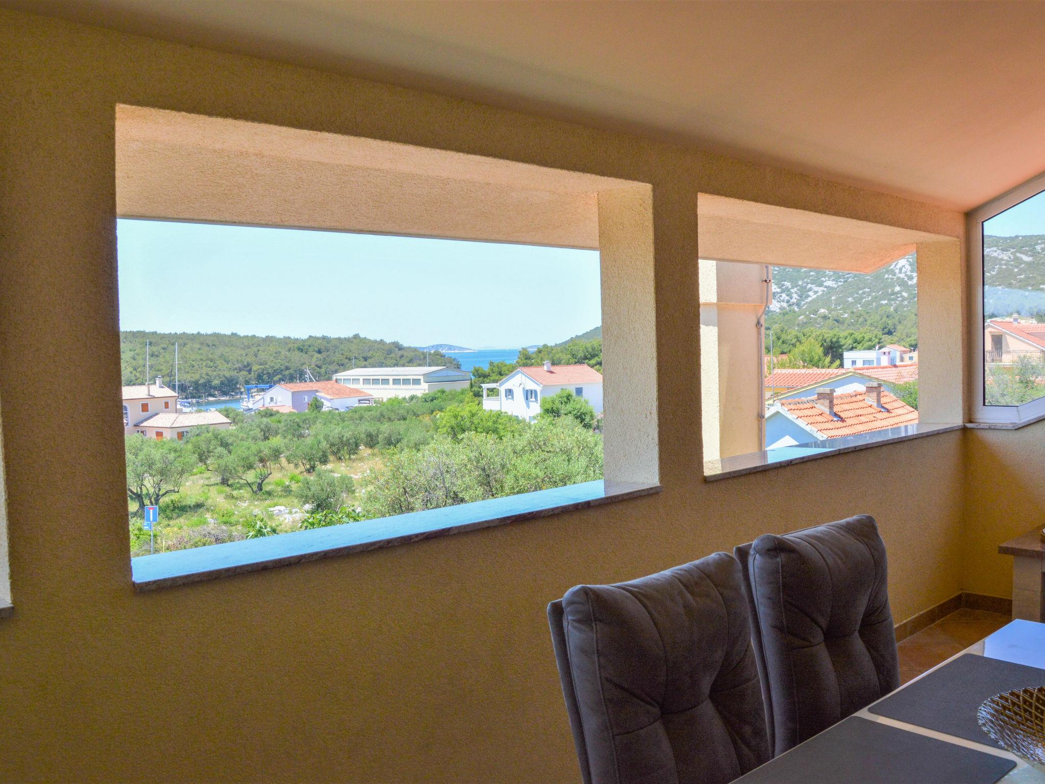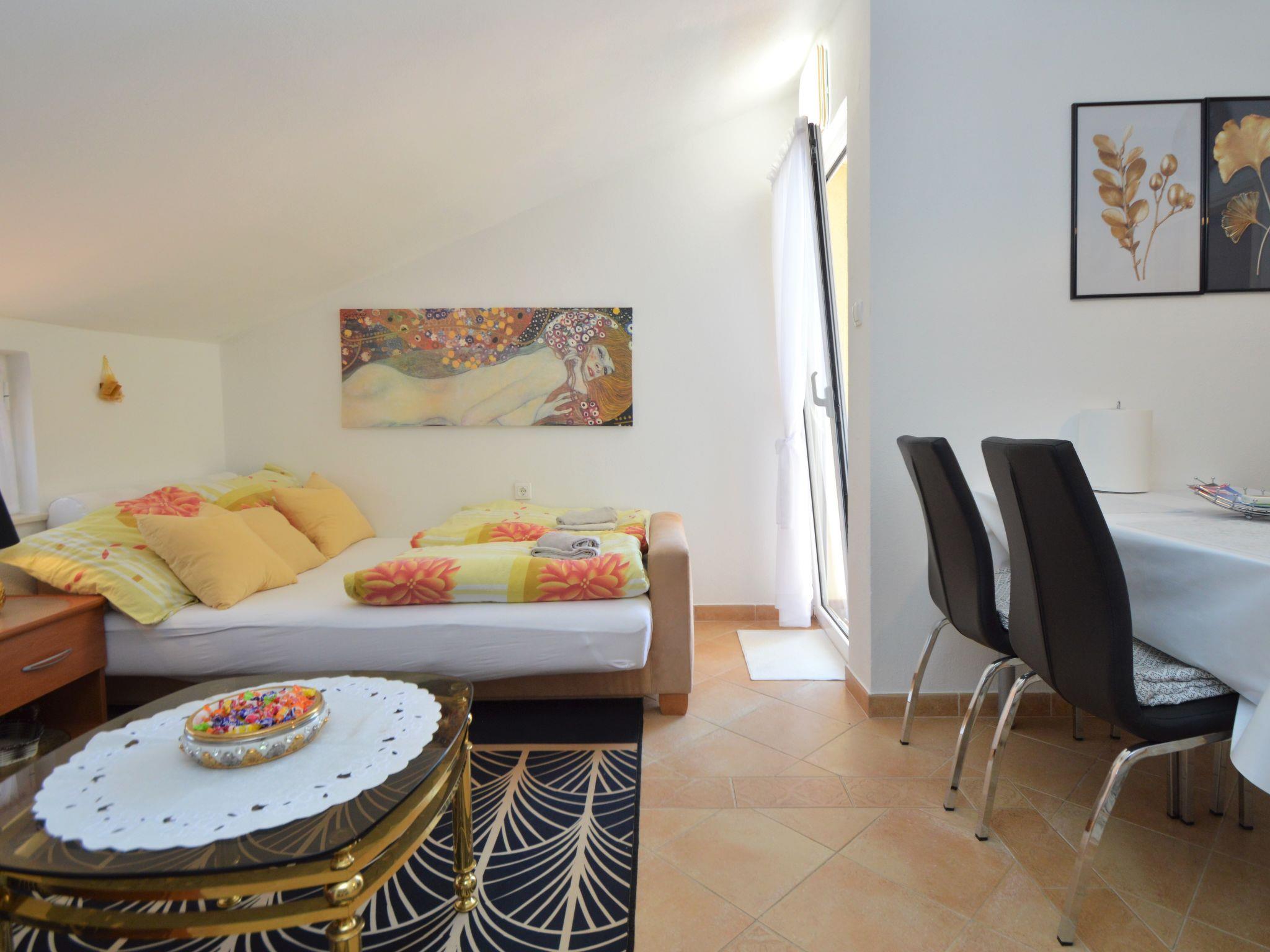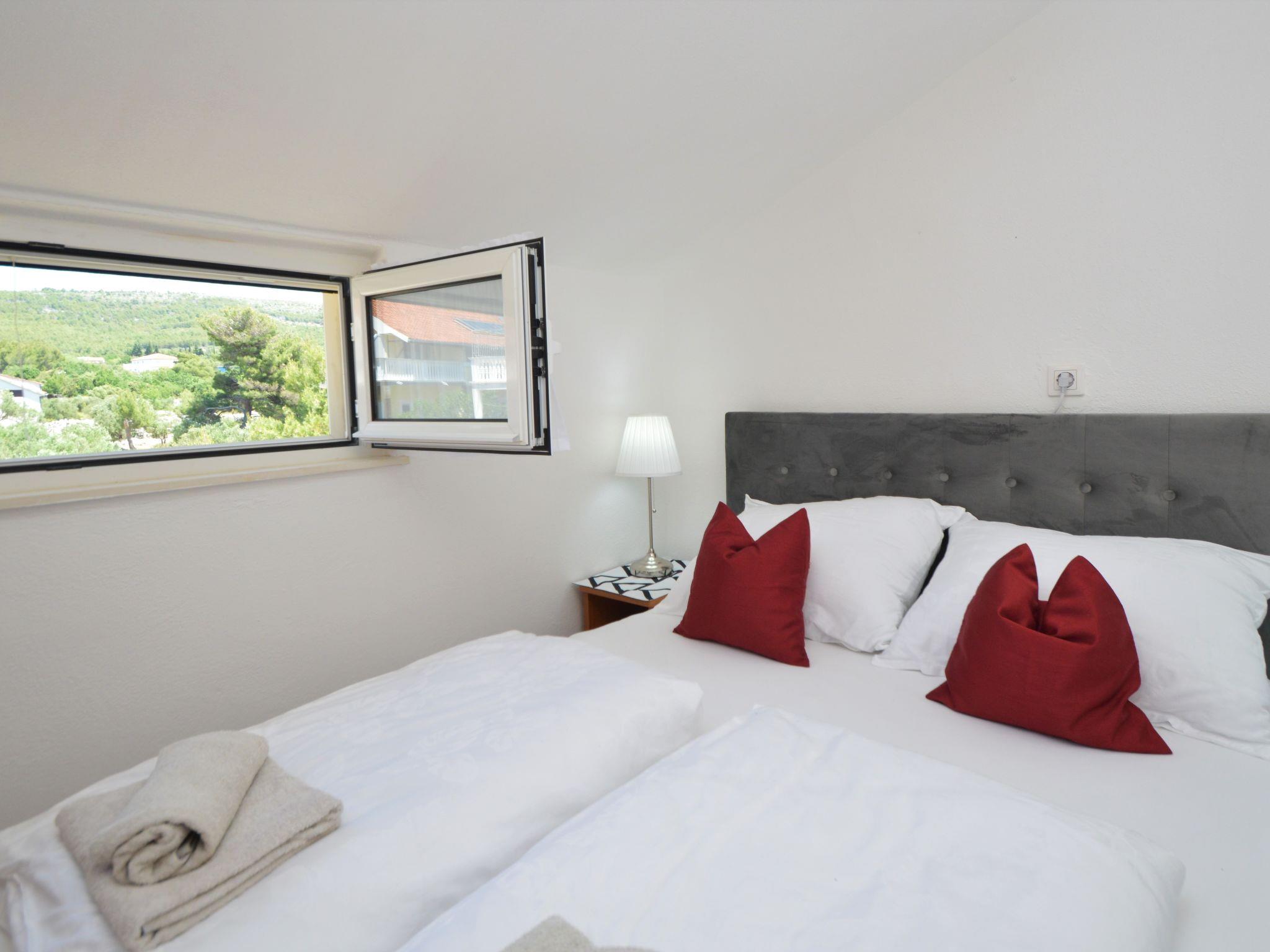 4-room apartment 89 m2 on 2nd floor, south facing position. Beautiful and cosy furnishings: living/dining room with 1 double sofabed (140 cm, length 200 cm), kitchen corner and satellite TV (flat screen), air conditioning. 1 room, ceiling height 155 - 300 cm with 1 french bed (140 cm, length 200 cm). Living/dining room, ceiling height 145 - 300 cm with 1 sofabed (140 cm, length 200 cm), satellite TV (flat screen), air conditioning. Exit to the balcony. 1 room, ceiling height 145 - 300 cm with 1 french bed (160 cm, length 200 cm). Open kitchen (dishwasher, 4 ceramic glass hob hotplates, kettle, microwave, freezer, electric coffee machine). 2 showers/bidet/WC. No heating option. Balcony 4 m2, terrace 30 m2, roofed. Terrace furniture, barbecue. View of the sea and the swimming pool. Facilities: Internet (WiFi, free). The unit consists of 2 separate apartments, rented as one unit, occupying the second floor. Each apartment with living/dining area, open kitchen and bedroom. Ideal for 2 families spending holidays together.