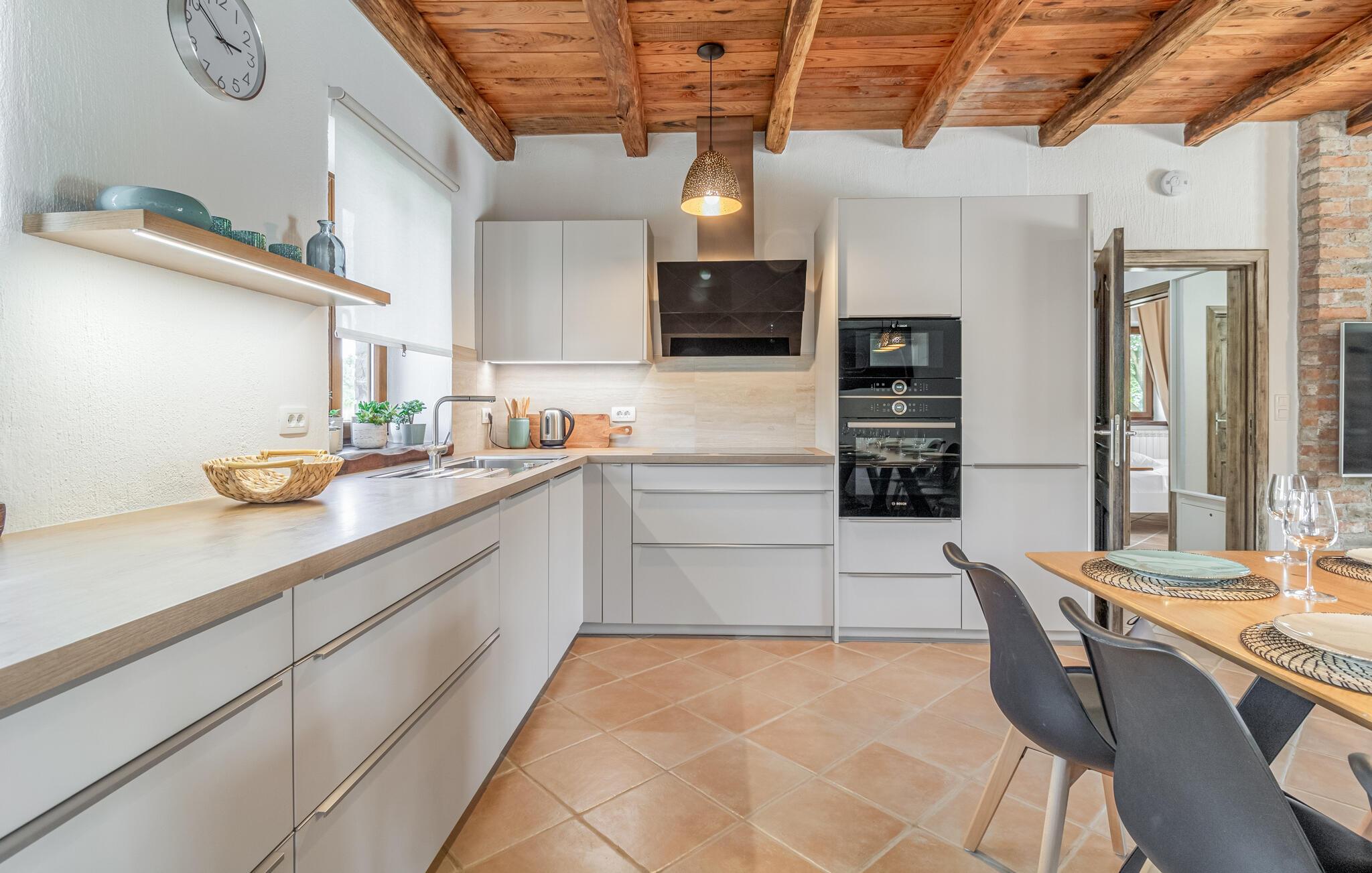 Velkommen til denne luksusvilla, der ligger i de dejligste omgivelser i baglandet til kysten. Her venter jer en boligoplevelse lidt ud over det sædvanlige; huset byder nemlig på masser af kvadratmeter og en komfortabel indretning, der ikke lader noget tilbage at ønske. Interiøret fremtræder på én gang og rustikt og topmoderne med god sans for detaljen. Gør madlavningen til et sjovt fællesprojekt i det veludstyrede køkken og dæk op til den store festmiddag ved spisebordet, inden I runder dagen af med brætspil, snacks og en god film på tv'et ved pejsen.