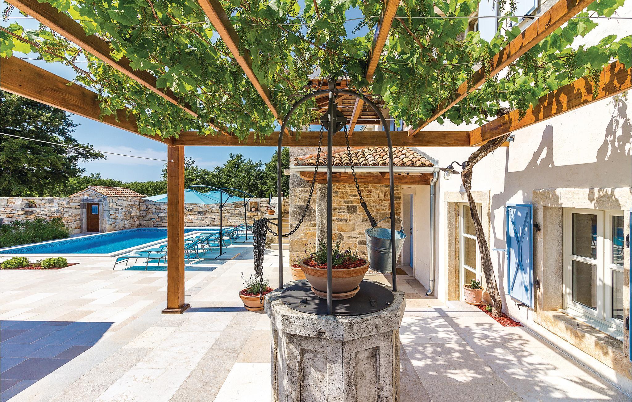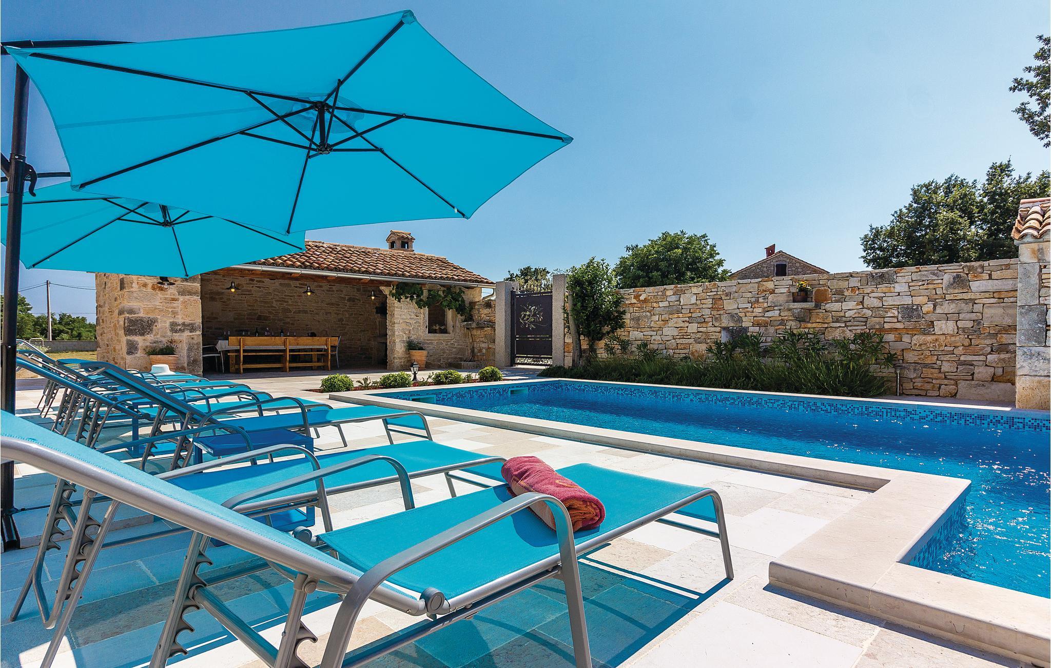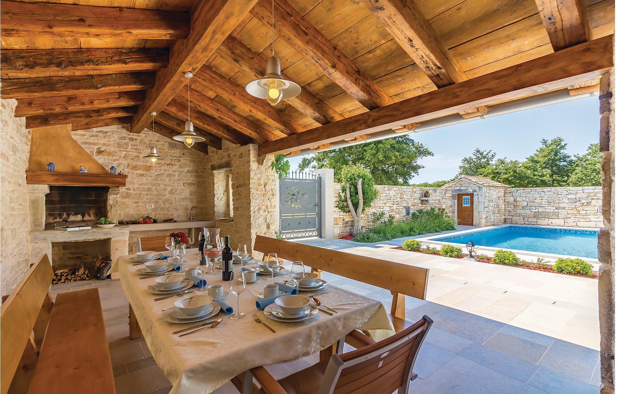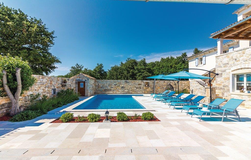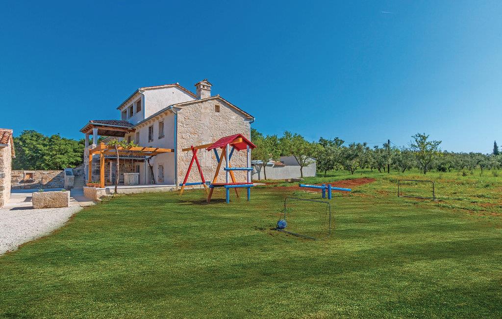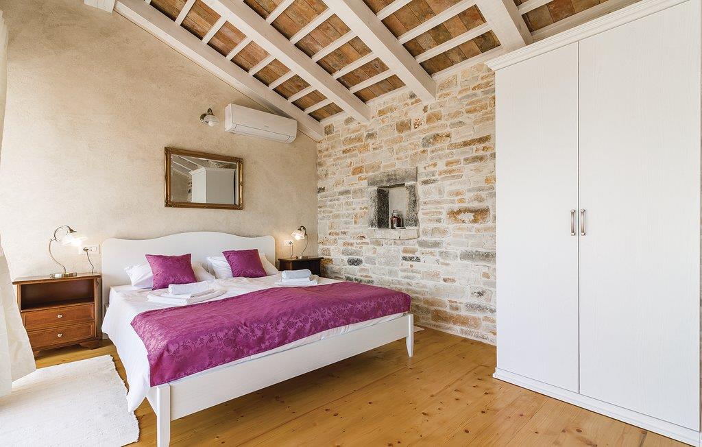 Den traditionelle sten- og trækonstruktion er kombineret med moderne møbler og tilbyder sine gæster maksimal komfort. I stueetagen er der et køkken med opholds- og spiseplads samt et soveværelse med badeværelse og egen adgang til poolområdet. Ovenpå er der tre soveværelser med badeværelser, mens øverste etage er det største soveværelse med badeværelse og egen terrasse, hvorfra der endda er en delvis havudsigt. Her kan du nyde udsigten over den smukke solnedgang. Ved siden af ??poolen er der en overdækket terrasse med en grill, og på græsplænen ved siden af ??er der et legeplads samt en volleyball- og badmintonbane. Foran er der en ekstra gårdhave-terrasse, hvor du kan drikke morgenkaffe og slappe af.