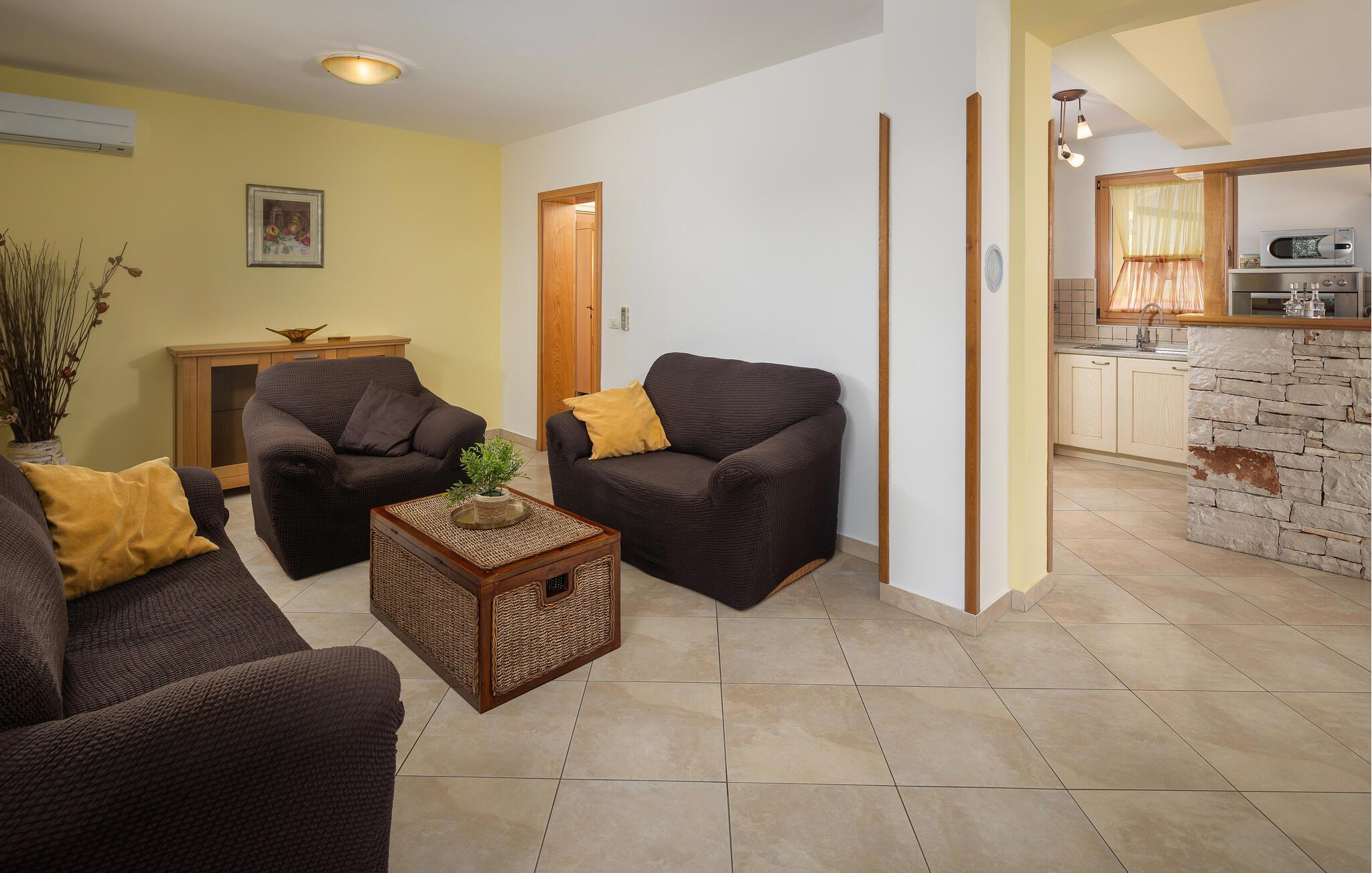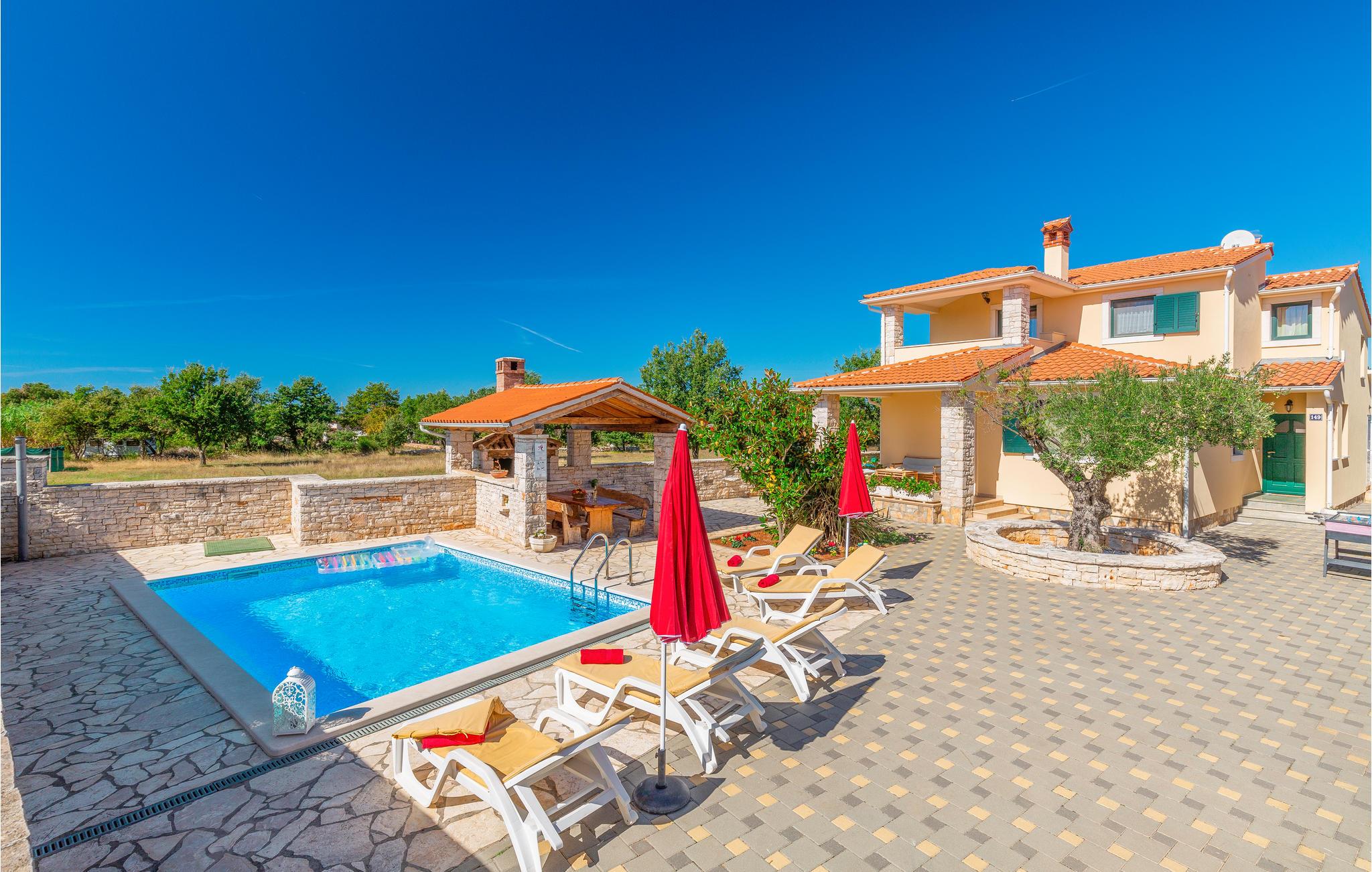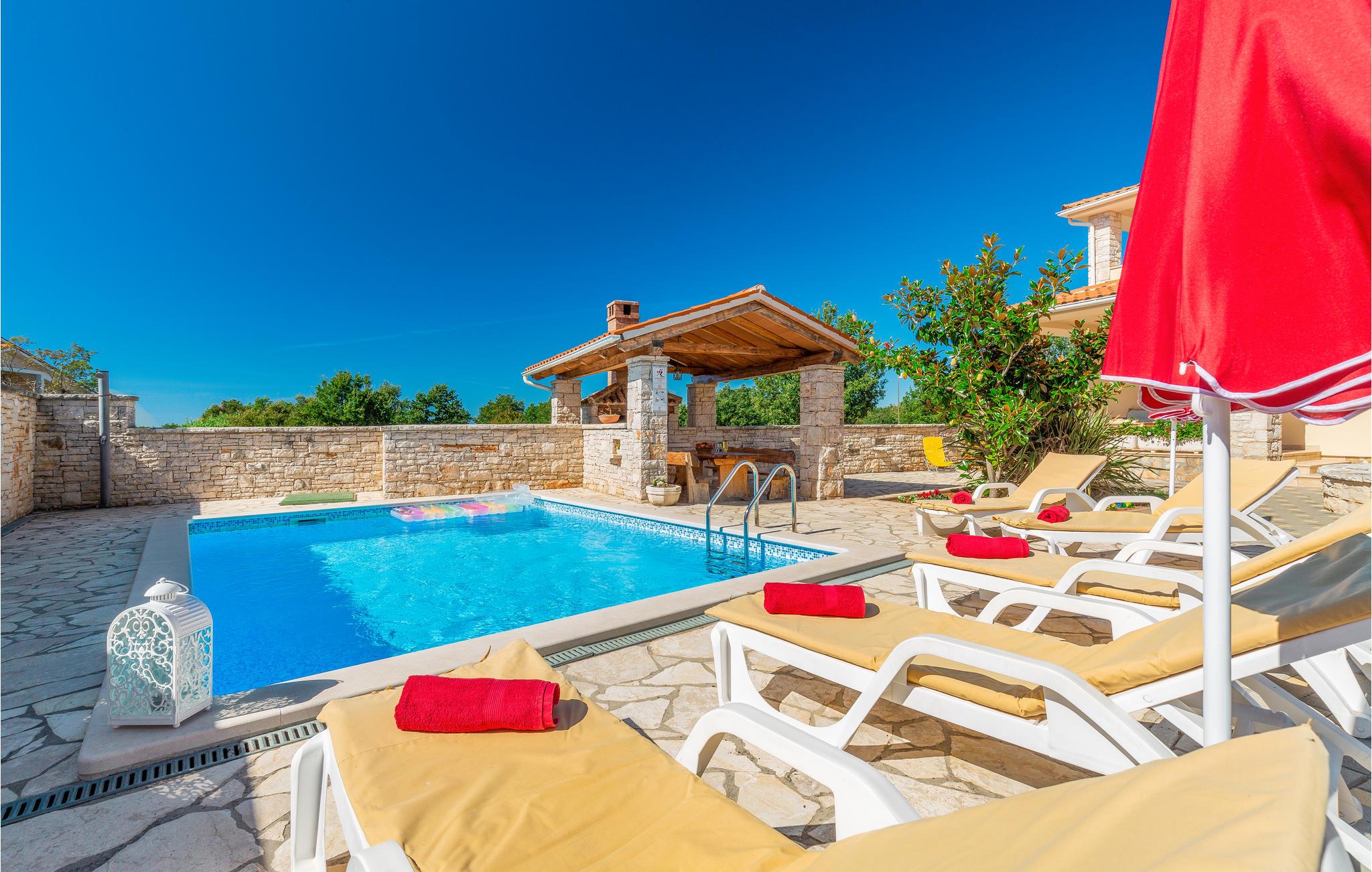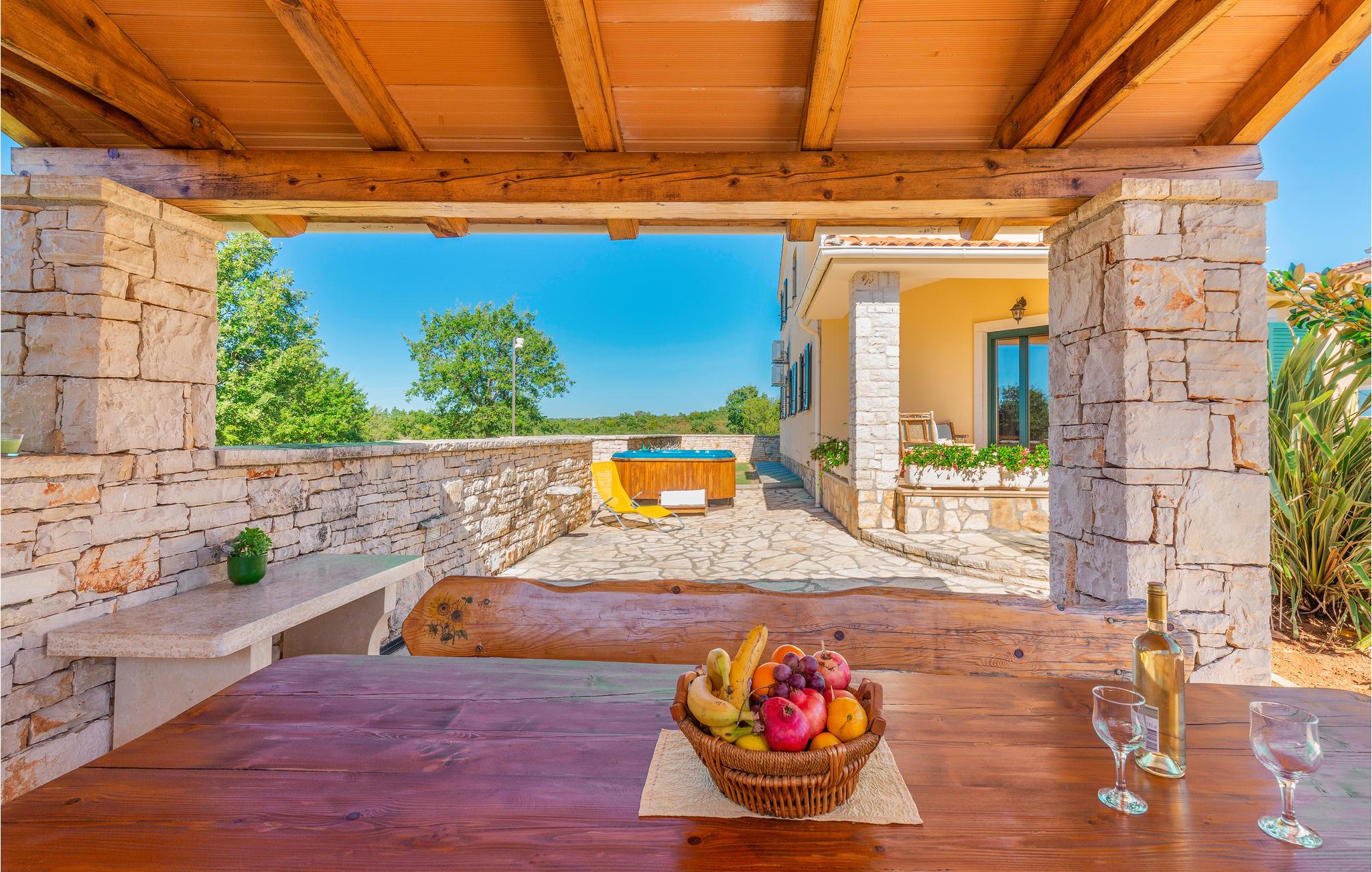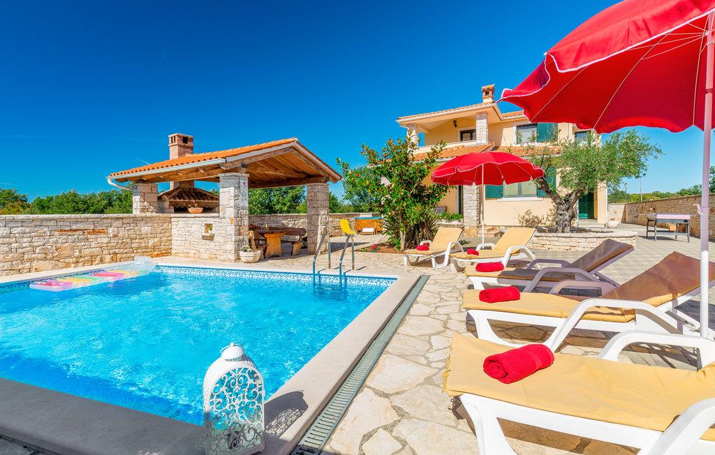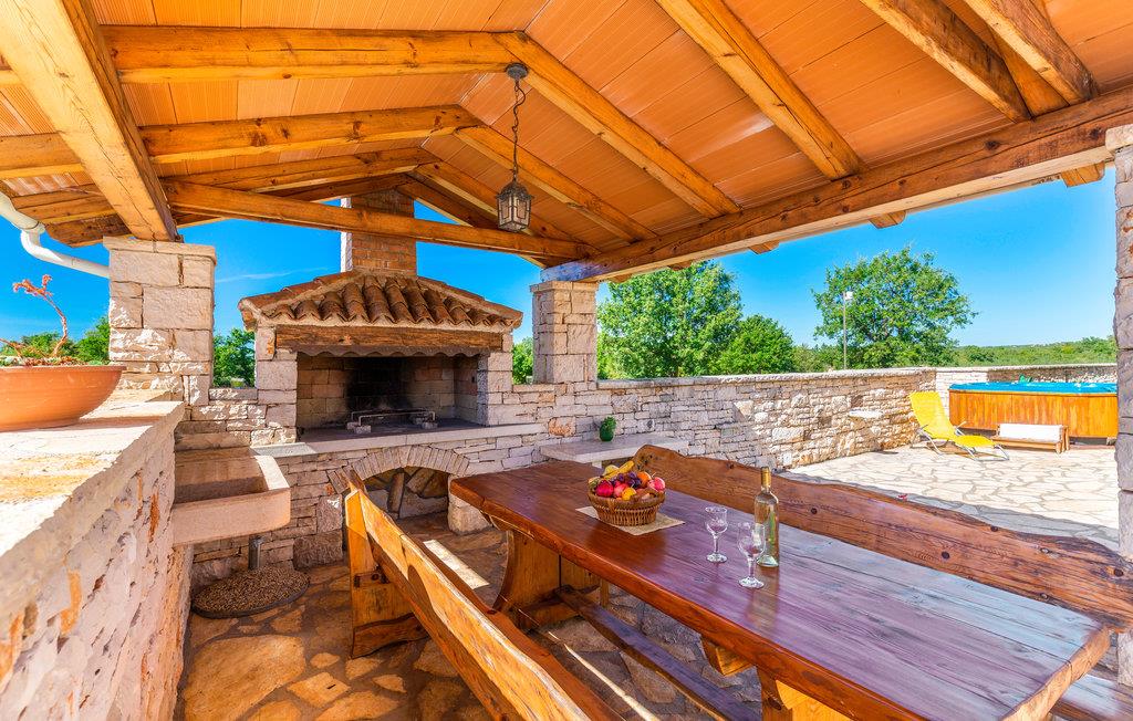 Dette smukke feriehus er ideelt til en afslappende og behagelig familieferie. Huset er stilfuldt indrettet og med stor sans for detaljer. Her kan man rigtig hygge sig, huset har pool og udendørs spabad til 6 personer. I stueetagen af ??huset er den komfortabelt indrettede stue, et veludstyret køkken, badeværelse og et soveværelse. På øverste etage er der yderligere to soveværelser med eget badeværelse. Soveværelse 2 har en terrasse med udsigt over poolen. Fra køkkenet er der udgang til den overdækkede terrasse, som er udstyret med siddepladser i træ. Hvis du går til venstre fra terrassen, kommer du til poolen. Ved siden af ??poolen er der en træpavillon med en stor bænk.