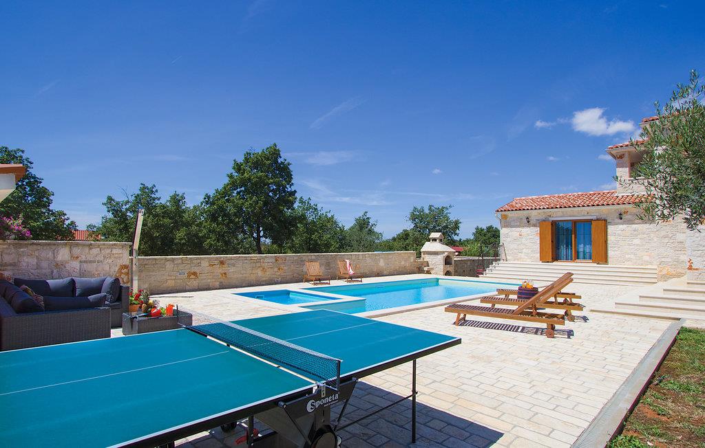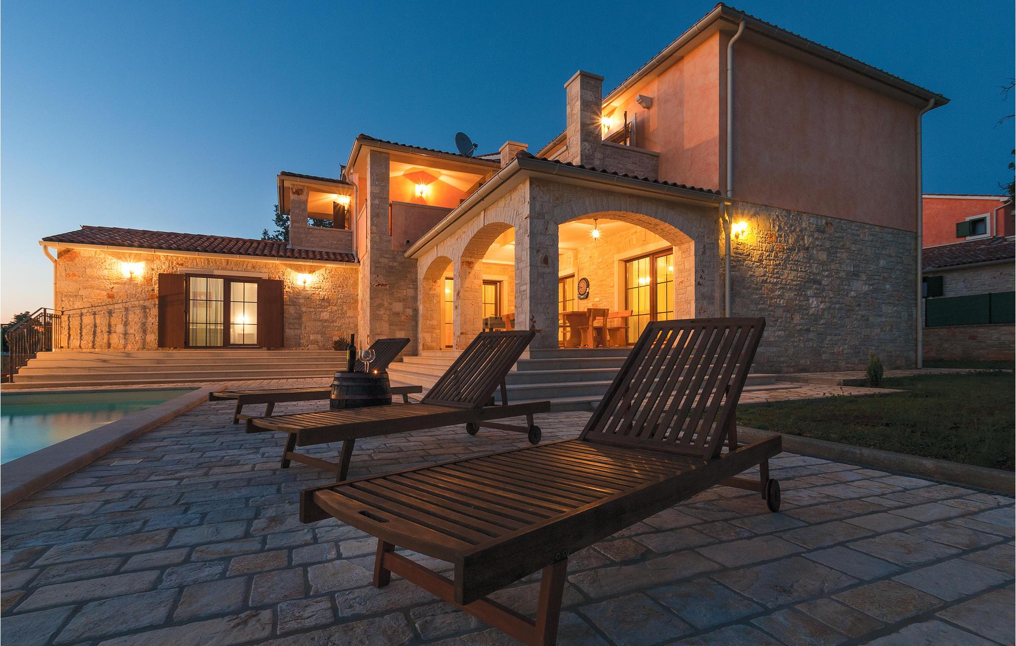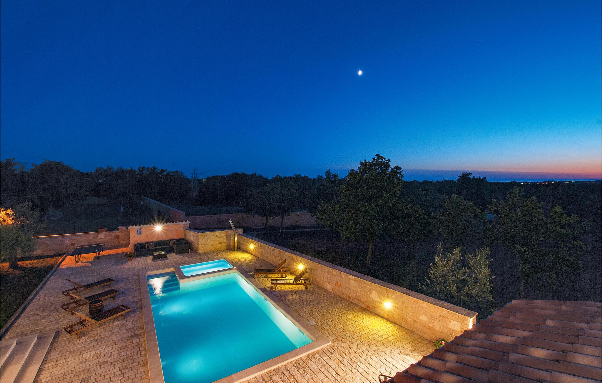 Kun få minutter i bil fra grusstrandene i Brijuni-øhavet ligger dette dejlige feriehus med pool. Med detaljer af sten og træ trylles Istriens autentiske miljø frem. Huset er komplet opvarmet og klimatiseret. Det trådløse internet holder jer underrettede om de sidste nyheder også i ferien. Vidunderligt flyder det indvendige og det udvendige område sammen til en enhed via den dejlige, overdækkede terrasse med adgang til den udendørs pool. Her er der også en whirlpool til 6 personer. Ejerne har anlagt haven godt til små børn, men der er også plads til Badminton eller volleyball. Bygningens stueetage består af en stor spisestue med kamin, spisestue og køkken, badeværelse med hydromassage-badekar til to personer og et soveværelse med eget bad (egen adgang til terrassen). I overetagen ligger tre yderligere soveværelser med deres egne terrasser og badeværelser en suite. Terrassen har havudsigt. I kun 7 km’s afstand når I Vodnjan, hvor I kan finde alle de nødvendige services og produkter.