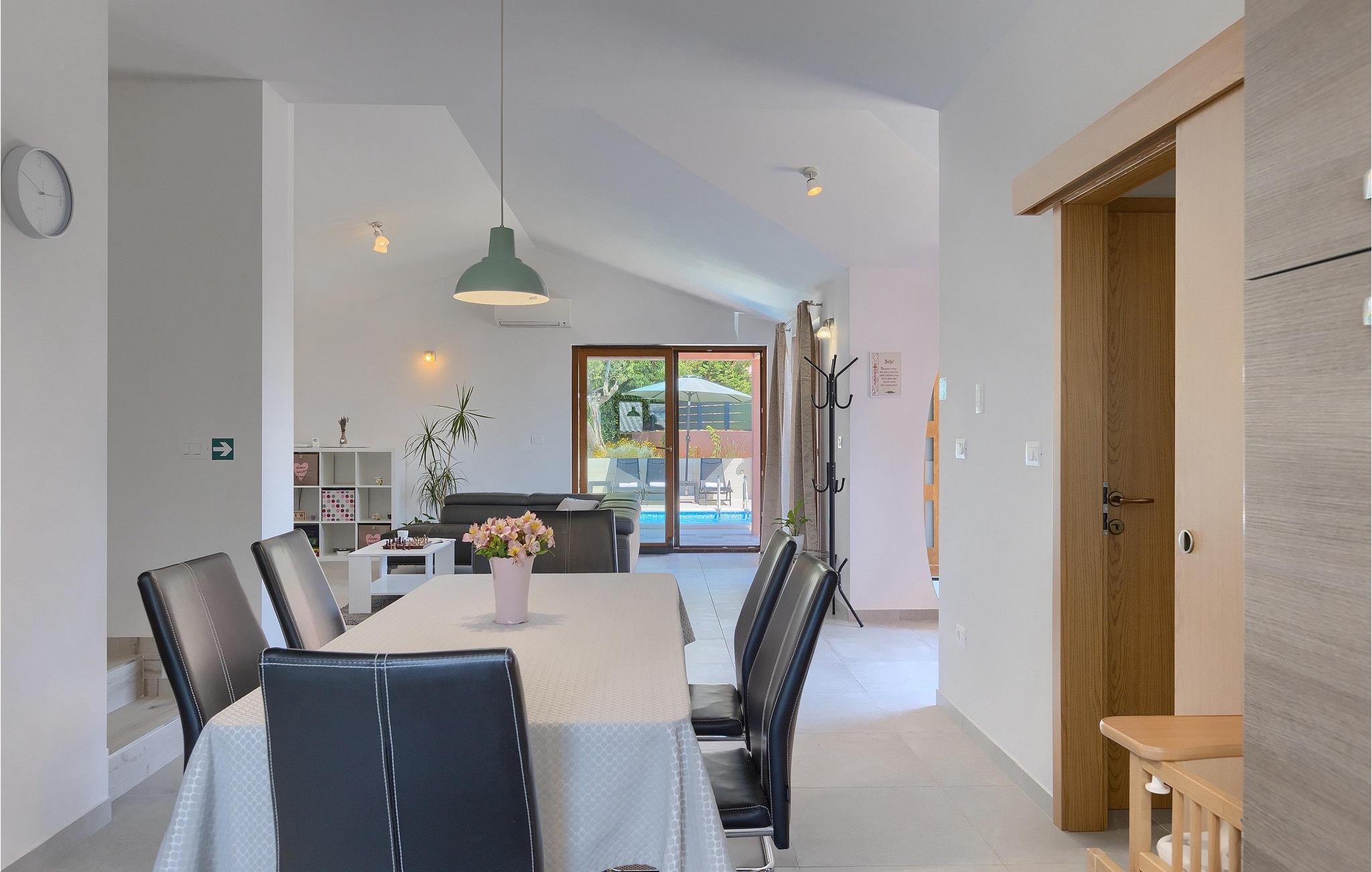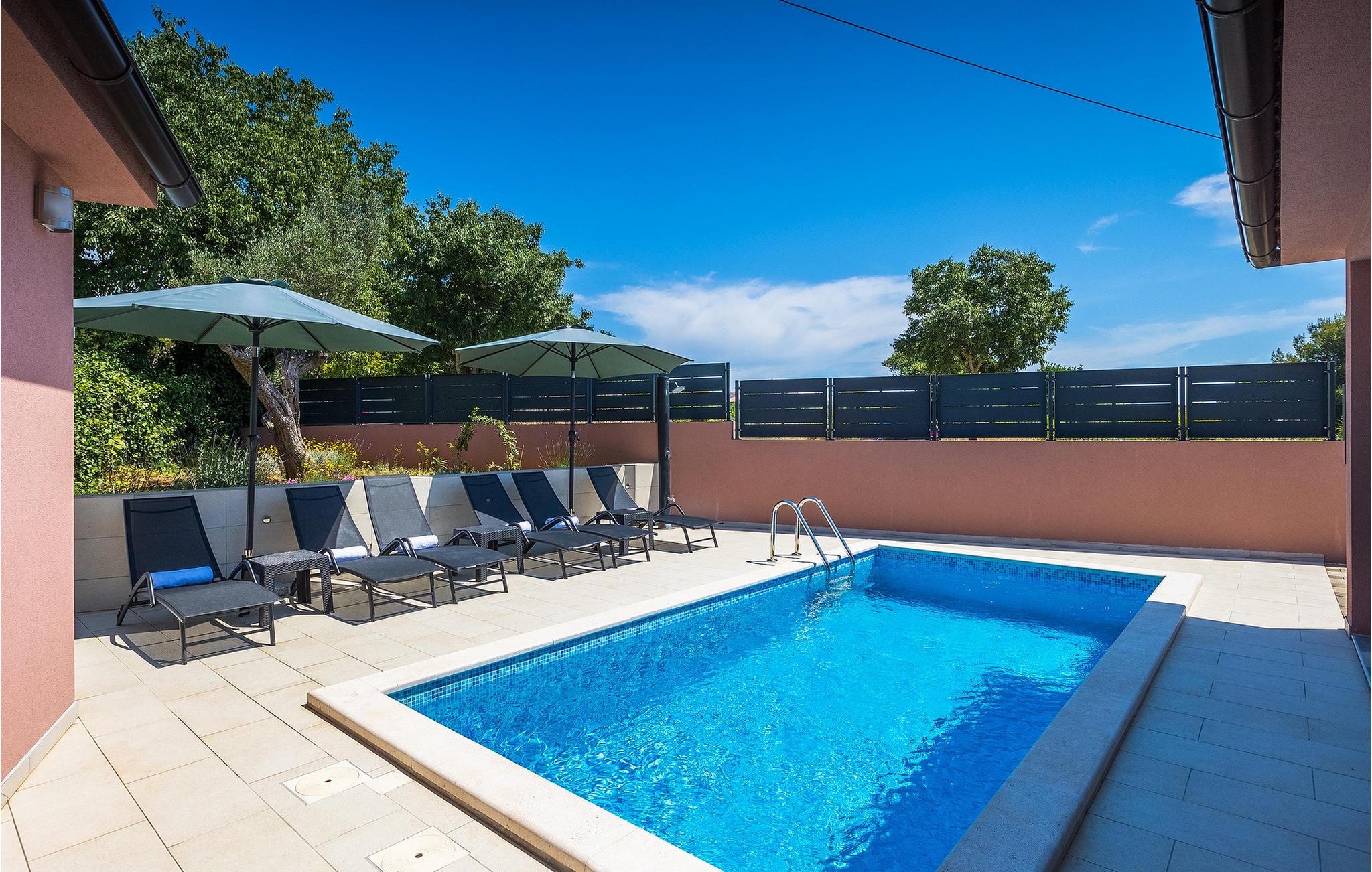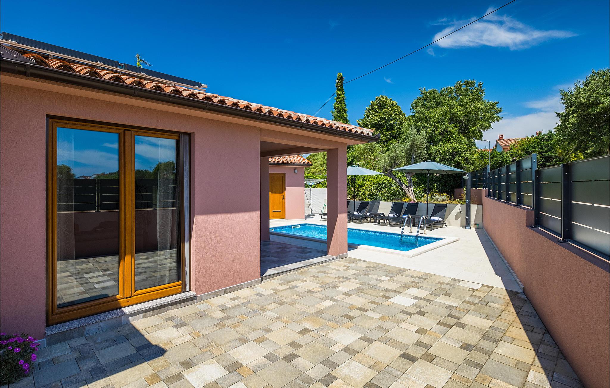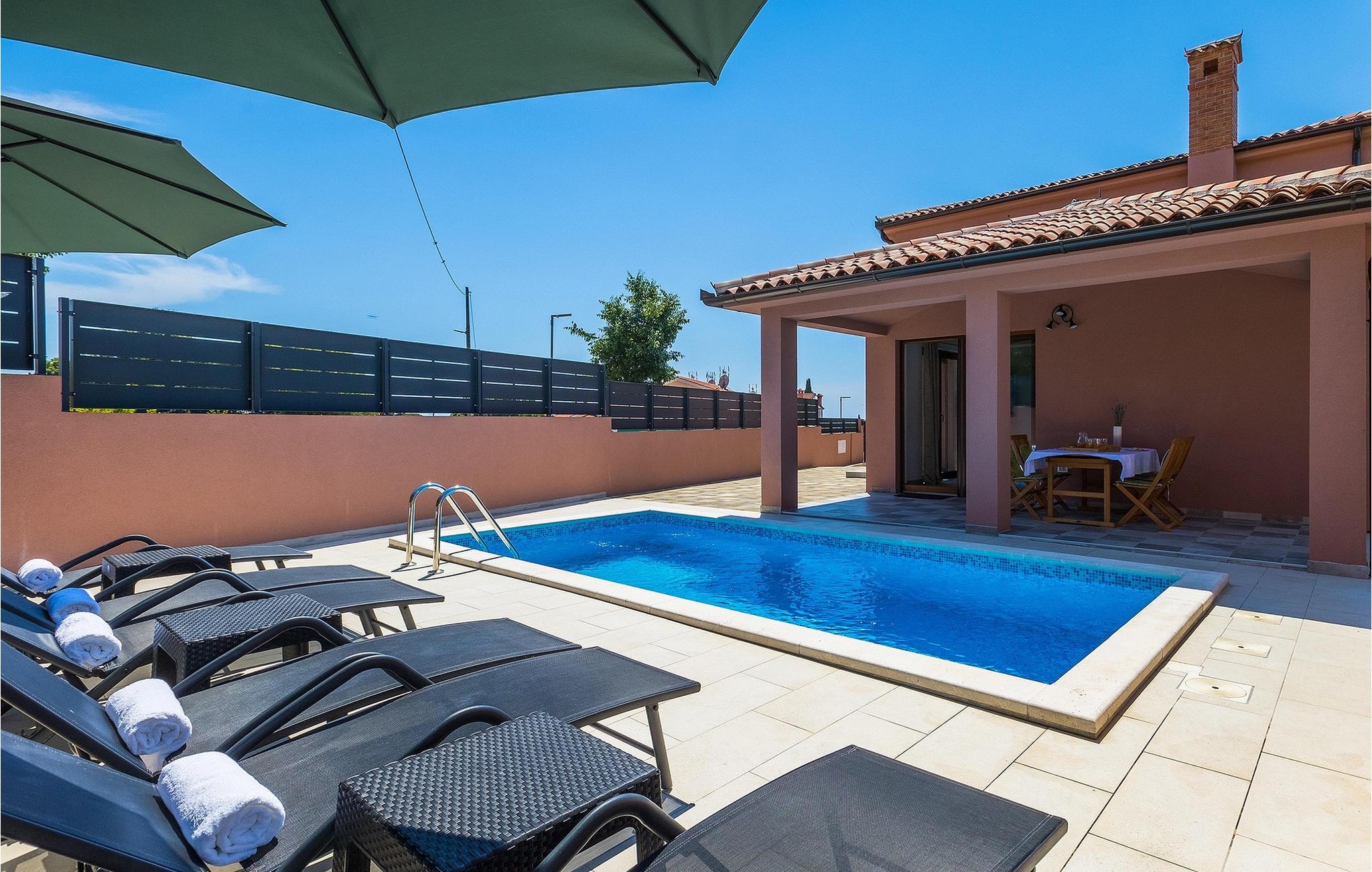 Denne dejlige 3-værelses villa ligger i et lille sted Peroj, ikke engang en kilometer væk fra den nærmeste stenstrand og i nærheden af Pula og dets berømte amfiteater. Det tilbyder overnatning til 6 gæster og har en privat pool til at friske op på solrige dage. Når du træder ind i villaen fra poolsiden og den overdækkede terrasse, finder du et åbent rum opdelt i en stue med SAT-TV, en spiseplads og et veludstyret køkken, der giver alt til at tilberede dine måltider under dit ophold. Hvert soveværelse har en dobbeltseng, tv, aircondition og et ensuite badeværelse, som tilbyder komfort, der gør opholdet meget mere bekvemt og ubekymret. Villaen er helt lukket og har 2 private parkeringspladser.