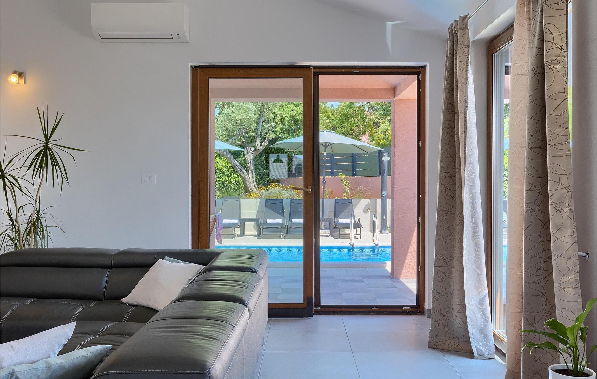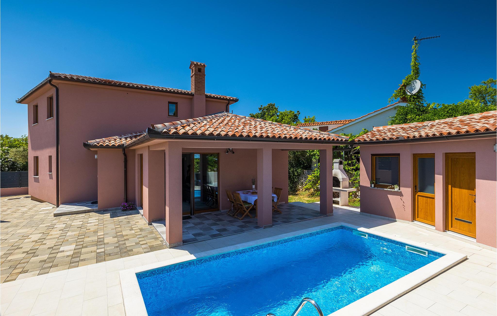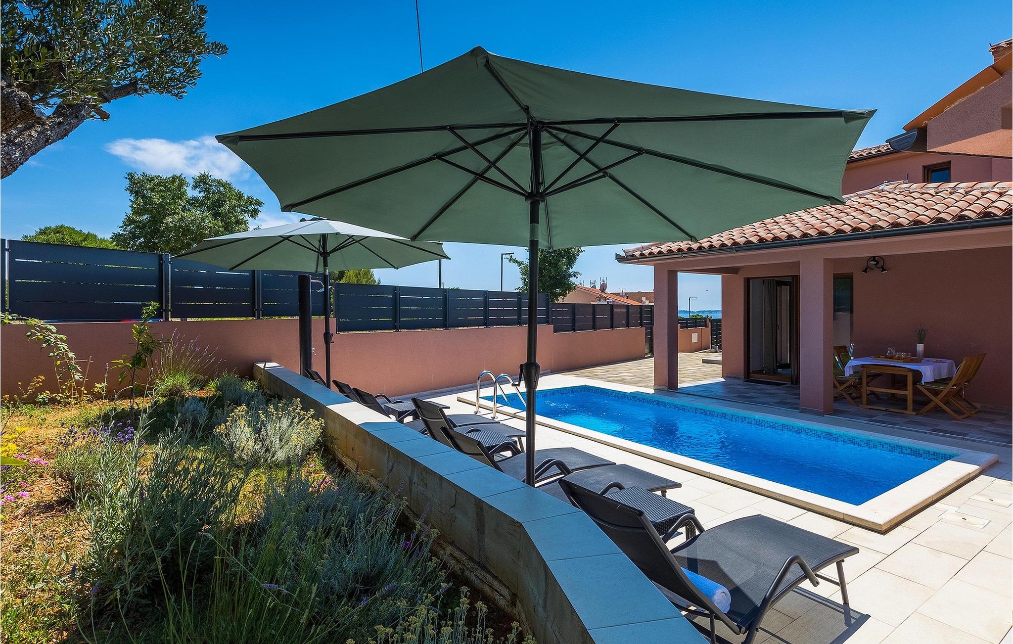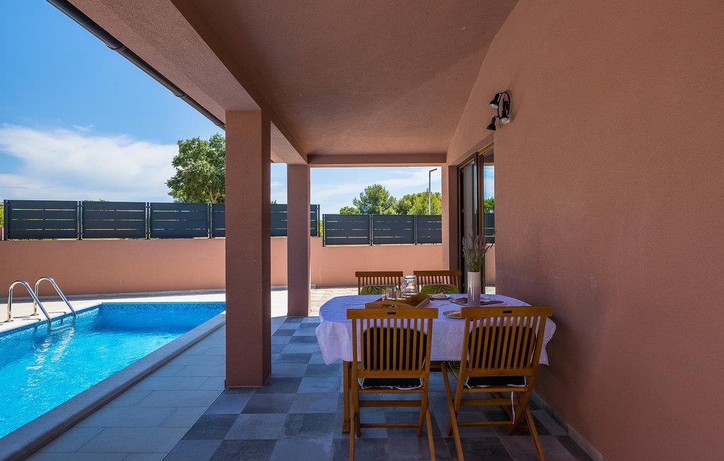 Denne dejlige 3-værelses villa ligger i et lille sted Peroj, ikke engang en kilometer væk fra den nærmeste stenstrand og i nærheden af Pula og dets berømte amfiteater. Det tilbyder overnatning til 6 gæster og har en privat pool til at friske op på solrige dage. Når du træder ind i villaen fra poolsiden og den overdækkede terrasse, finder du et åbent rum opdelt i en stue med SAT-TV, en spiseplads og et veludstyret køkken, der giver alt til at tilberede dine måltider under dit ophold. Hvert soveværelse har en dobbeltseng, tv, aircondition og et ensuite badeværelse, som tilbyder komfort, der gør opholdet meget mere bekvemt og ubekymret. Villaen er helt lukket og har 2 private parkeringspladser.
