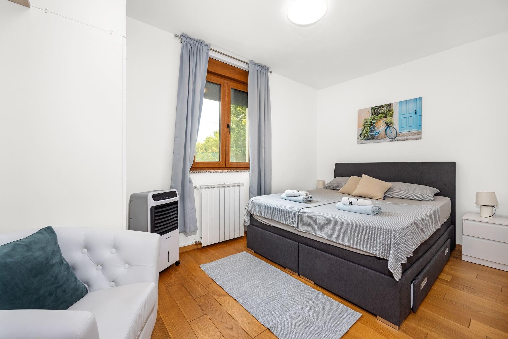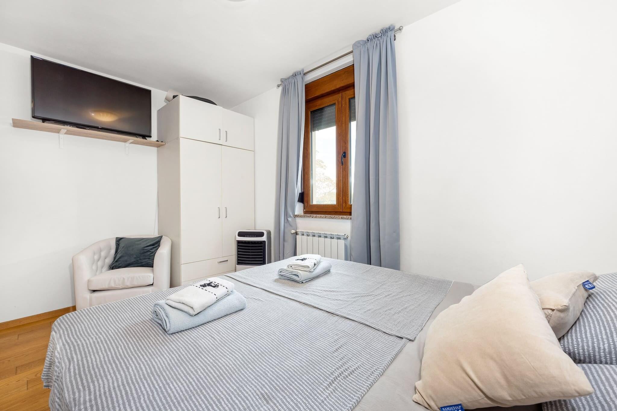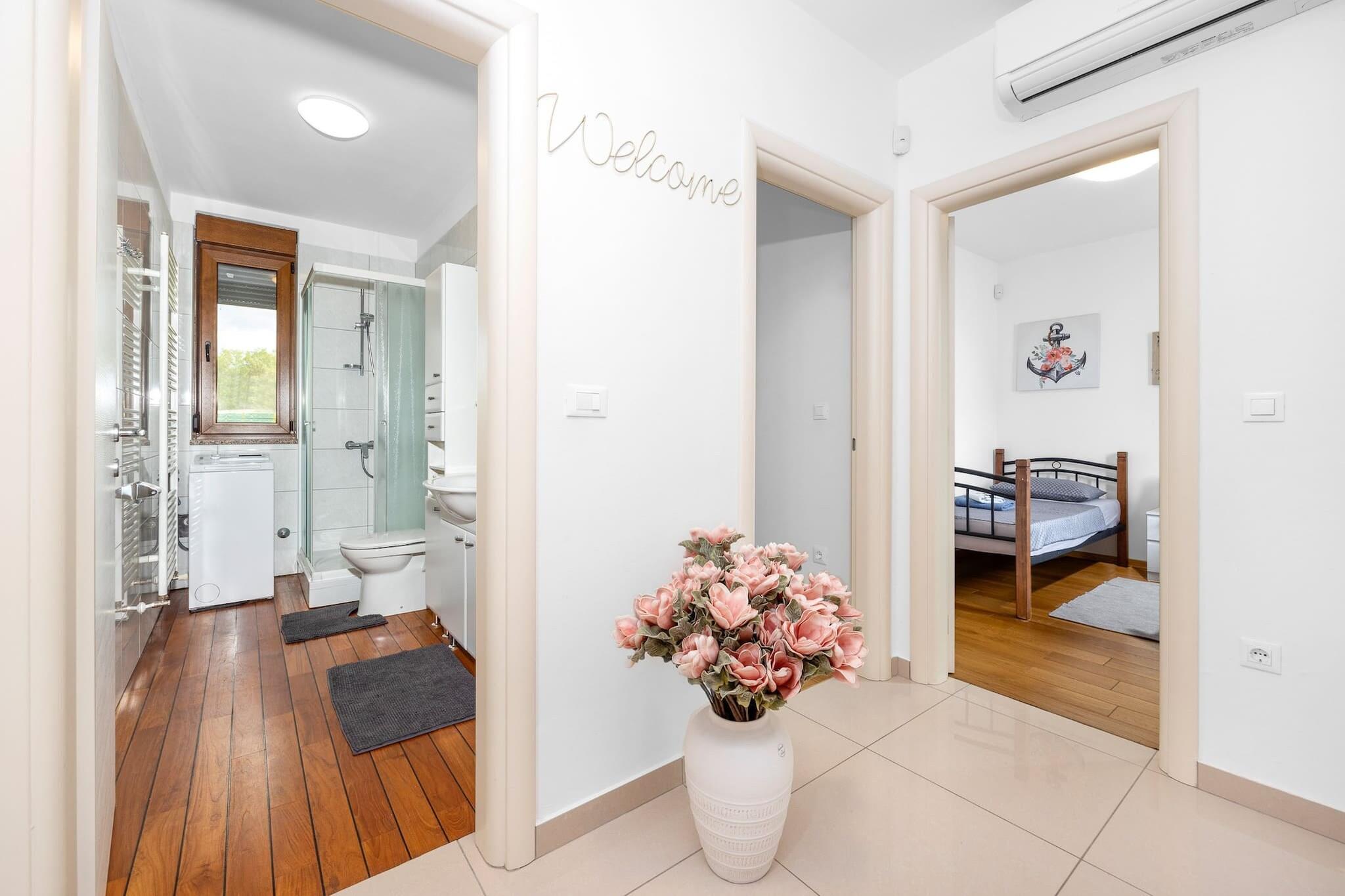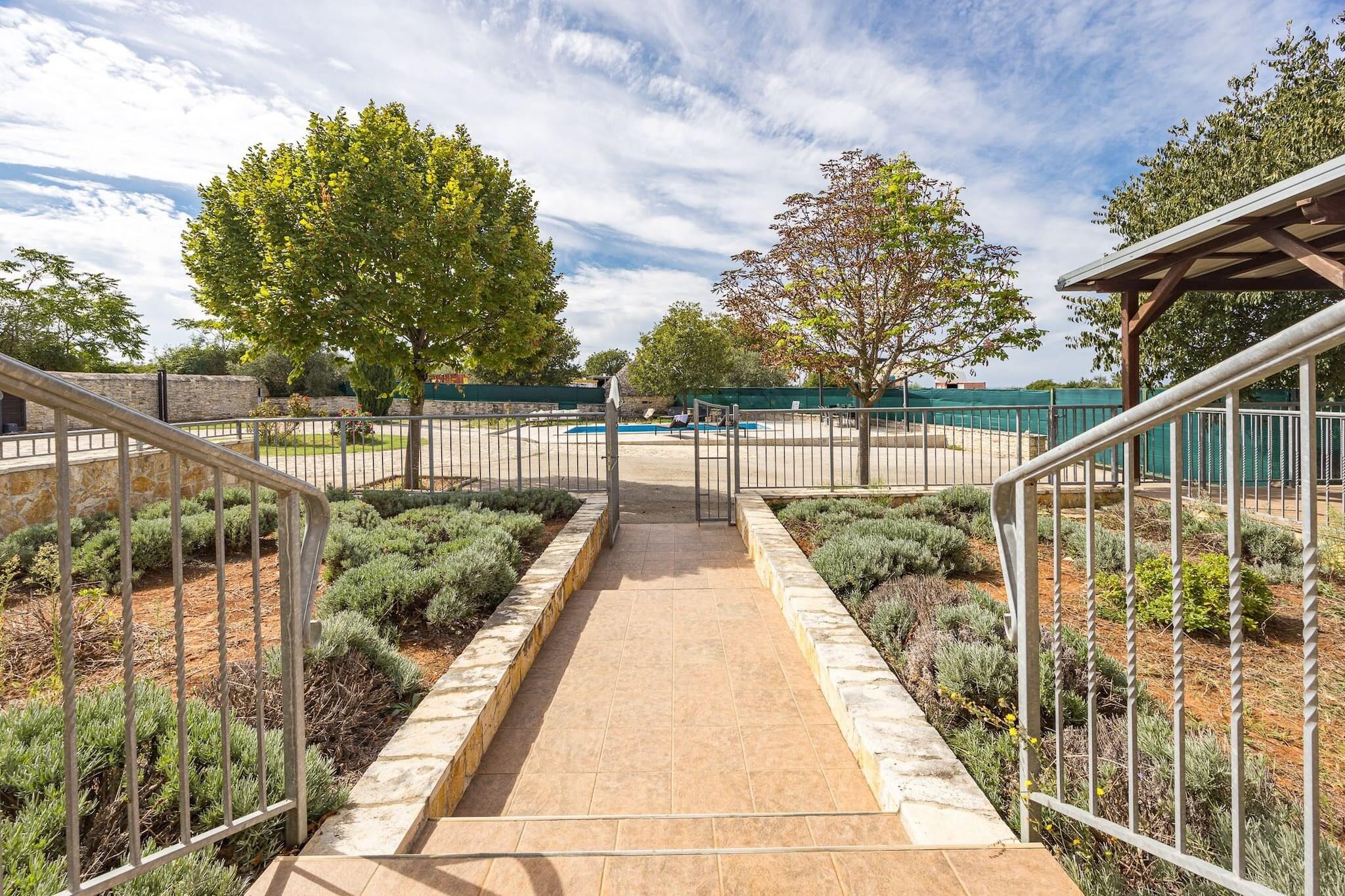 Denne rummelige villa, beliggende i Vodnjan, Istrien, tilbyder et perfekt tilflugtssted for familier eller grupper. Villaen har tre velindrettede soveværelser, to badeværelser og en hyggelig stue forbundet med et fuldt udstyret køkken. Det store soveværelse har et en-suite badeværelse, mens de to andre soveværelser deler adgang til et andet badeværelse. Alle værelser har aircondition for maksimal komfort. Det private udendørs område byder på en swimmingpool, et overdækket spiseområde, hvor gæsterne kan nyde måltider under åben himmel, og en trampolin til børneunderholdning. Der er gratis privat parkering på stedet, og ejendommen er under videoovervågning for ekstra sikkerhed. Vodnjan, en lille by kendt for sin rige kulturarv og olivenolieproduktion, byder på masser at udforske. Besøgende kan vandre gennem den gamle bydel og beundre bygninger fra gotikken, renæssancen og barokperioden. St. Blaz-kirken, der er hjemsted for det højeste klokketårn i Istrien, byder på udsigt over det omkringliggende område. Byen har også et museum i et palads fra det 14. århundrede og viser bevarede hellige relikvier og mumier. Olivenolieentusiaster kan besøge lokale møller og smage autentiske istriske olivenolier. Villaen er bekvemt placeret kun 8 kilometer fra den nærmeste strand i Štinjan, hvilket gør det nemt at nyde både afslapning ved poolen og strandaktiviteter. Gæsterne kan også nyde nærliggende cykelstier eller besøge kulturelle vartegn såsom oliemøllen. For dem, der rejser med fly, er Pula Lufthavn kun 14 kilometer væk, med nem adgang via bil eller offentlig transport, med det nærmeste busstoppested 1,5 kilometer fra ejendommen.