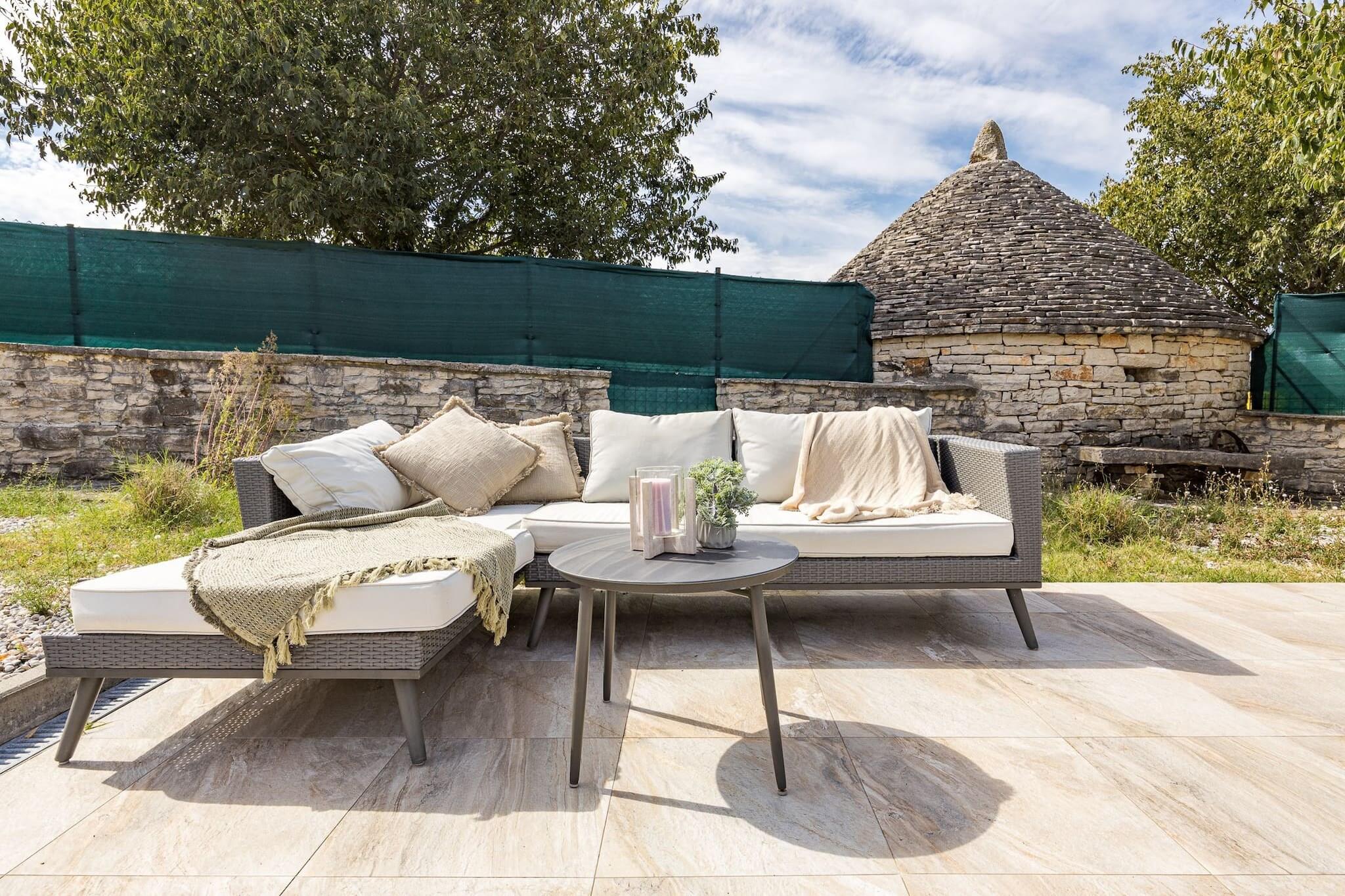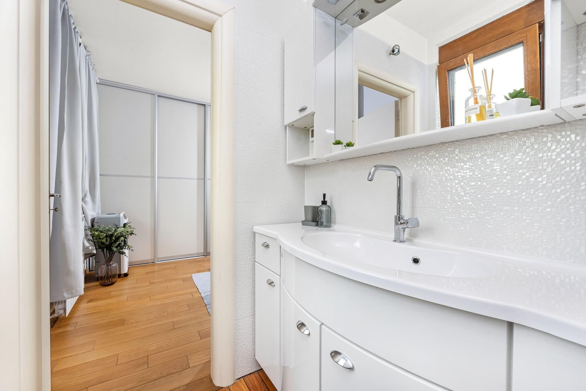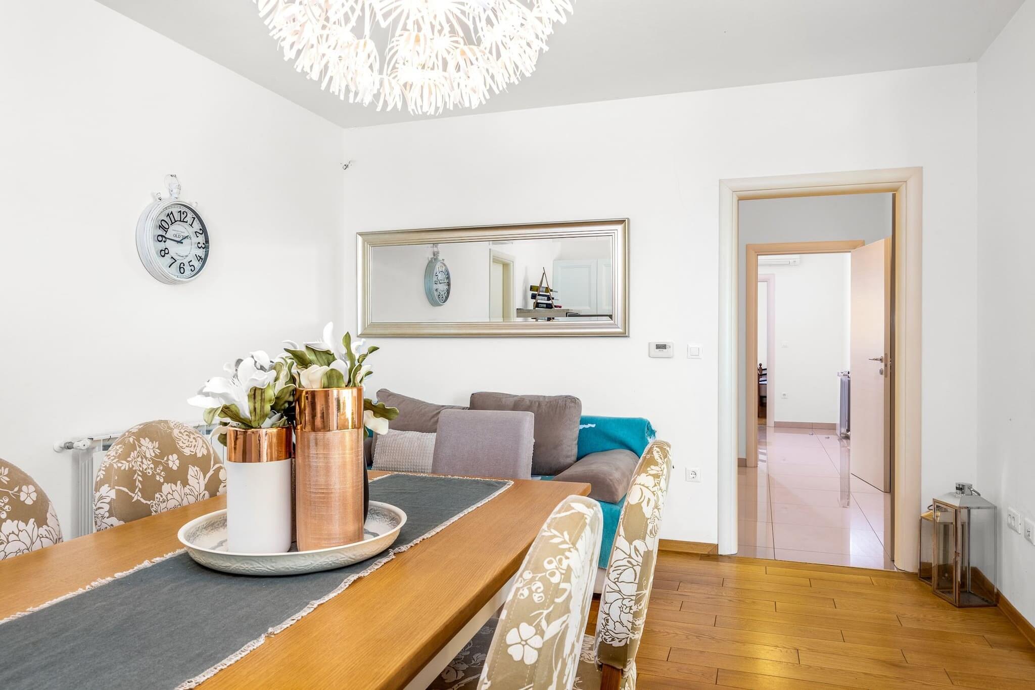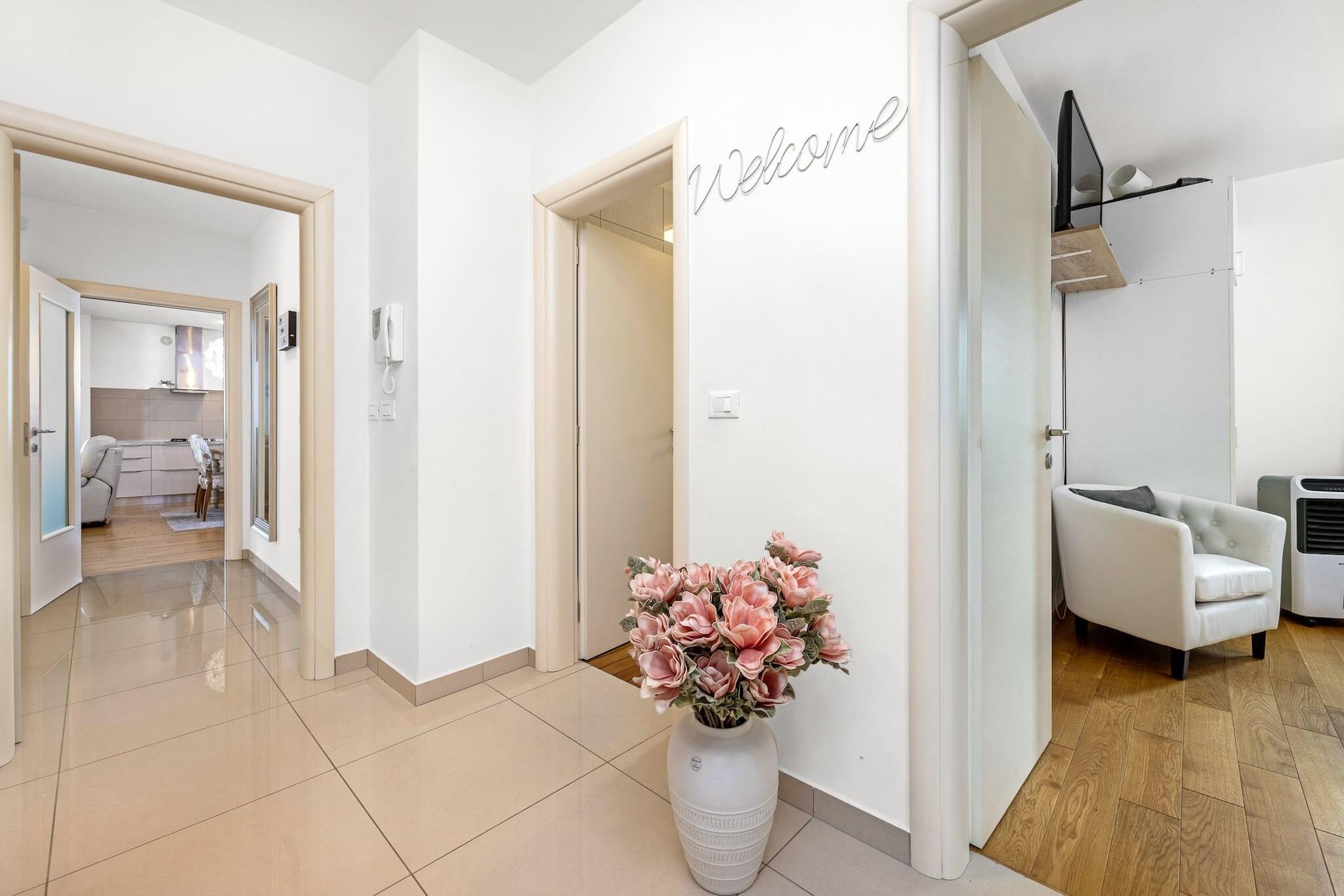 Denne rummelige villa, beliggende i Vodnjan, Istrien, tilbyder et perfekt tilflugtssted for familier eller grupper. Villaen har tre velindrettede soveværelser, to badeværelser og en hyggelig stue forbundet med et fuldt udstyret køkken. Det store soveværelse har et en-suite badeværelse, mens de to andre soveværelser deler adgang til et andet badeværelse. Alle værelser har aircondition for maksimal komfort. Det private udendørs område byder på en swimmingpool, et overdækket spiseområde, hvor gæsterne kan nyde måltider under åben himmel, og en trampolin til børneunderholdning. Der er gratis privat parkering på stedet, og ejendommen er under videoovervågning for ekstra sikkerhed. Vodnjan, en lille by kendt for sin rige kulturarv og olivenolieproduktion, byder på masser at udforske. Besøgende kan vandre gennem den gamle bydel og beundre bygninger fra gotikken, renæssancen og barokperioden. St. Blaz-kirken, der er hjemsted for det højeste klokketårn i Istrien, byder på udsigt over det omkringliggende område. Byen har også et museum i et palads fra det 14. århundrede og viser bevarede hellige relikvier og mumier. Olivenolieentusiaster kan besøge lokale møller og smage autentiske istriske olivenolier. Villaen er bekvemt placeret kun 8 kilometer fra den nærmeste strand i Štinjan, hvilket gør det nemt at nyde både afslapning ved poolen og strandaktiviteter. Gæsterne kan også nyde nærliggende cykelstier eller besøge kulturelle vartegn såsom oliemøllen. For dem, der rejser med fly, er Pula Lufthavn kun 14 kilometer væk, med nem adgang via bil eller offentlig transport, med det nærmeste busstoppested 1,5 kilometer fra ejendommen.