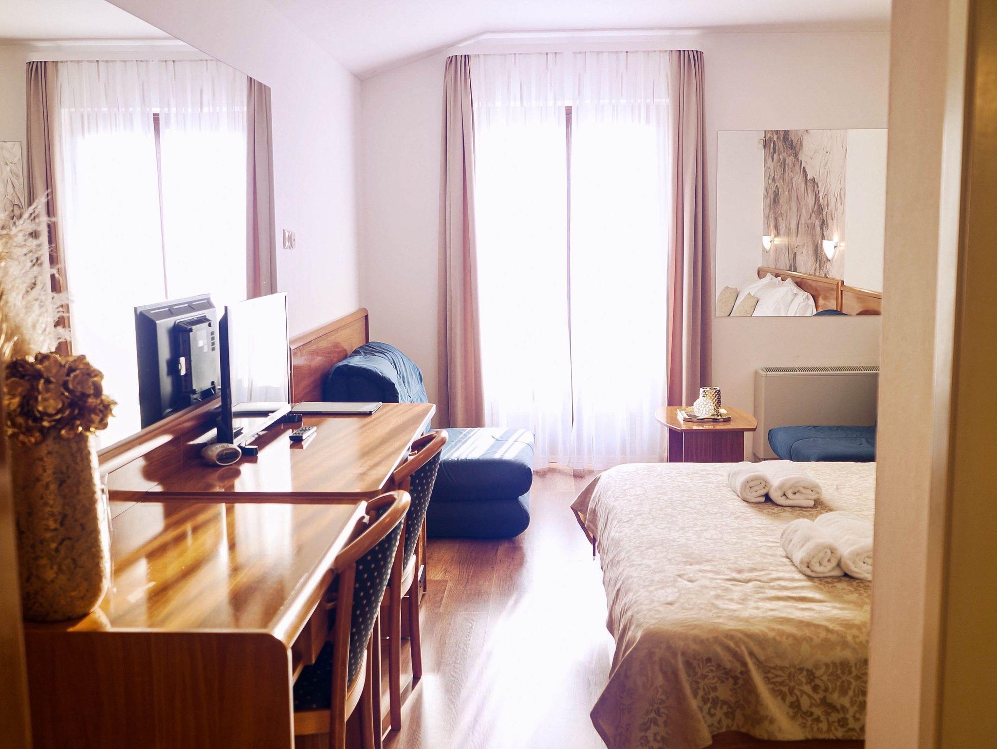 Zimmer bietet Platz für 2 Gäste. Die Betten sind in Schlafzimmern, die es 1 gibt, innerhalb einer Gesamtfläche von 25m2, angeordnet. Die Gäste haben einen eigenen Balkon zur Verfügung, auf der sie in warmen Sommernächten genießen können. Während ihres Aufenthalts können Gäste das gemeinsam zur Nutzung stehende Schwimmbad benutzen. In der Unterkunftseinheit besteht die Möglichkeit des Mitbringens von Haustieren gegen Aufpreis. Die reservierte Unterkunftseinheit ist ein Zimmer mit eigenem Badezimmer ohne die Möglichkeit der Nutzung einer Küche. IM PREIS INBEGRIFFEN: Endreinigung, Klimatisierung, Pool, Parkplatz, Internet, Föhn, Sonnenschirm. VERBINDLICHE ZUSÄTZLICHE KOSTEN: Kurtaxe (Erwachsene 0,93 € - 1,50 € Nacht/Person, Kinderermäßigung 12 - 17 Jahre). UNVERBINDLICHE ZUSÄTZLICHE KOSTEN: Halbpension (30,00 €, 50% Nachlass für Kinder zwischen 4 und 12 Jahren, Kinder bis 4 Jahre sind frei.), Vollpension (60,00 €, 50% Nachlass für Kinder zwischen 4 und 12 Jahren, Kinder bis 4 Jahre sind frei.), Haustiere (30,00 € pro Nacht), Fahrrad (20,00 € täglich (pro Stück)). Die Verfügbarkeit zusätzlicher Dienstleistungen in Ihrem reservierten Termin und die Preise derselben (falls nicht aufgeführt) müssen im Voraus überprüft werden. Zusätzliche Dienstleistungen die in der Zahlungsaufforderung nicht aufgeführt sind werden direkt beim Vermieter bezahlt, angenommen der Gast nutzt auch diese. Ermäßigung auf den Grundpreis: Gratistag 14=13 (bei einem Aufenthalt von 14 Tagen oder mehr erhalten Sie einen Gratistag für den Aufenthalt bis 31.12.26).