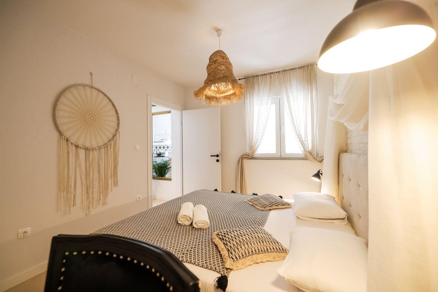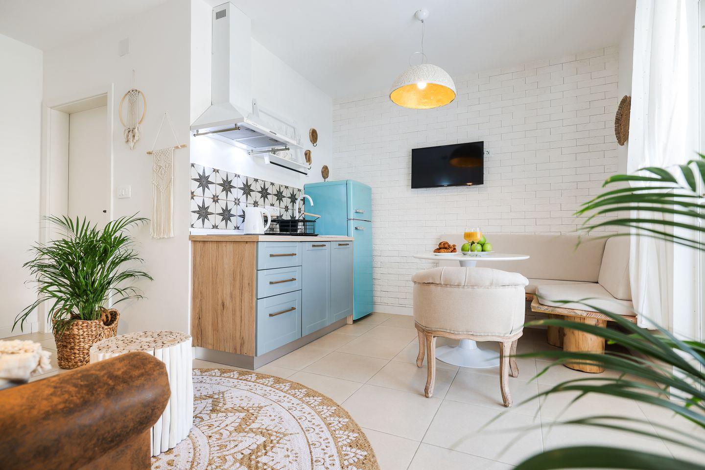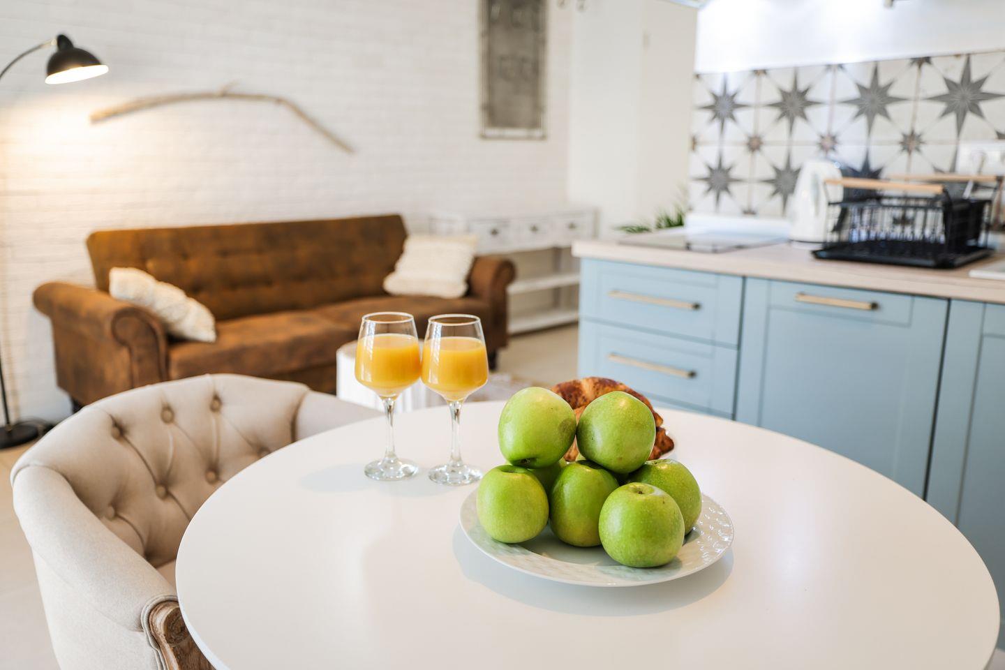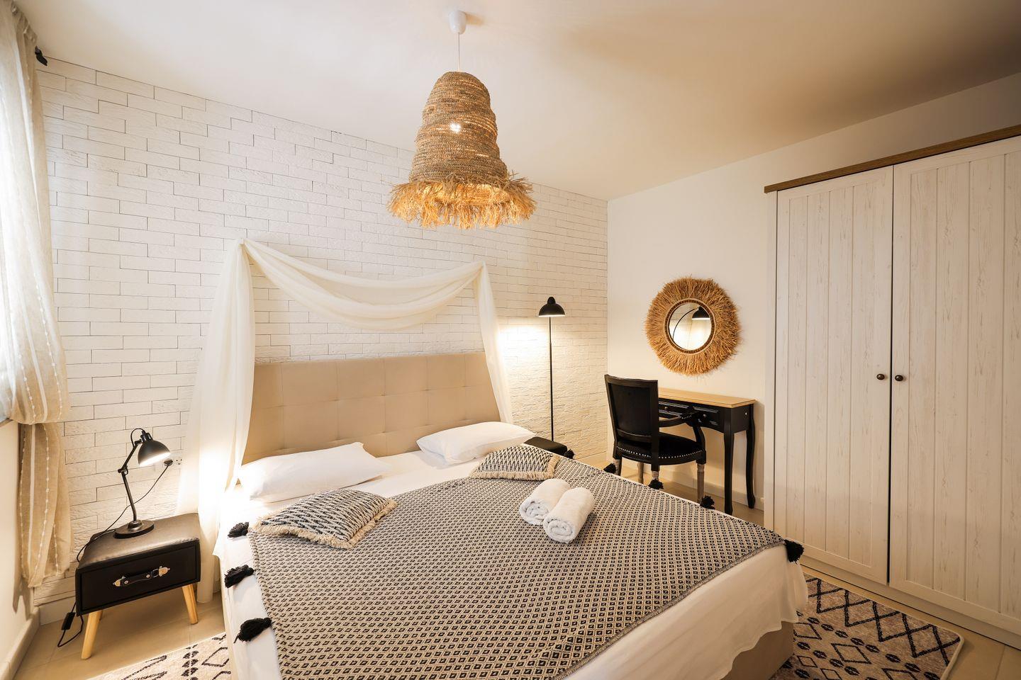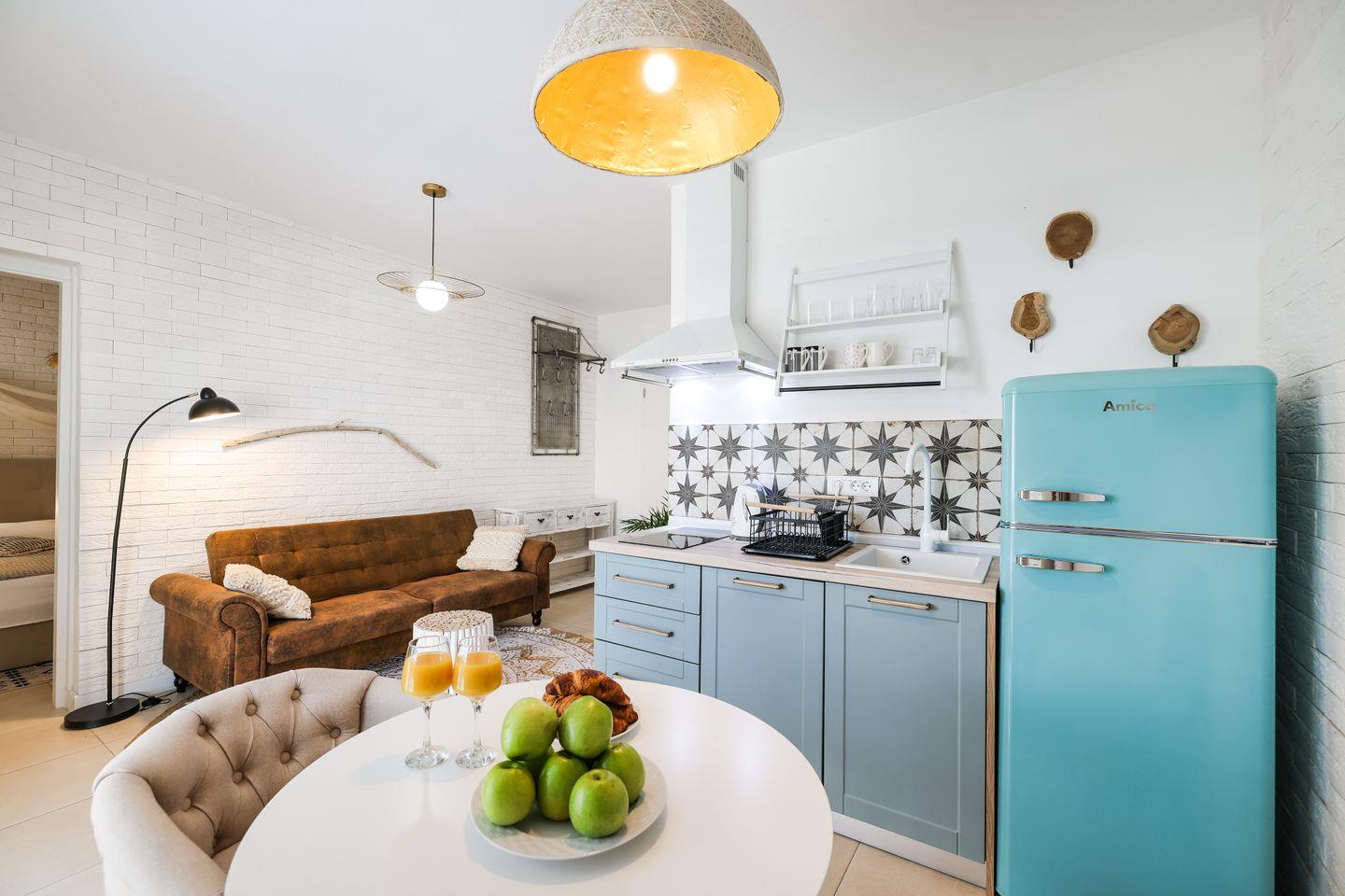 Die Unterkunft befindet sich im ersten Stock und eignet sich ideal für zwei Personen. Der großzügige Wohnbereich ist hell und freundlich gestaltet und kombiniert eine gemütliche Couch mit einem Essbereich, der zum gemeinsamen Verweilen einlädt. Die integrierte Küche ist komplett ausgestattet und ermöglicht es Ihnen, Ihre Mahlzeiten bequem selbst zuzubereiten. Das separate Schlafzimmer ist liebevoll und gemütlich eingerichtet und verfügt über ein komfortables Doppelbett, das für erholsame Nächte in angenehmer Atmosphäre sorgt. Vom Wohnbereich aus gelangen Sie auf den Balkon, der zusätzlichen Raum bietet, um den Tag entspannt mit einem Kaffee oder einem Glas Wein ausklingen zu lassen.