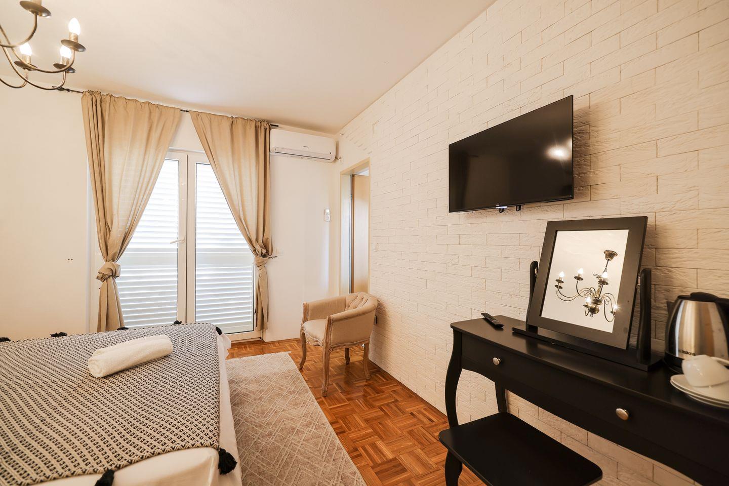 Willkommen in Ihrem gemütlichen Rückzugsort! Auf 19 m² in Erdgeschoss erwartet Sie ein liebevoll eingerichtetes Doppelzimmer mit einem komfortablen Doppelbett, einem geräumigen Schrank, einem bequemen Sessel und einem praktischen Schminktisch – perfekt, um sich ganz wie zu Hause zu fühlen. Starten Sie entspannt in den Tag oder genießen Sie abends die frische Luft auf dem Balkon. Für Ihr Wohlbefinden sorgen kostenloses WLAN, Klimaanlage und TV, sodass Sie jederzeit verbunden und komfortabel unterhalten sind. Das moderne Badezimmer bietet Ihnen mit WC und einer eleganten Walk-in-Dusche alles, was Sie brauchen. Ob für einen erholsamen Urlaub oder eine geschäftliche Reise – hier finden Sie die ideale Kombination aus Komfort und Funktionalität. Wir bitten um Ihr Verständnis, dass Haustiere in diesem Zimmer nicht gestattet sind.