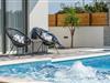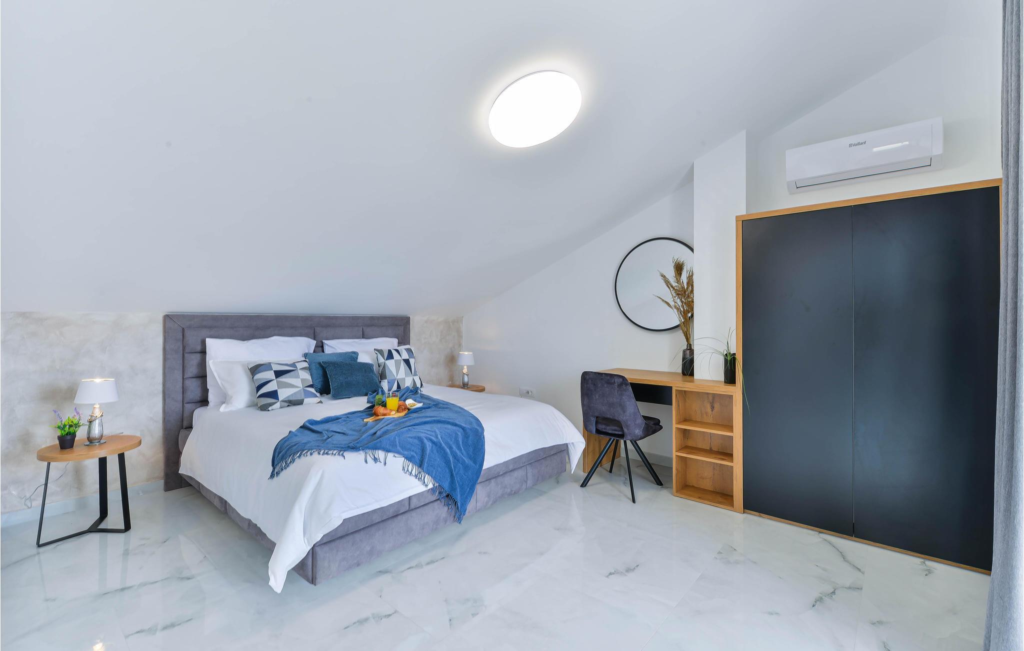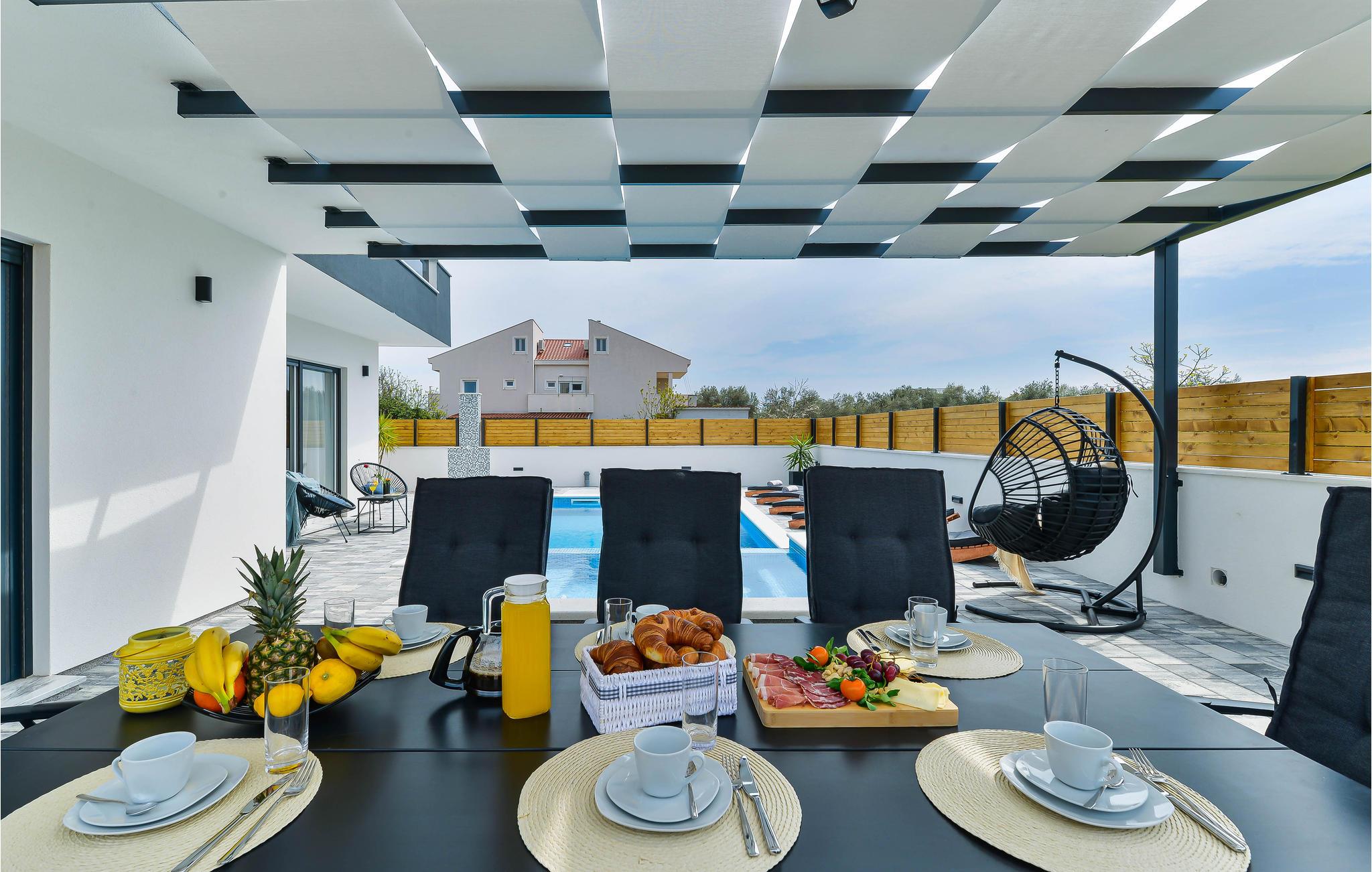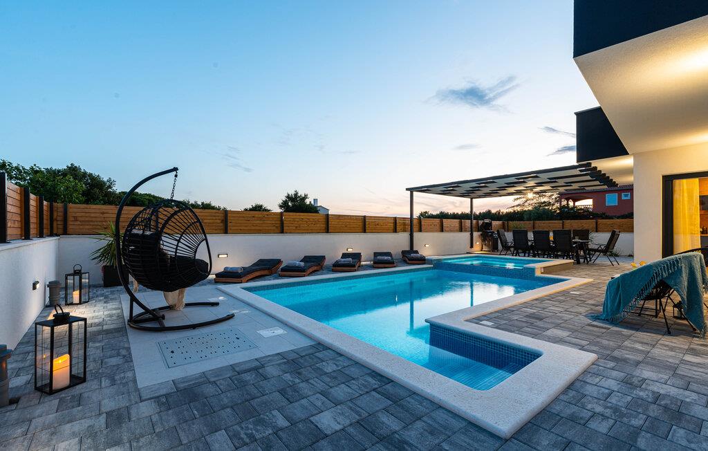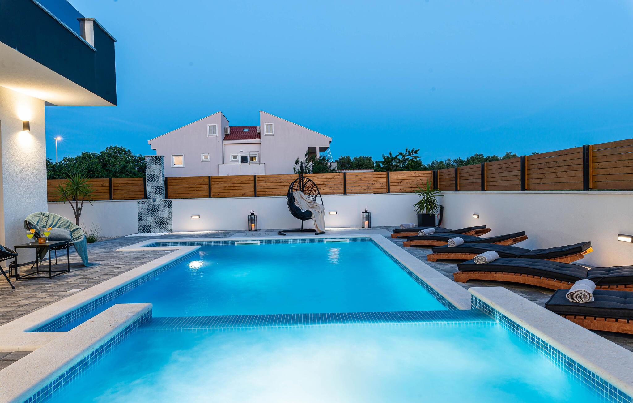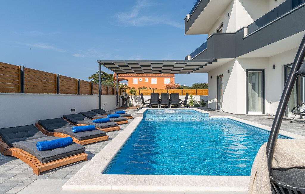 Dette moderne og smagfulde feriehus i Bibinje byder dig velkommen nær stenstranden. Velkommen til dette rummelige og meget veludstyrede hus med høj kvalitets indretning og store værelser. Her kan du se frem til stilfuld og detaljeret indretning, der gør booplevelsen til en uforglemmelig tid. På flere etager, med talrige altaner og en stor terrasse, kan du bruge din tid på at drikke kaffe, læse og lave yoga. Se dine børn plaske i poolen eller hoppe på trampolinen og mødes på den overdækkede terrasse til hyggelige aftener med lækker mad. Kombinationen af stranden og nærheden til kulturmetropolen Zadar, med moderne arkitektur som Havorgelet og Hilsen til Solen og talrige spændende udflugtsmål, gør det lille feriested til et populært rejsemål for hele familien. Lad dine feriedage starte komfortabelt og nyd mange timers svømning, snorkling og solbadning ved havet og vend afslappet tilbage til din hverdag!