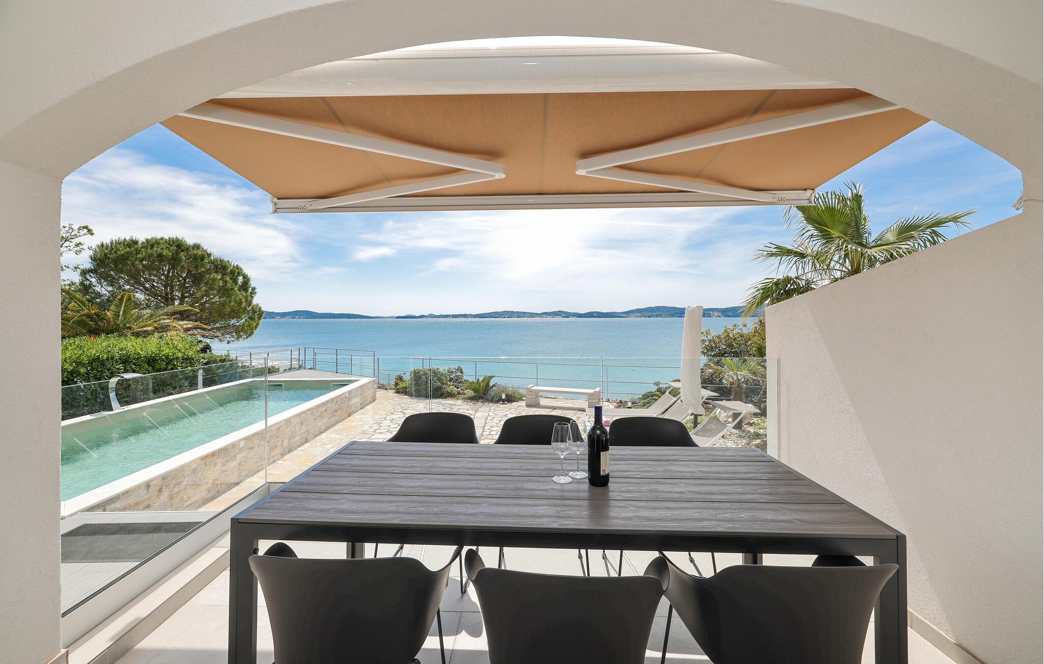 Udendørs finder I også dejlige steder at slappe af i solen. Gør det behageligt med kolde drikke på terrassen, læn jer tilbage i liggestolene efter en opfriskende dukkert i poolen, og nyd det vidunderlige havpanorama.
