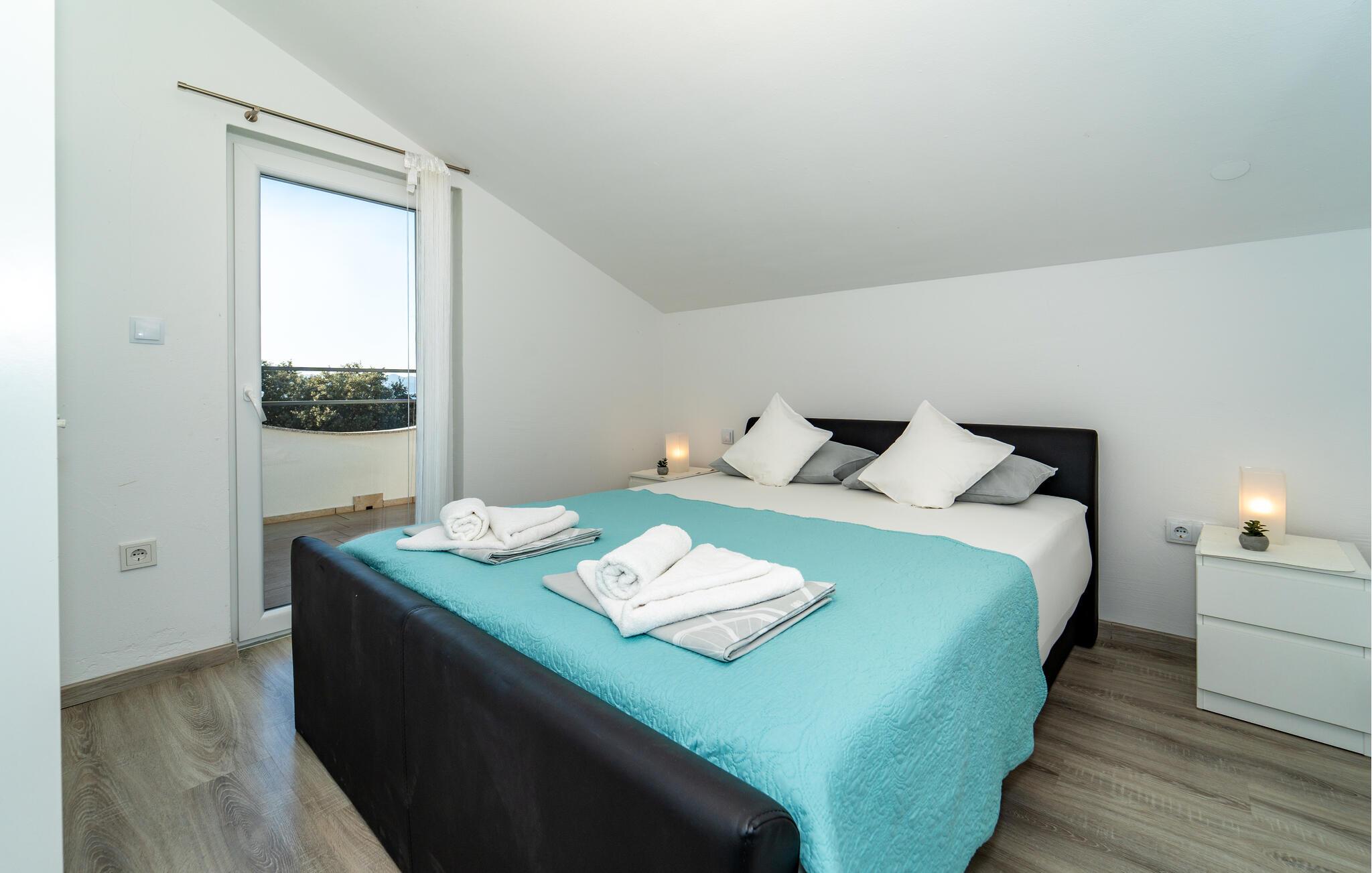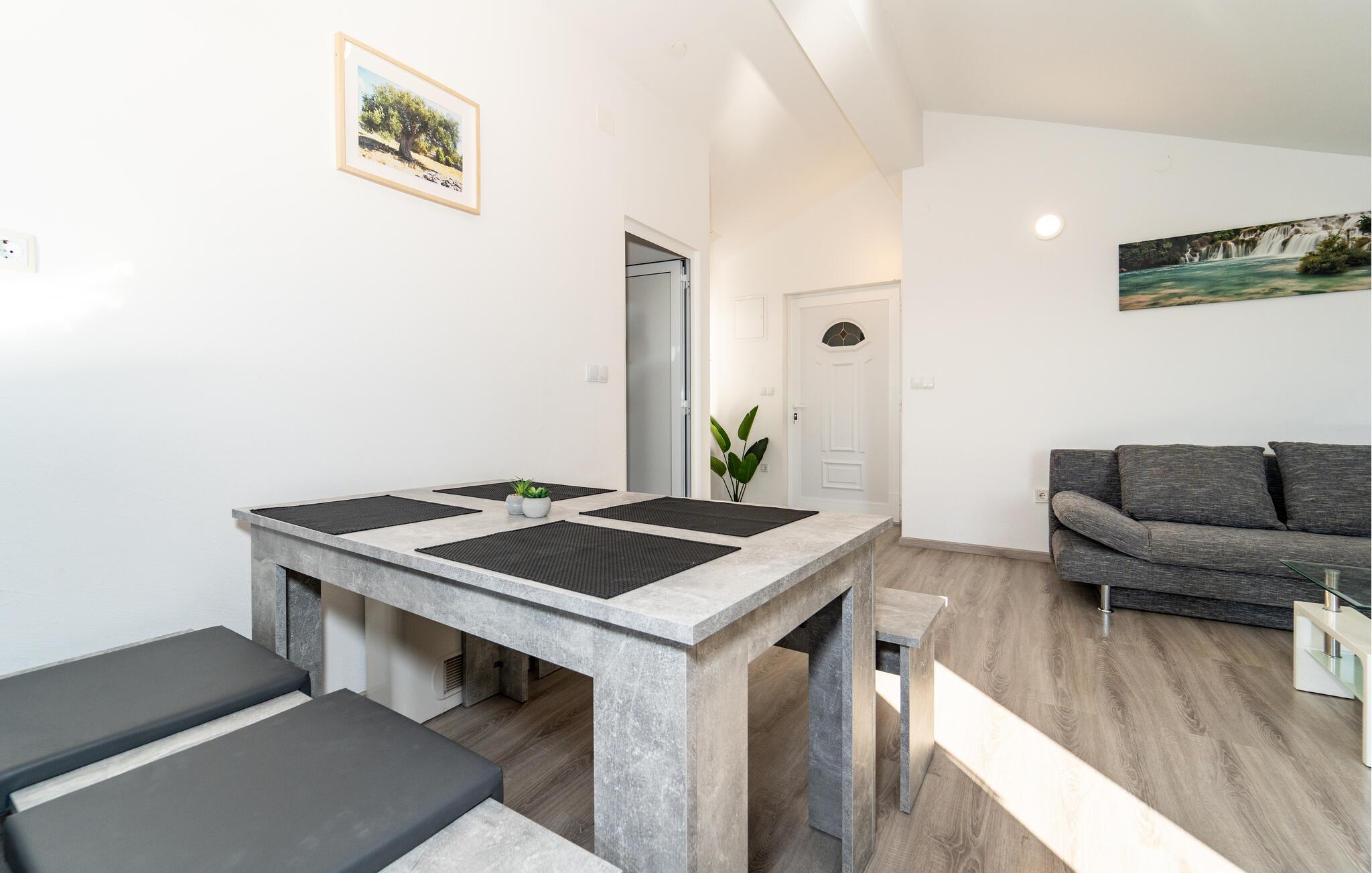 I denne lyse og moderne ferielejlighed midt i den charmerende by Bibinje venter jer en afslappende pause. Nyd den rolige stemning og lad dagen slutte af på balkonen – her kan I finde ro og fra de øverste etager nyde havudsigten. Lejligheden, beliggende i et hus med flere lejligheder, tilbyder alt, hvad I behøver for en behagelig ferie. Rejs med venner eller hele storfamilien, og nyd en fælles ferie uden at gå på kompromis med privatlivet.
