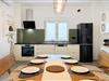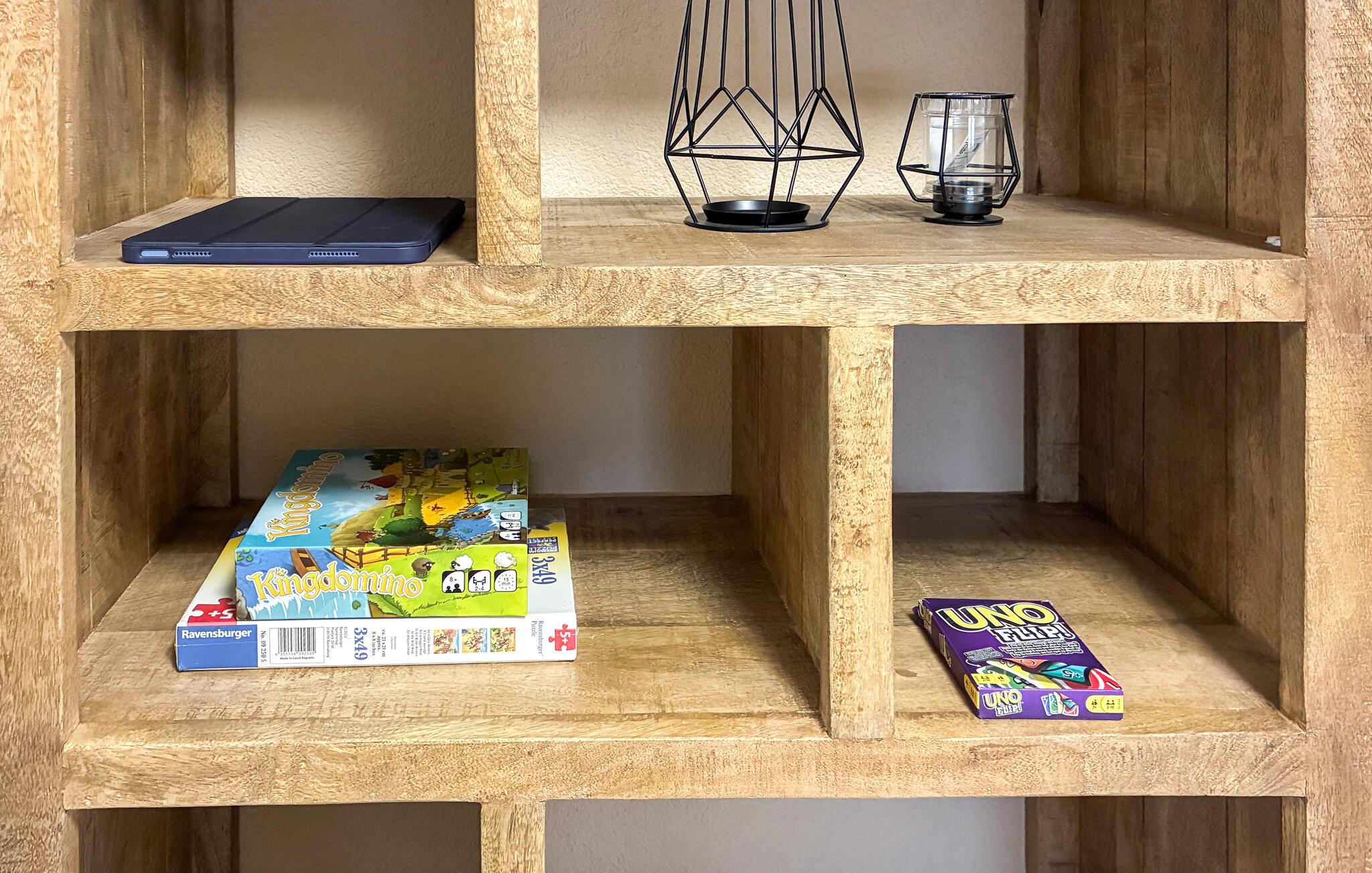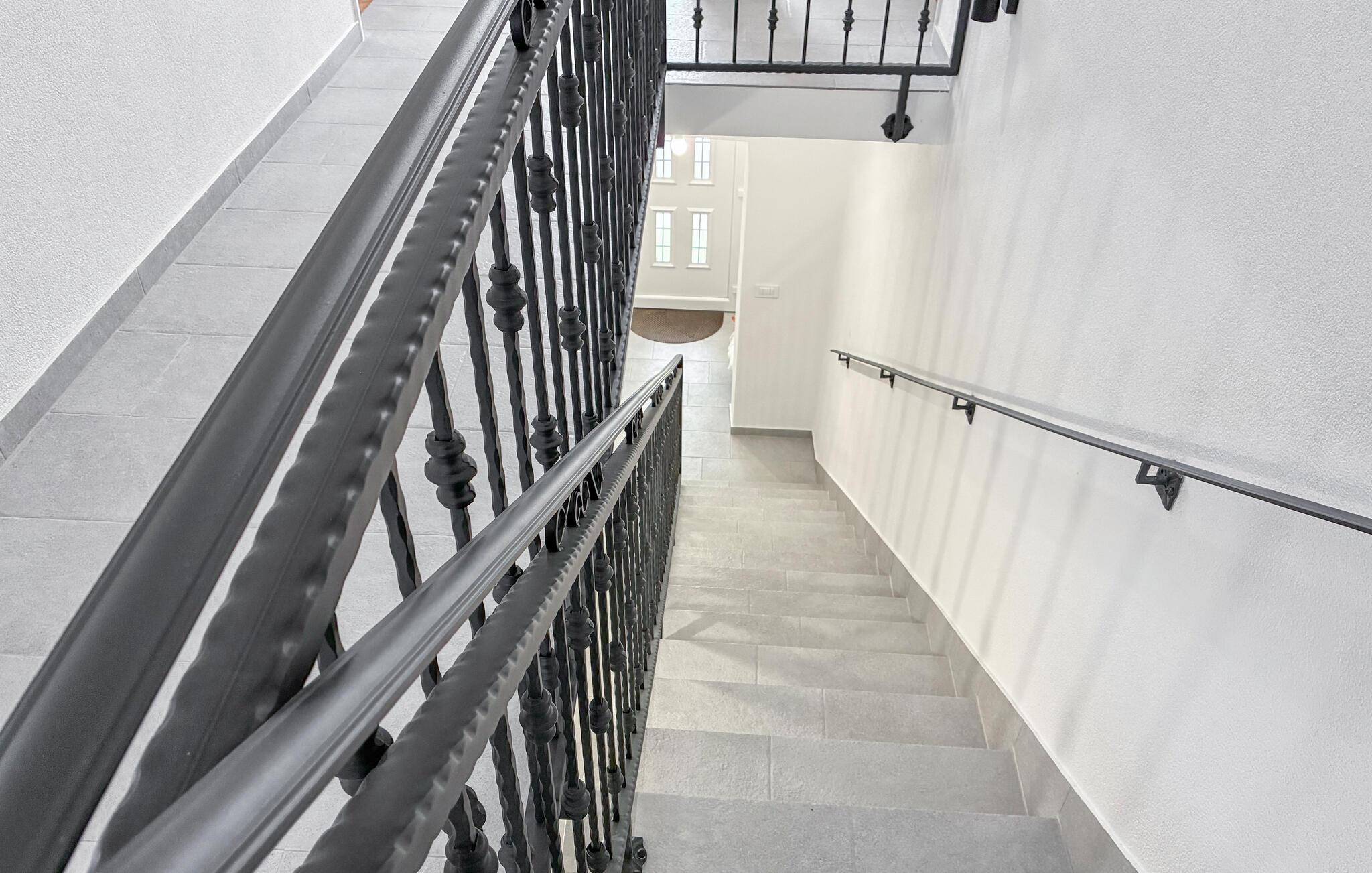 Gør det behageligt i den store sofa i jeres lyse feriehus, og Begynd dagene med en afslappende kop kaffe. Brug den åbne stue med den buede døråbning som forbindelseselement mellem sofaen og spiseområdet. Tag plads ved det runde bord eller saml familien ved det lange træbord i det moderne køkken. Hold jer aktiv, selv på ferien, og træn på motionscyklen eller det tilgængelige fitnessudstyr.