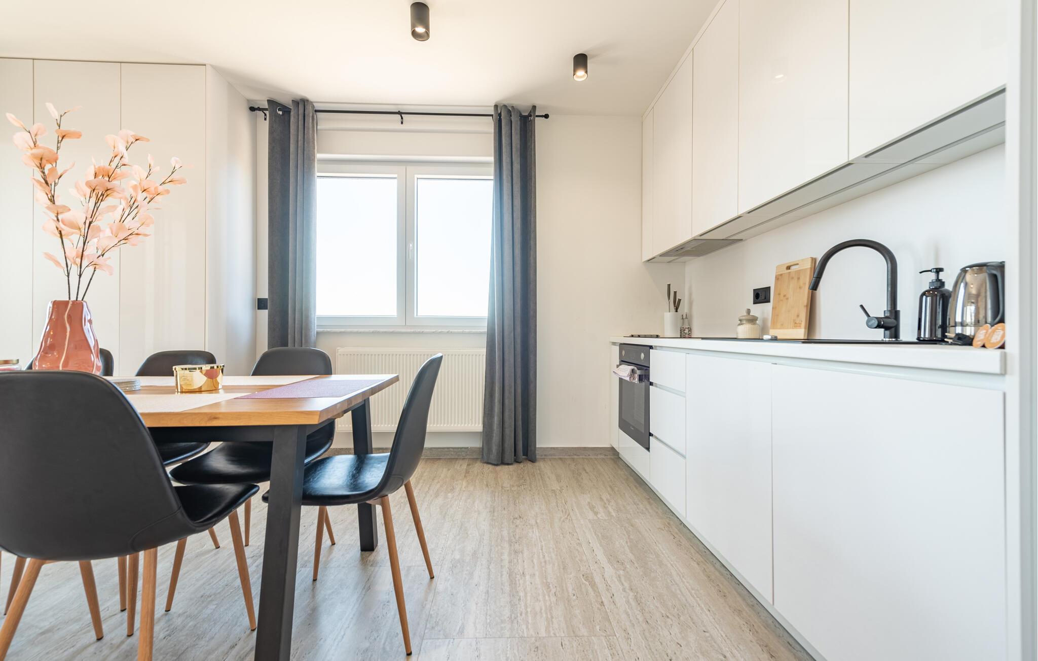 Lejligheden ligger tæt ved stranden og er ideel til en ferie med skønne timer ved havet, som I kan nå på få skridt, samt spændende udflugter i området. De lyse rum og den moderne indretning danner rammerne for samvær og gør det nemt for jer at slappe af. Nøje udvalgt design og lækre kvalitetsmaterialer skaber et miljø, hvor I kan genoplade jeres batterier, og de små pauser bliver en fornøjelse. Begynd dagene med en lækker morgenmad på jeres private terrasse og læg planer for den kommende dag.
