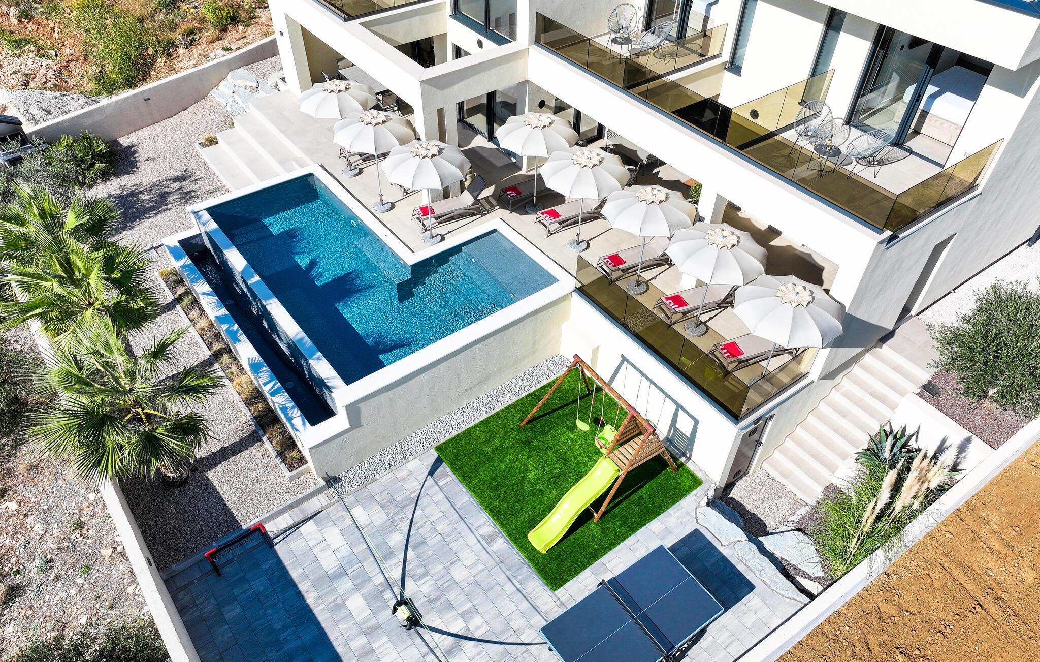 Nyd den gode plads på altanerne eller læn jer tilbage på panoramaterrassen med pool, som byder på en betagende udsigt over området. Den velholdte have med god plads til at spille bold sikrer sjov og underholdning for hele familien.