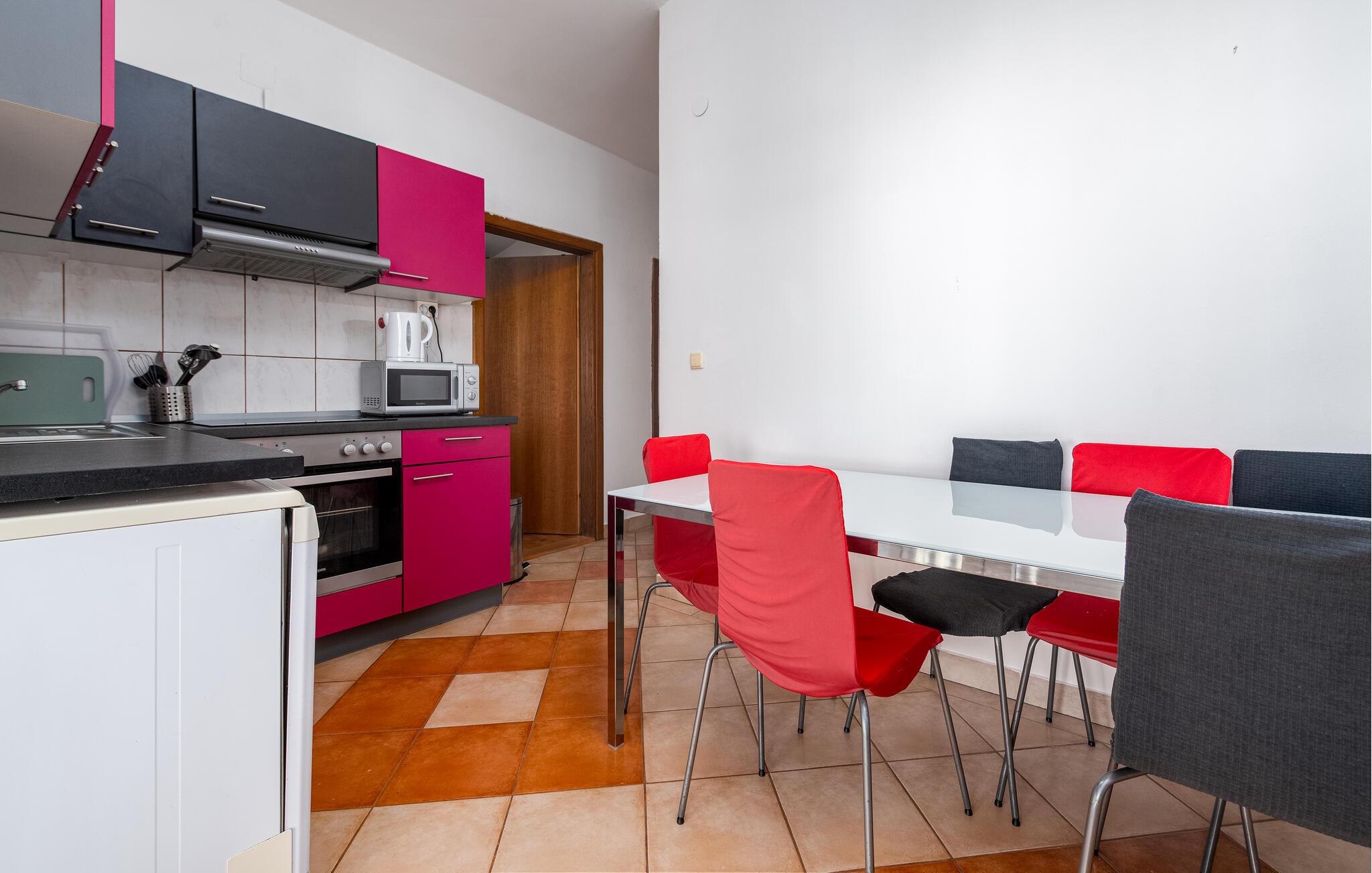 Denne smukt beliggende lejlighed lover en afslappende pause fra hverdagen. En lys stue med en farverig sofa og et praktisk køkken skaber en hyggelig atmosfære, hvor I hurtigt kan slappe af. Tilbring en aften på sofaen, stream en god film eller prøv nye opskrifter sammen i køkkenet.